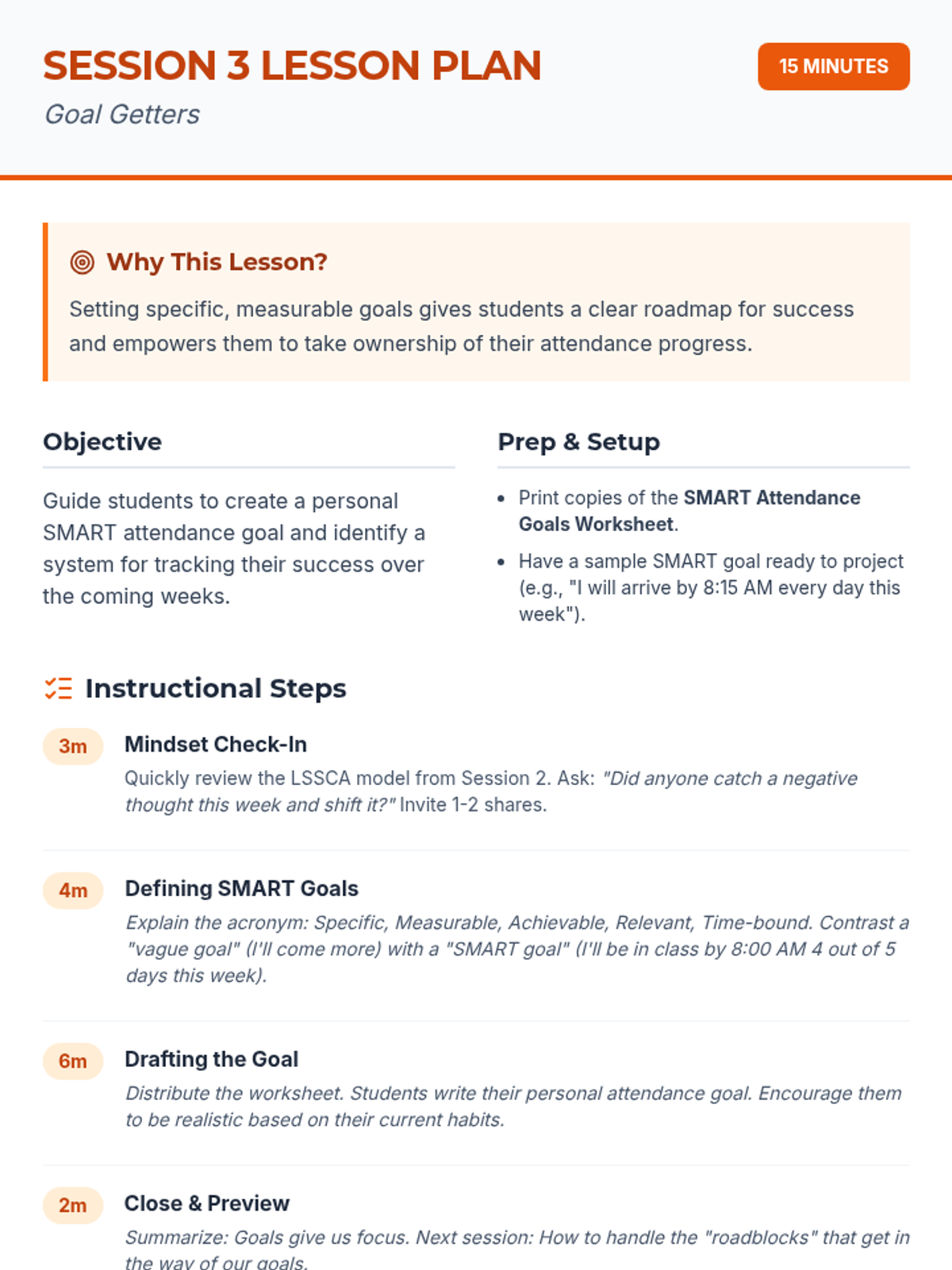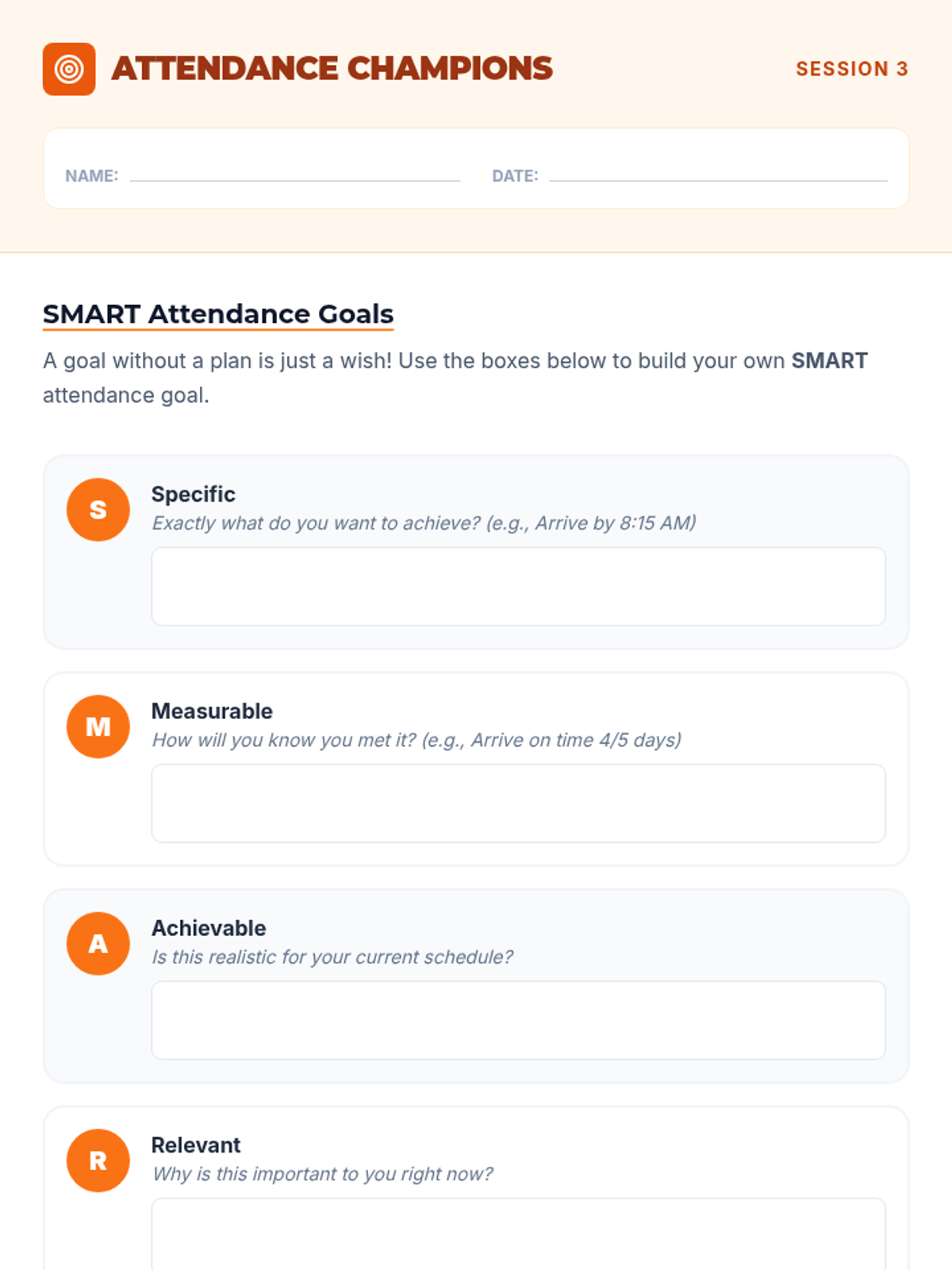 Guides students in setting SMART goals for their school attendance.