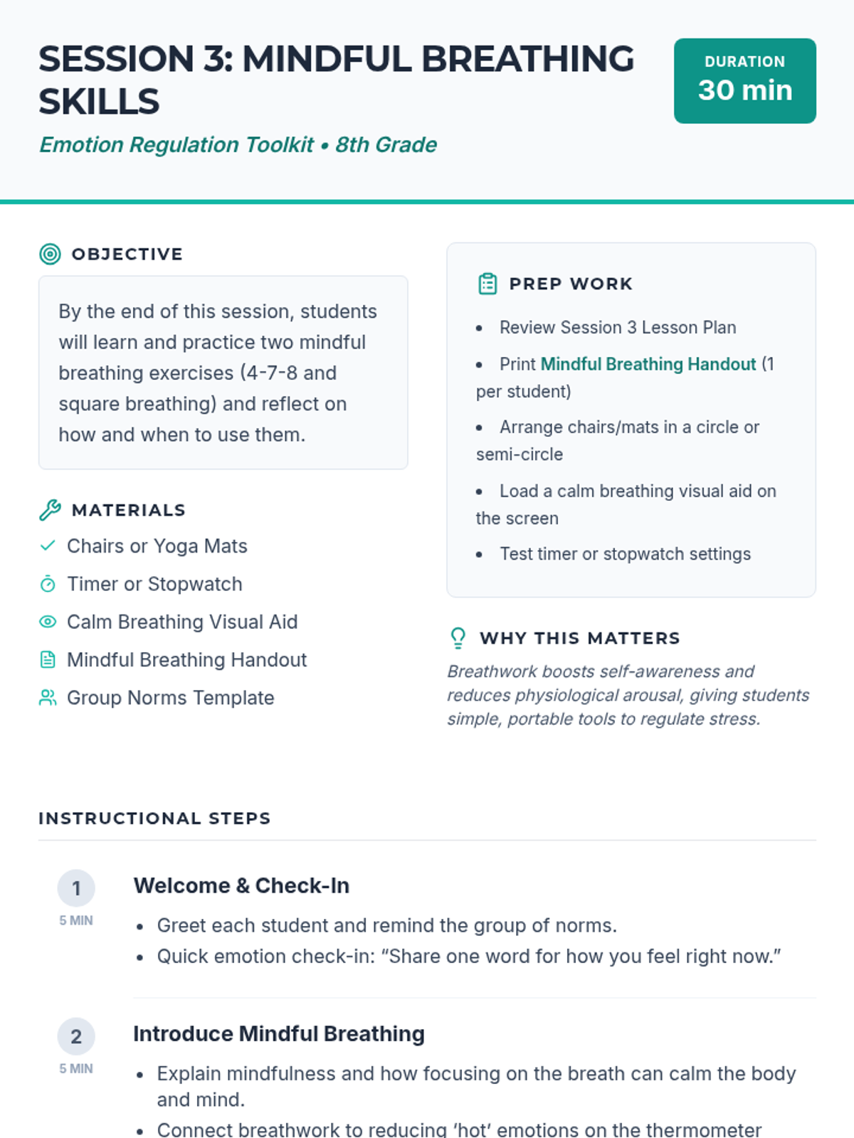 Breathwork boosts self-awareness and reduces physiological arousal, giving students simple, portable tools to regulate stress.