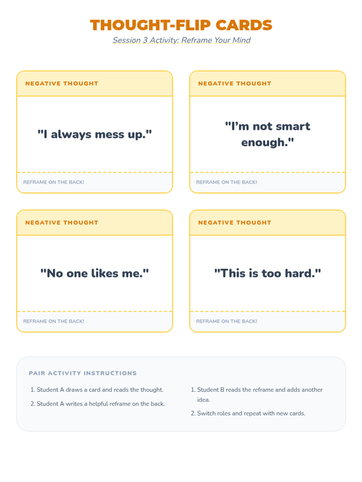 Identifying negative self-talk and practicing reframing unhelpful thoughts into positive alternatives.