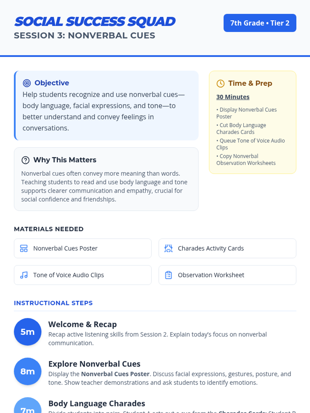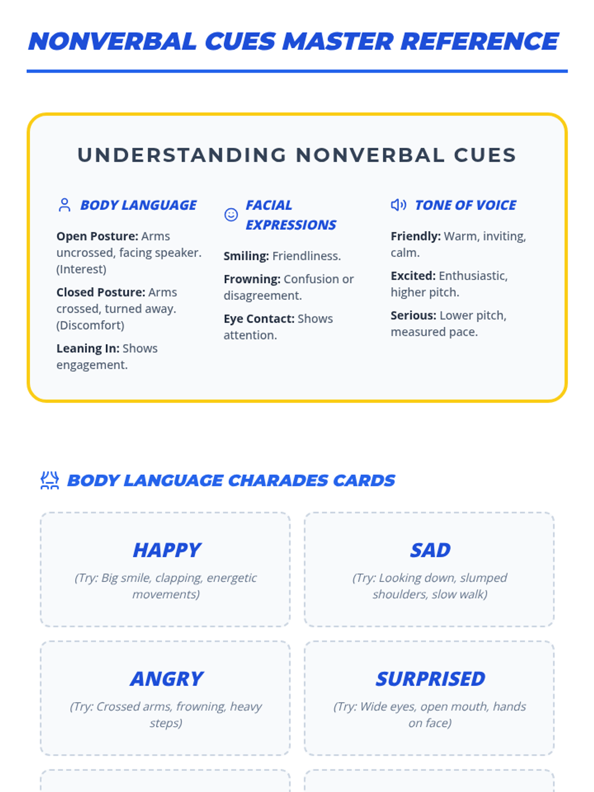 Help students recognize and use nonverbal cues—body language, facial expressions, and tone—to better understand and convey feelings in conversations.