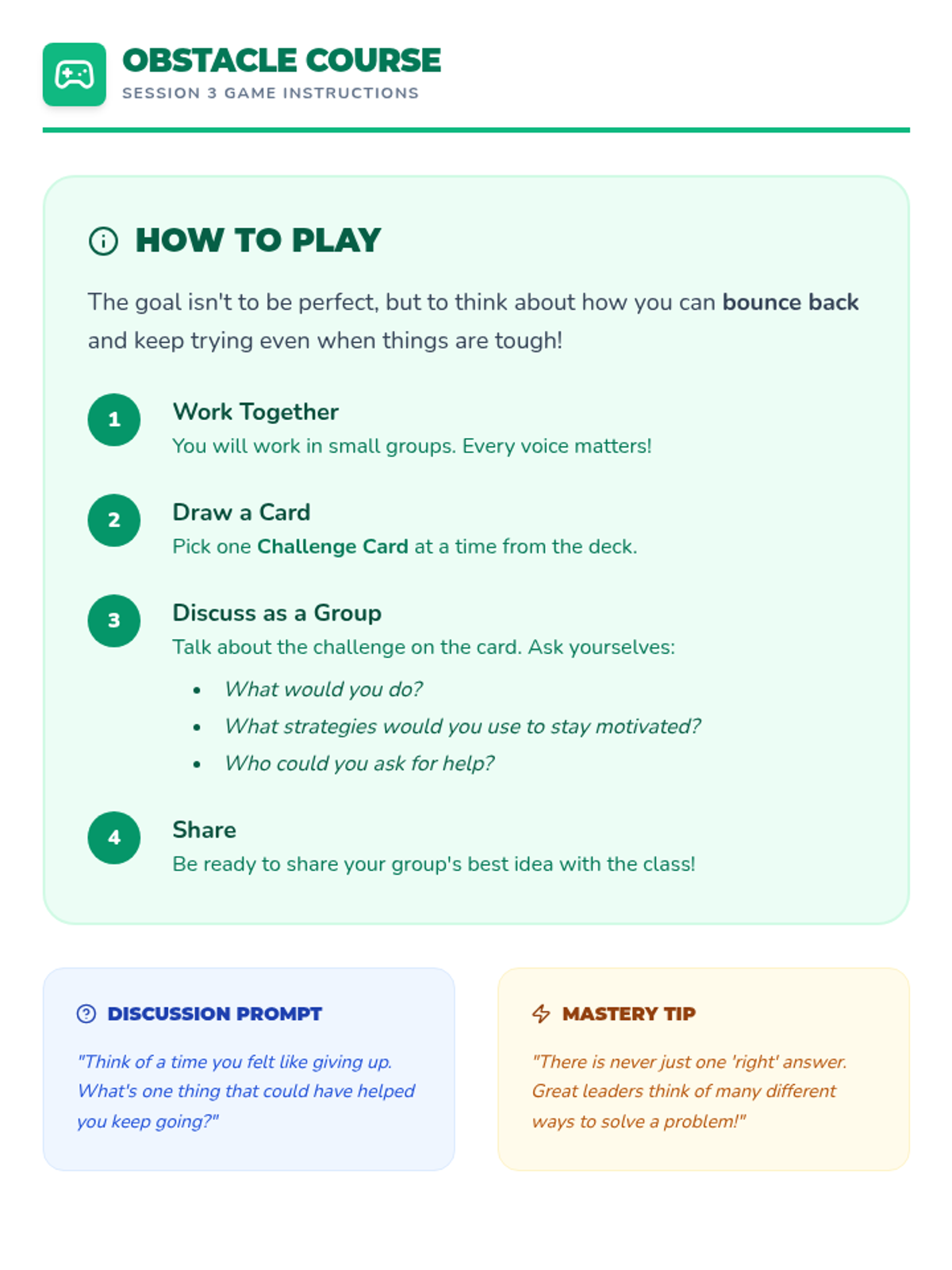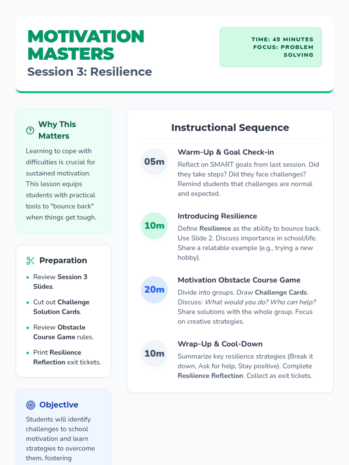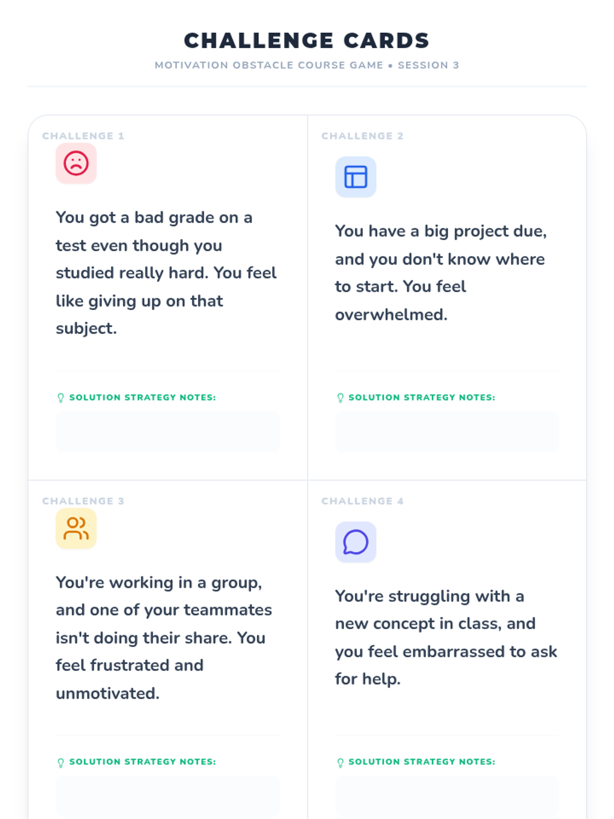 Students identify common challenges to school motivation and learn strategies to overcome them, fostering resilience.