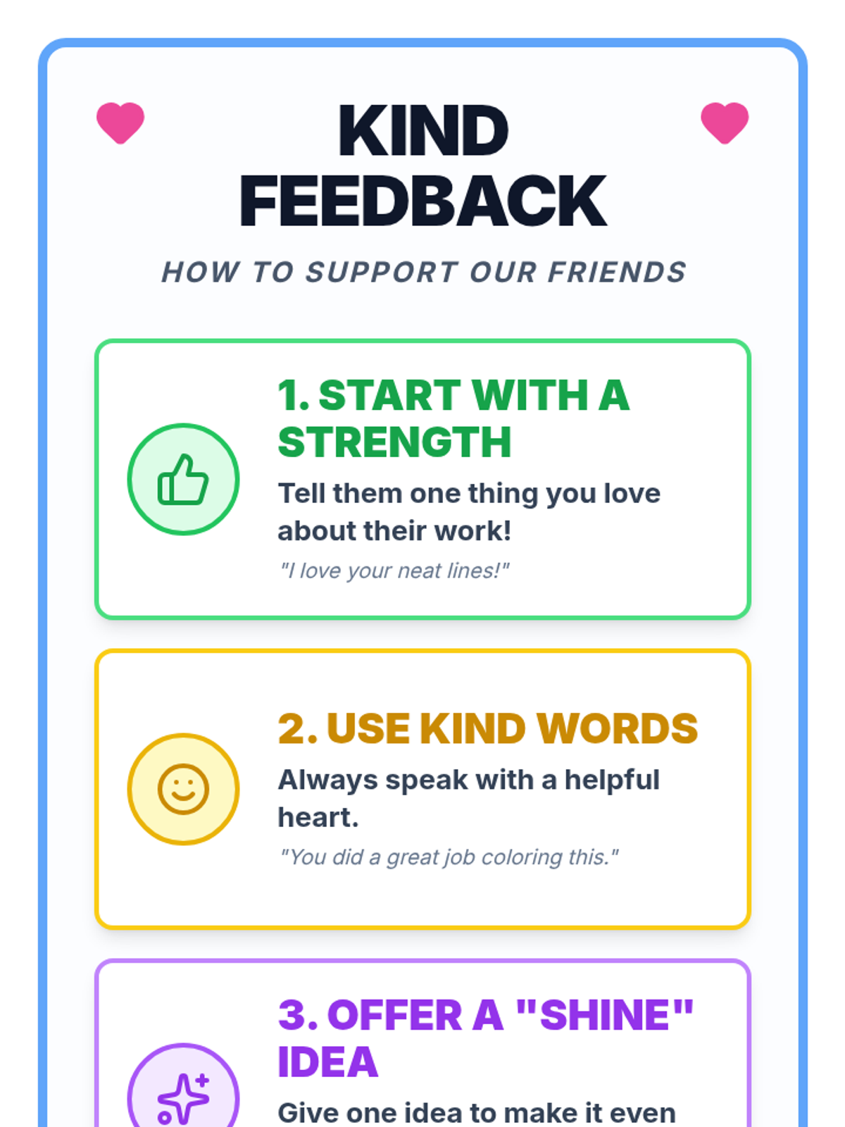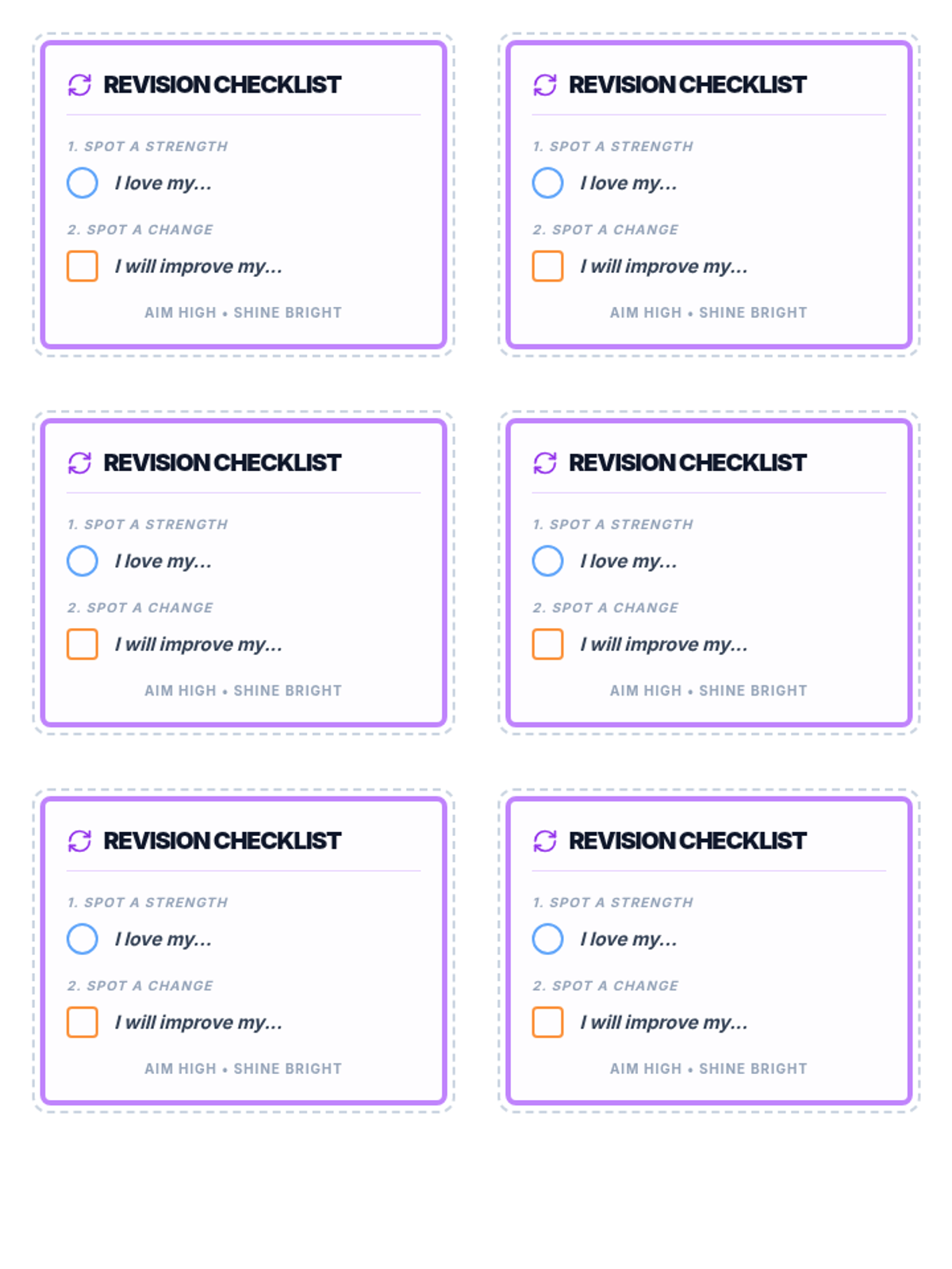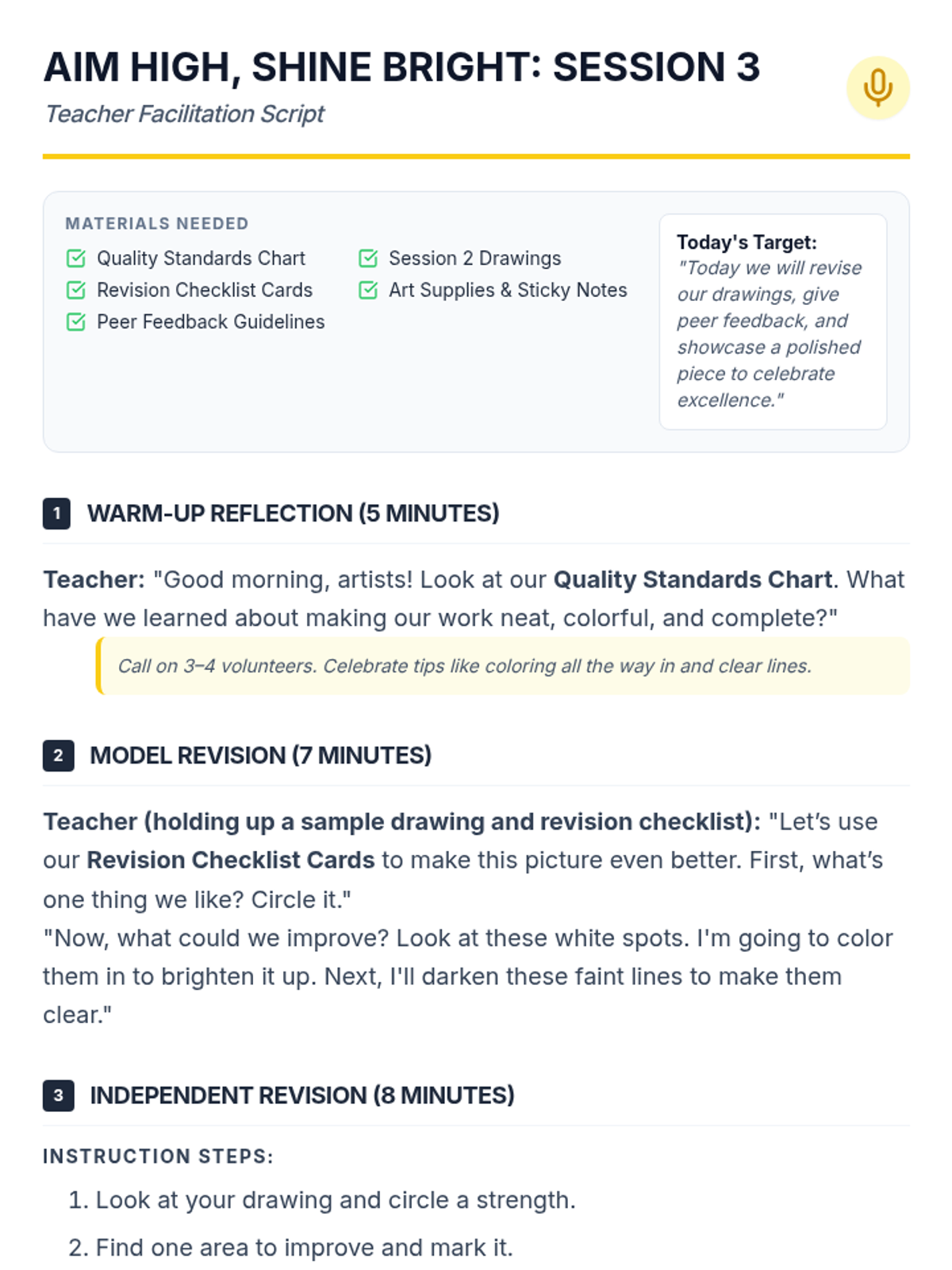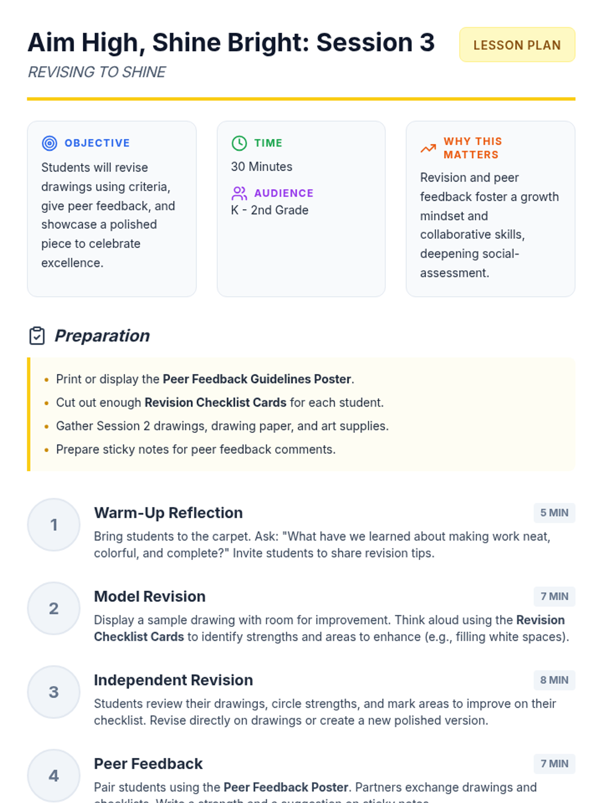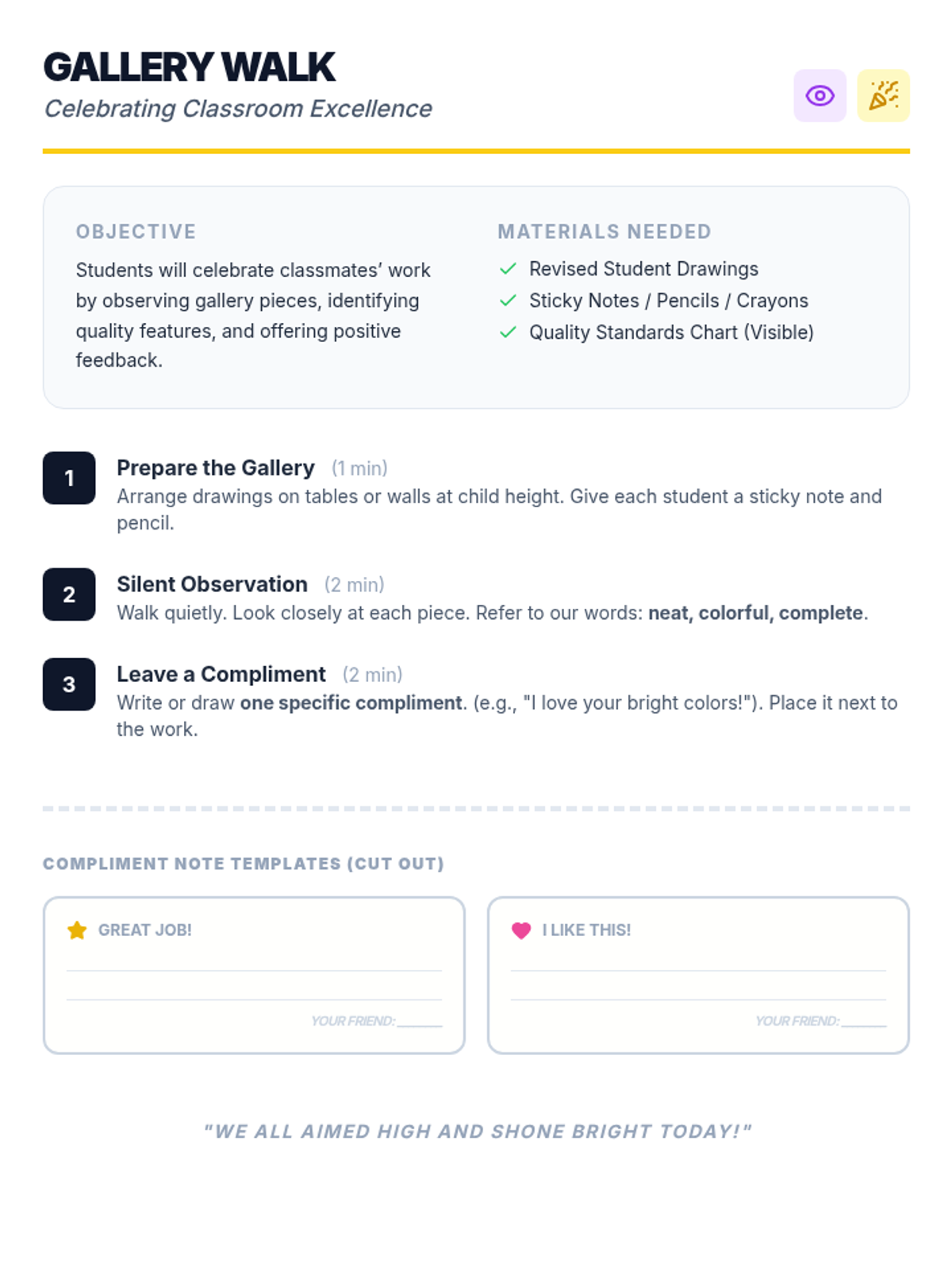 Students revise their work using quality criteria, give and receive peer feedback, and celebrate excellence through a gallery walk.