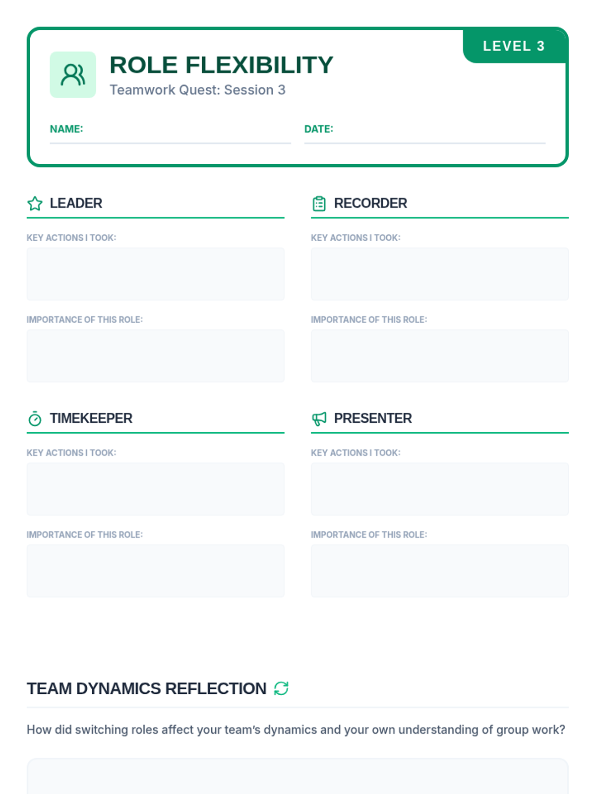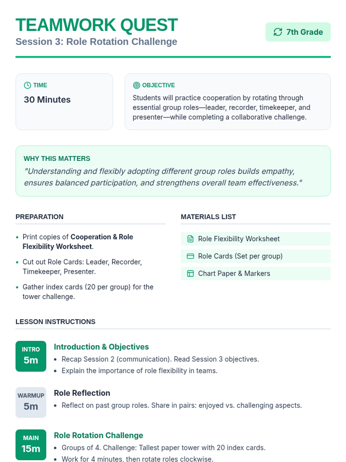 Students will practice cooperation by rotating through essential group roles while completing a collaborative challenge and reflecting on role flexibility.
