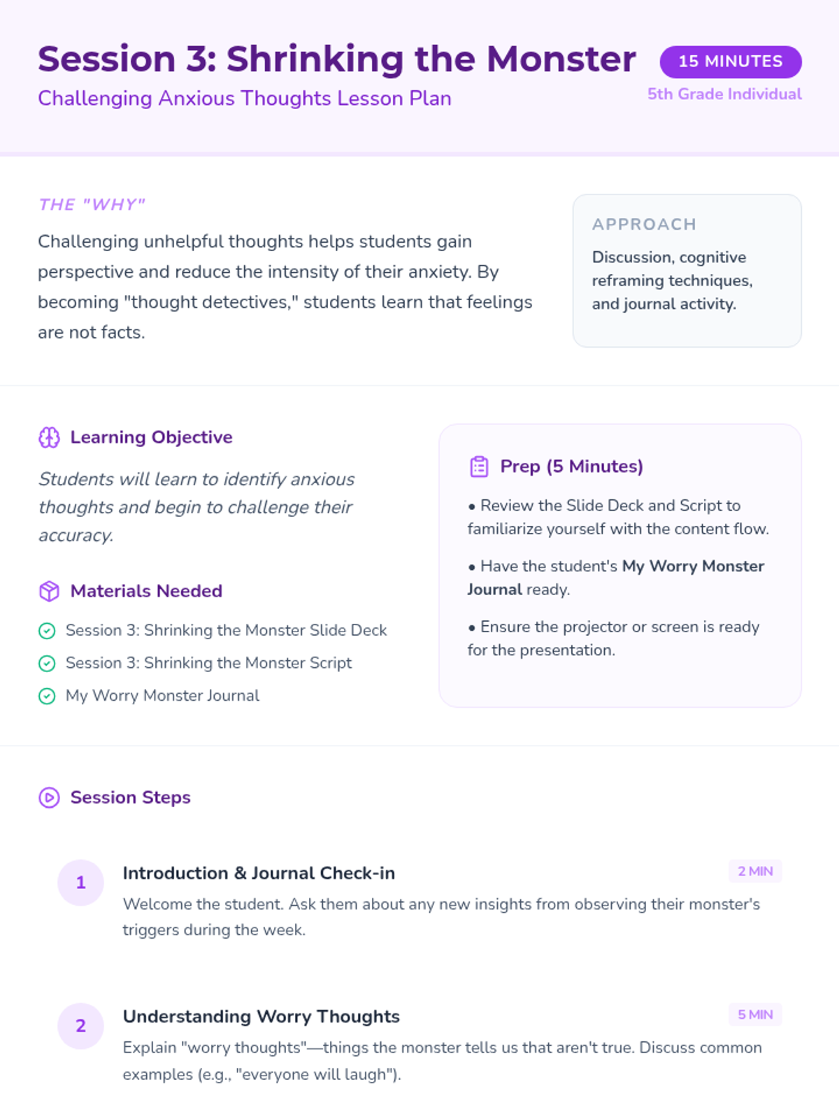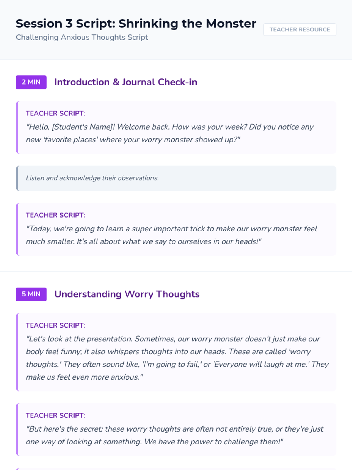 Introduces cognitive reframing techniques to help students identify and challenge anxious thoughts, turning them into 'calm thoughts.'