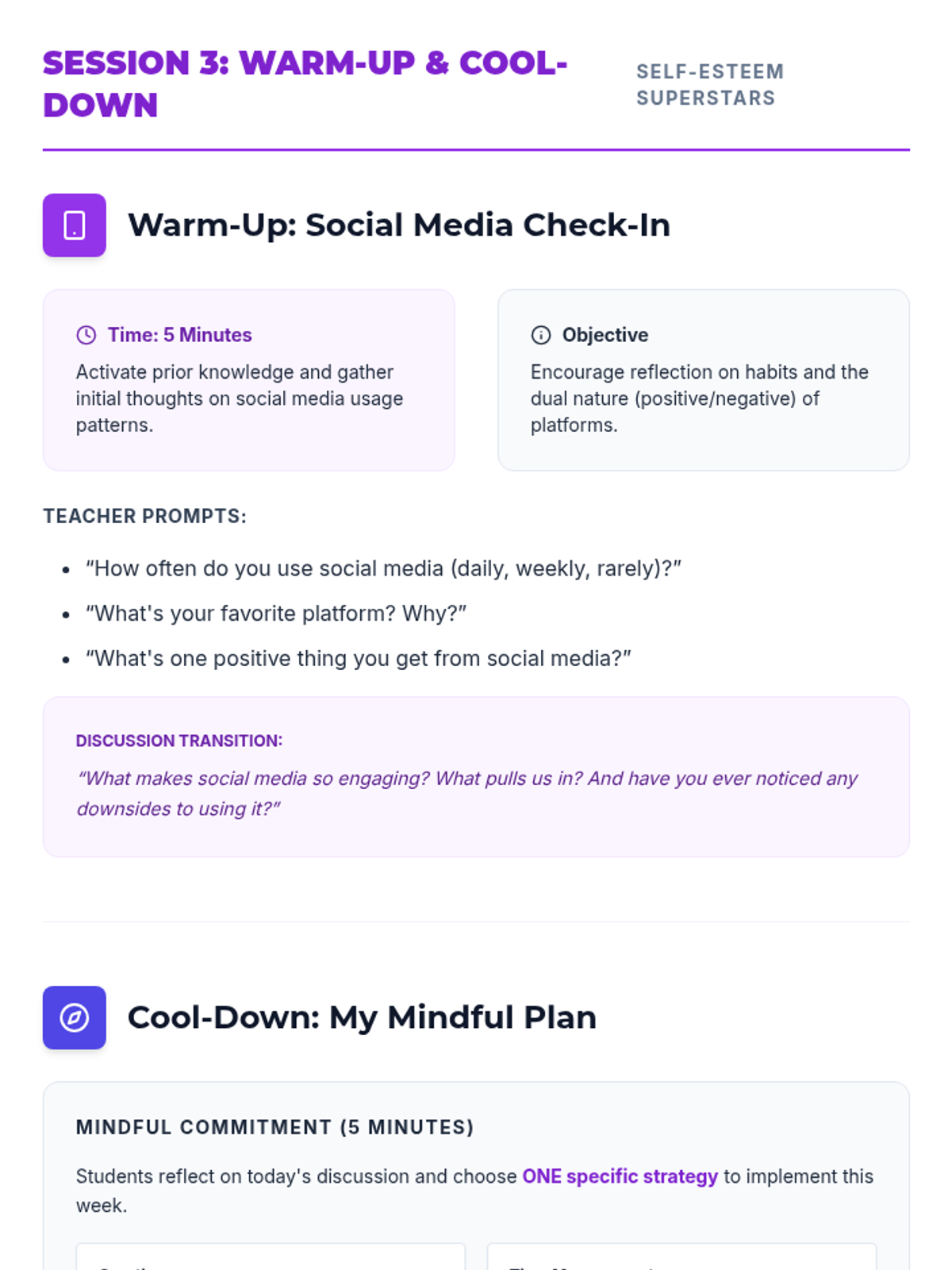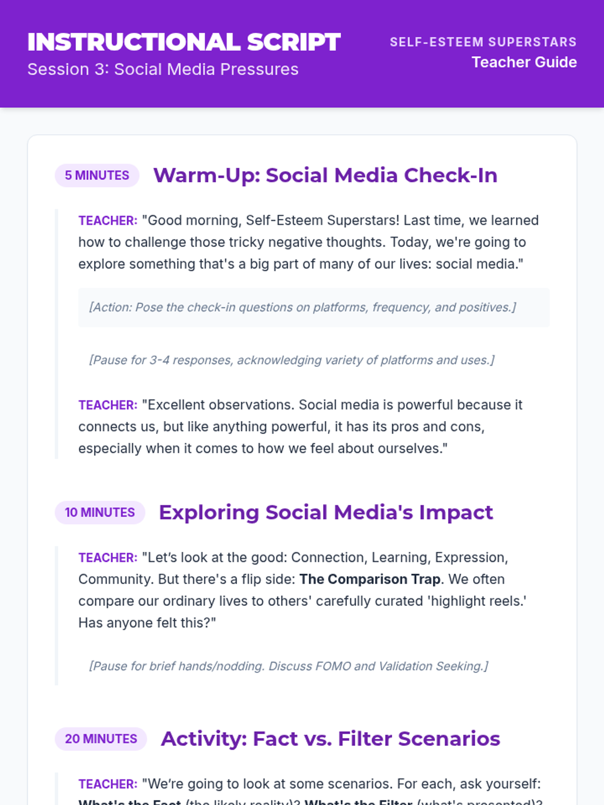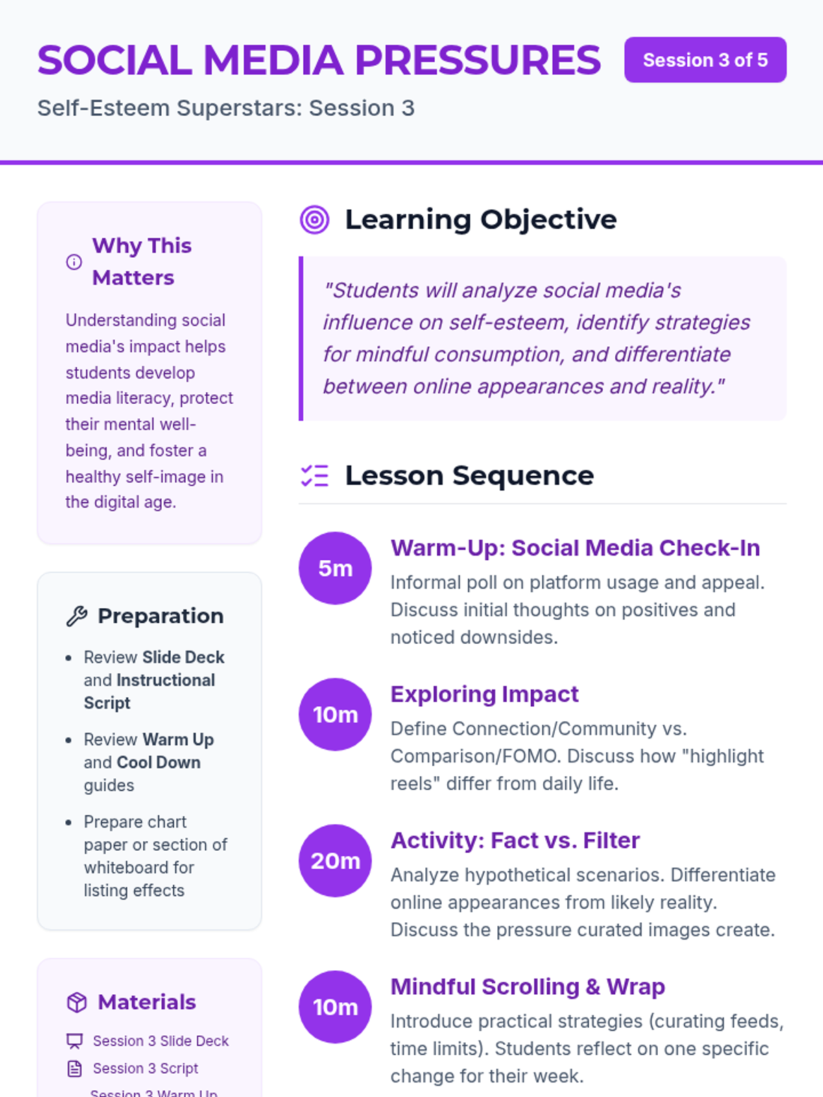 Students analyze how social media influences self-esteem, identify strategies for mindful consumption, and differentiate between online appearances and reality.