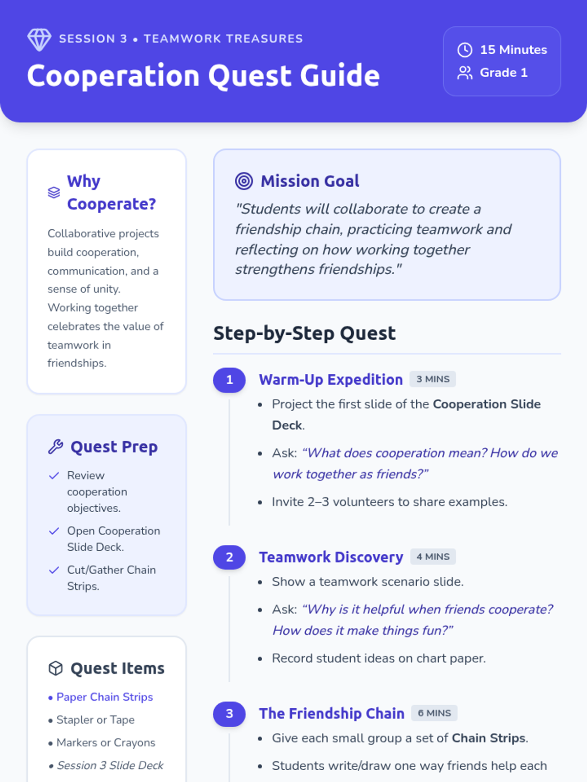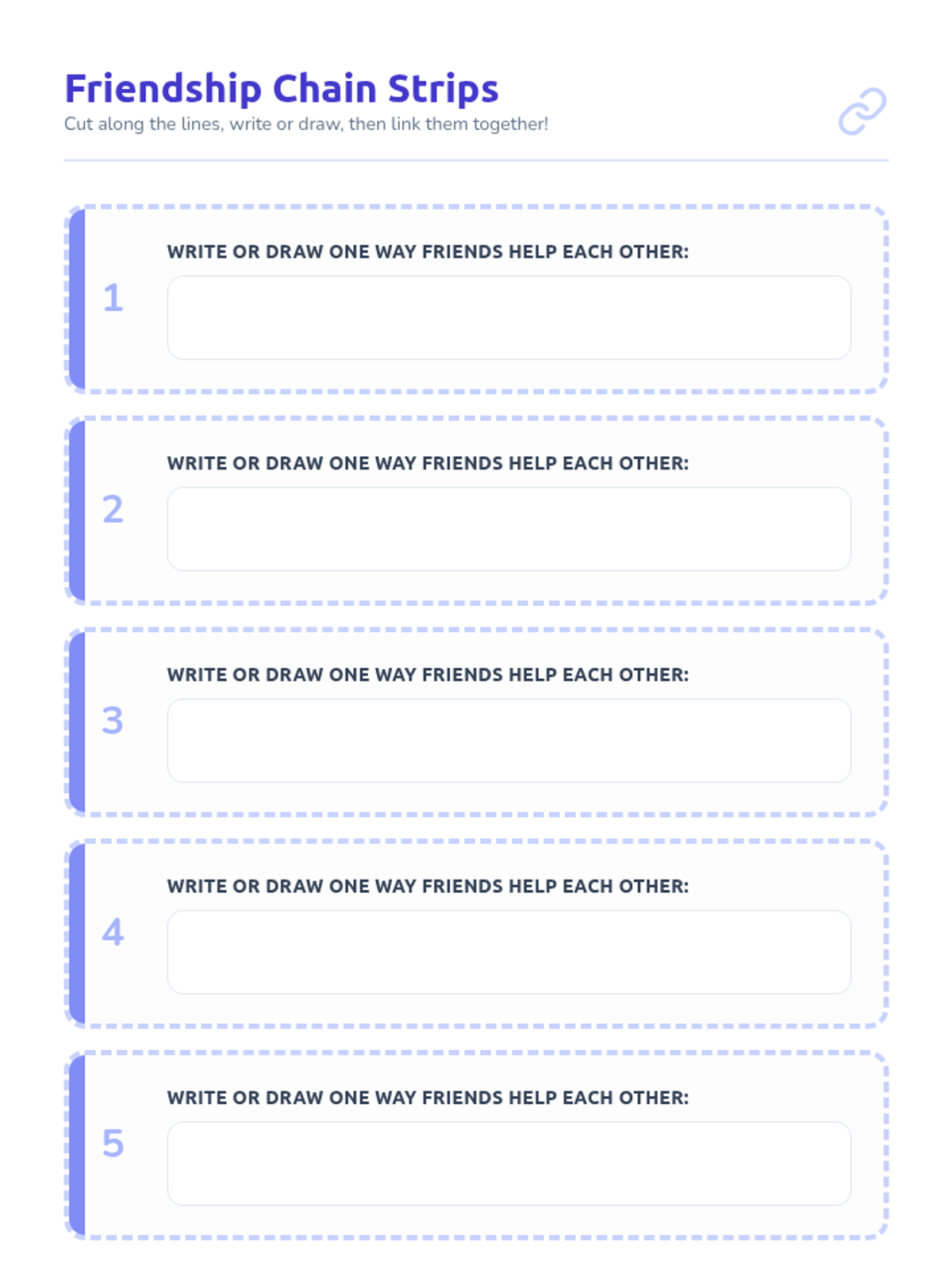 Students collaborate on a friendship chain activity to practice cooperation and communication skills.