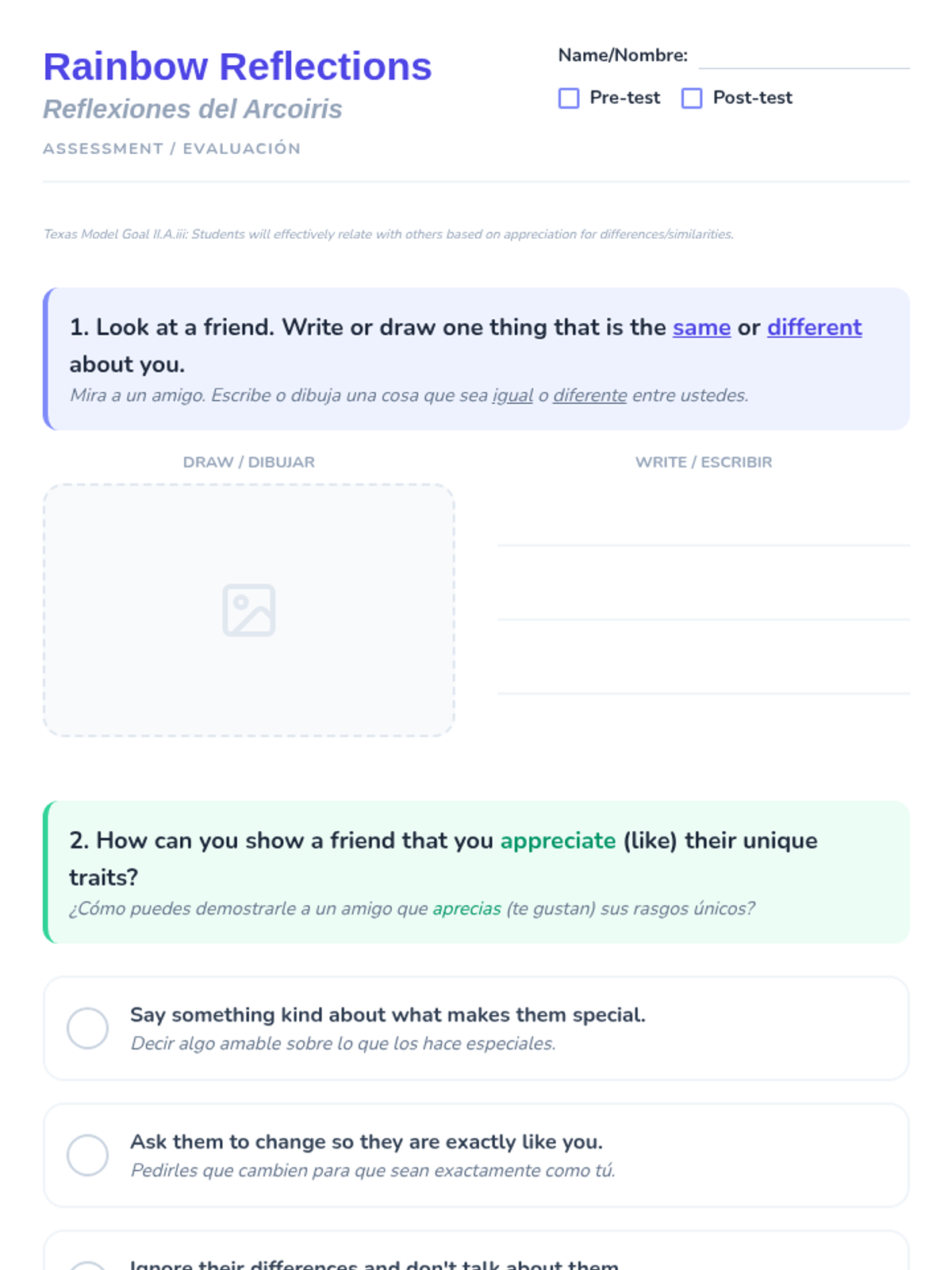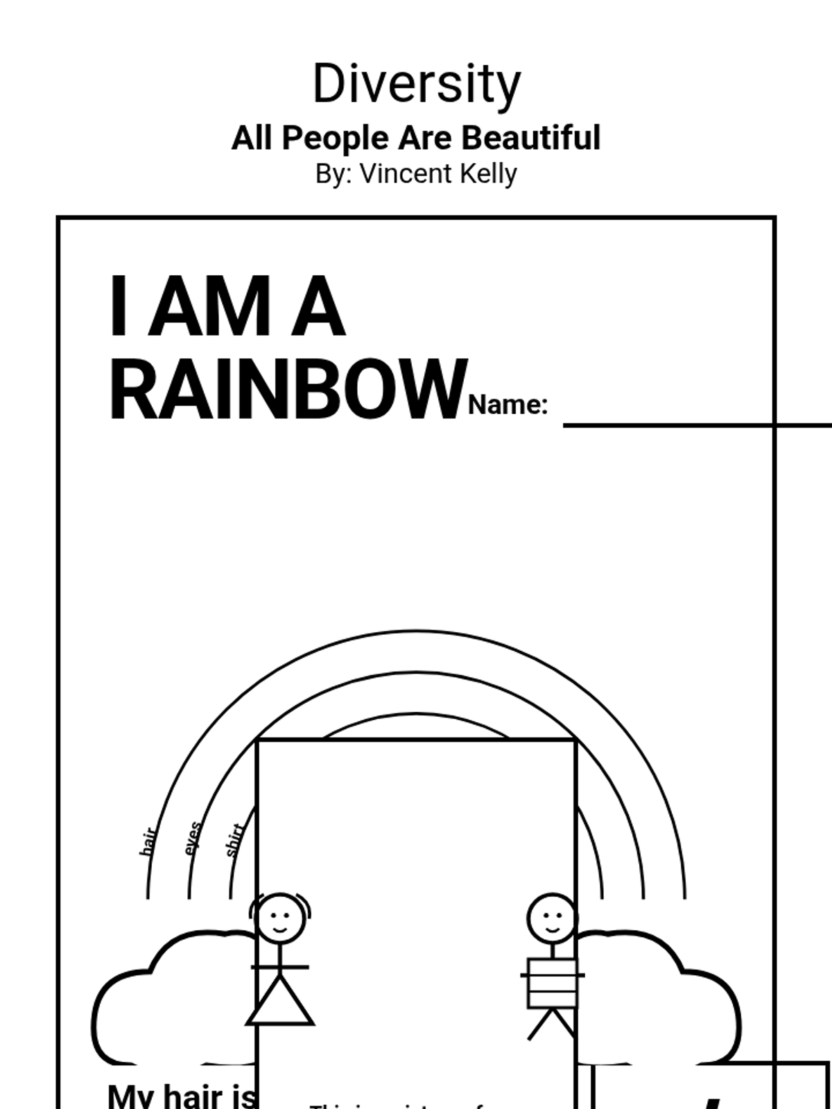 A bilingual (English/Spanish) lesson for 2nd graders exploring human diversity and self-acceptance through the book 'All People Are Beautiful'. Students celebrate their unique traits by creating a 'I am a Rainbow' self-portrait.