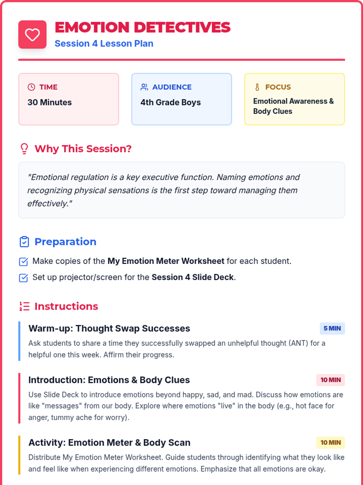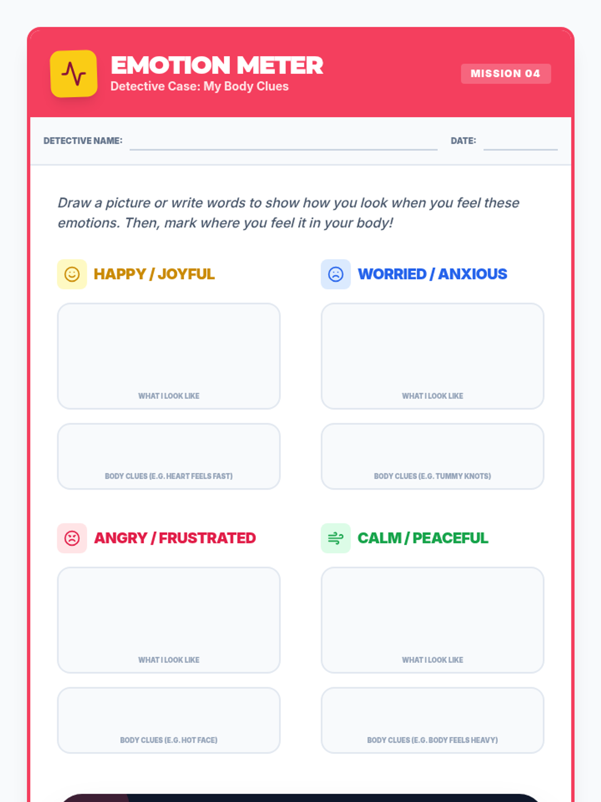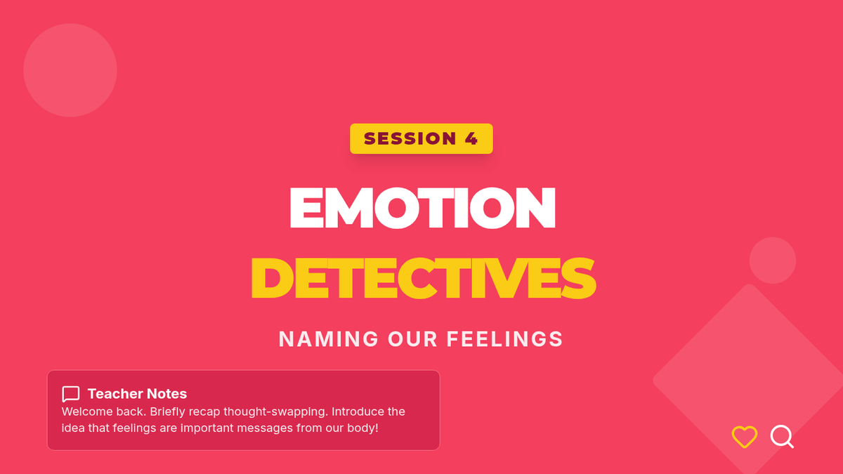 Focuses on emotional awareness and the physical sensations of feelings. Students expand their emotional vocabulary and identify where they feel emotions in their bodies.