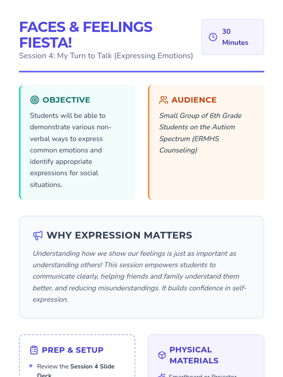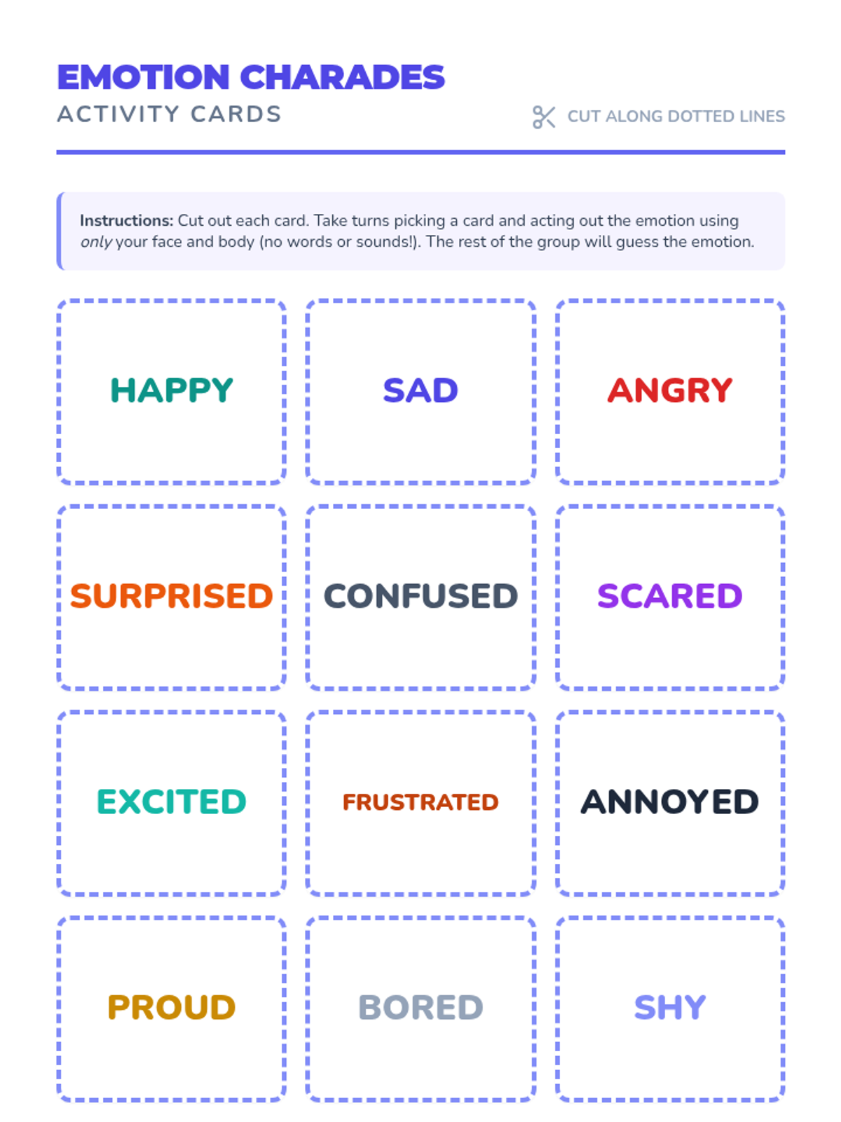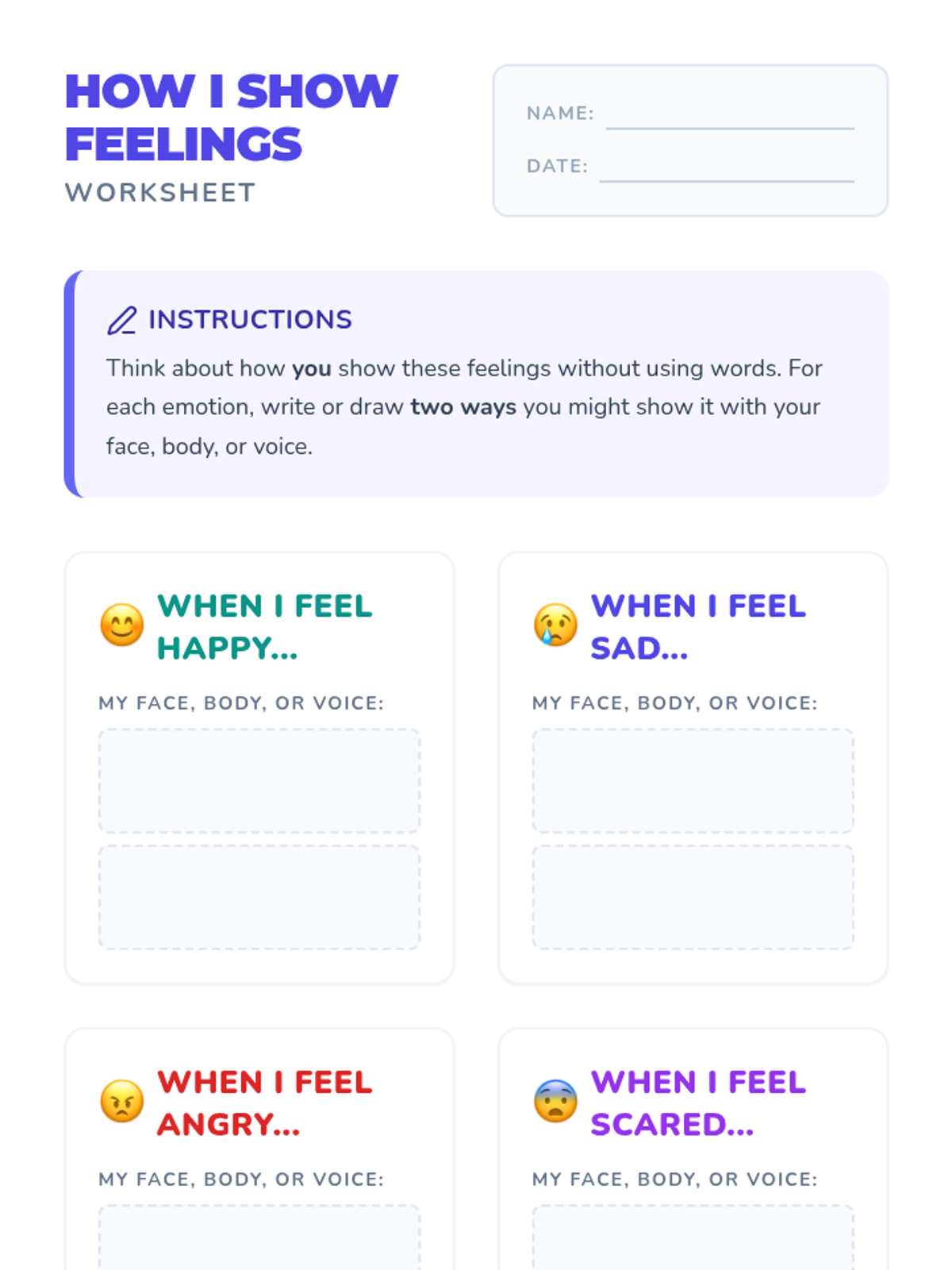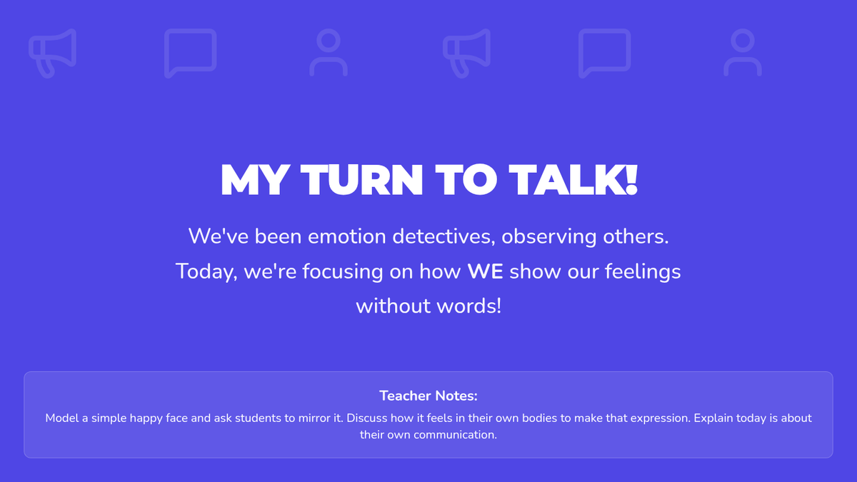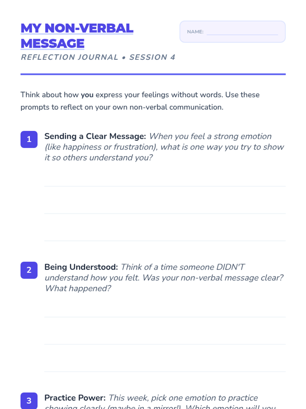 Students practice expressing their own emotions using the non-verbal skills they have learned to communicate clearly with others.