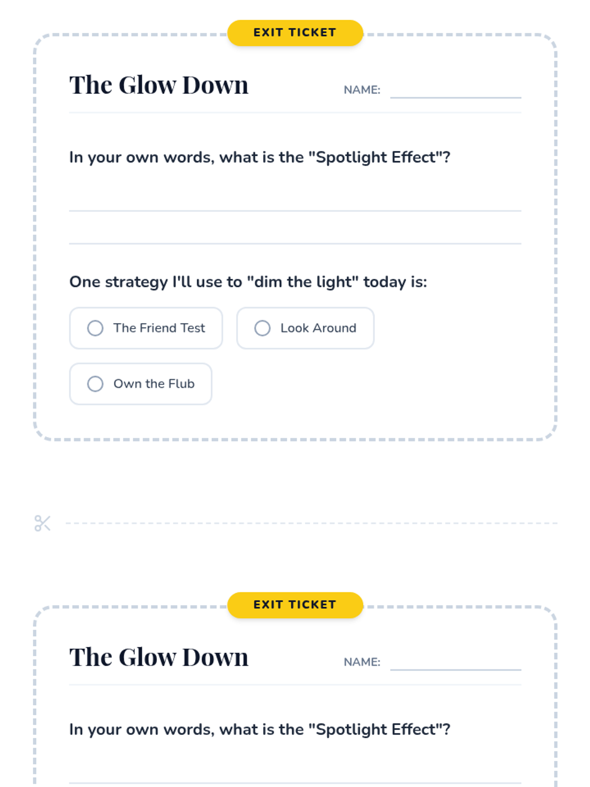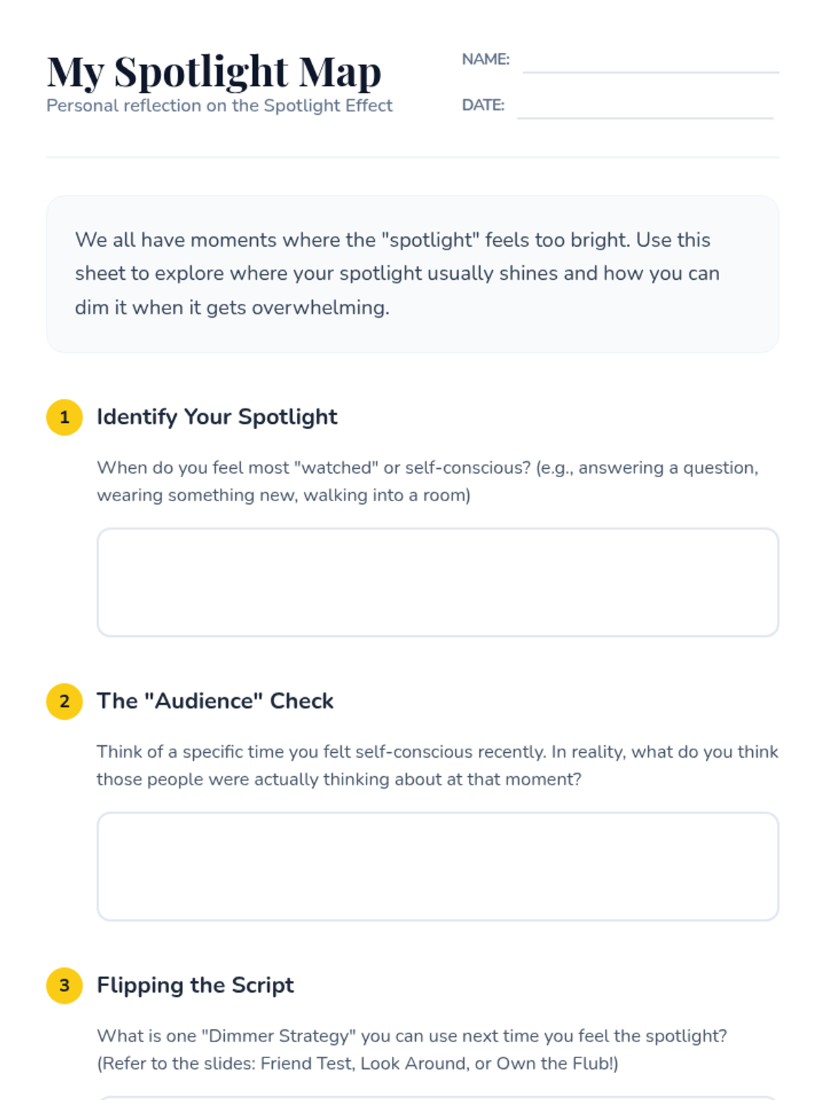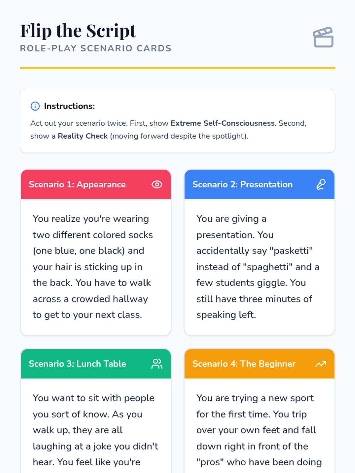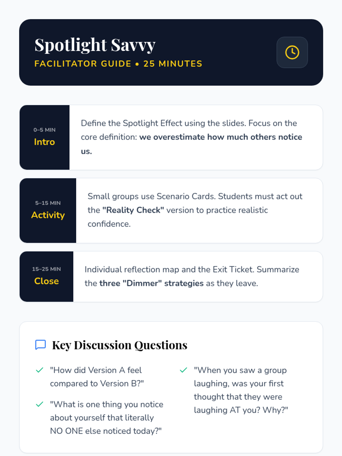 A 25-minute lesson on overcoming the 'Spotlight Effect' and reducing self-consciousness across social, physical, and performance-based situations. Students explore why we feel watched and practice 'flipping the script' through scenario-based role-play.
