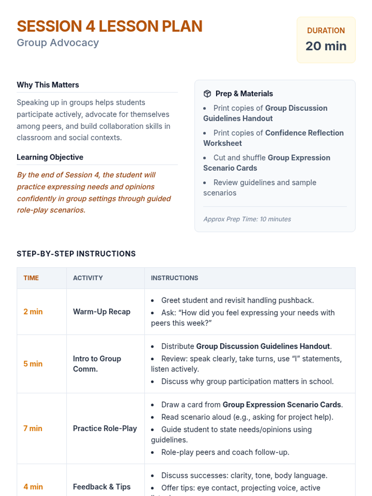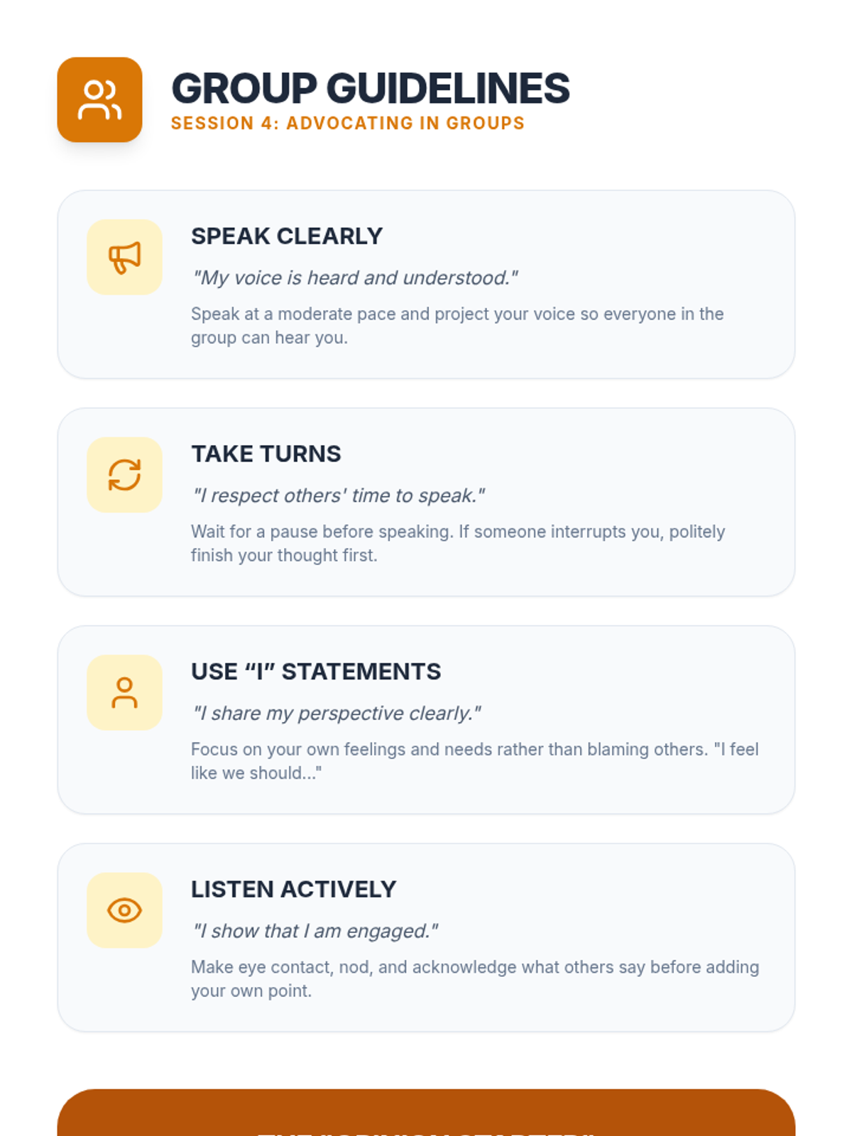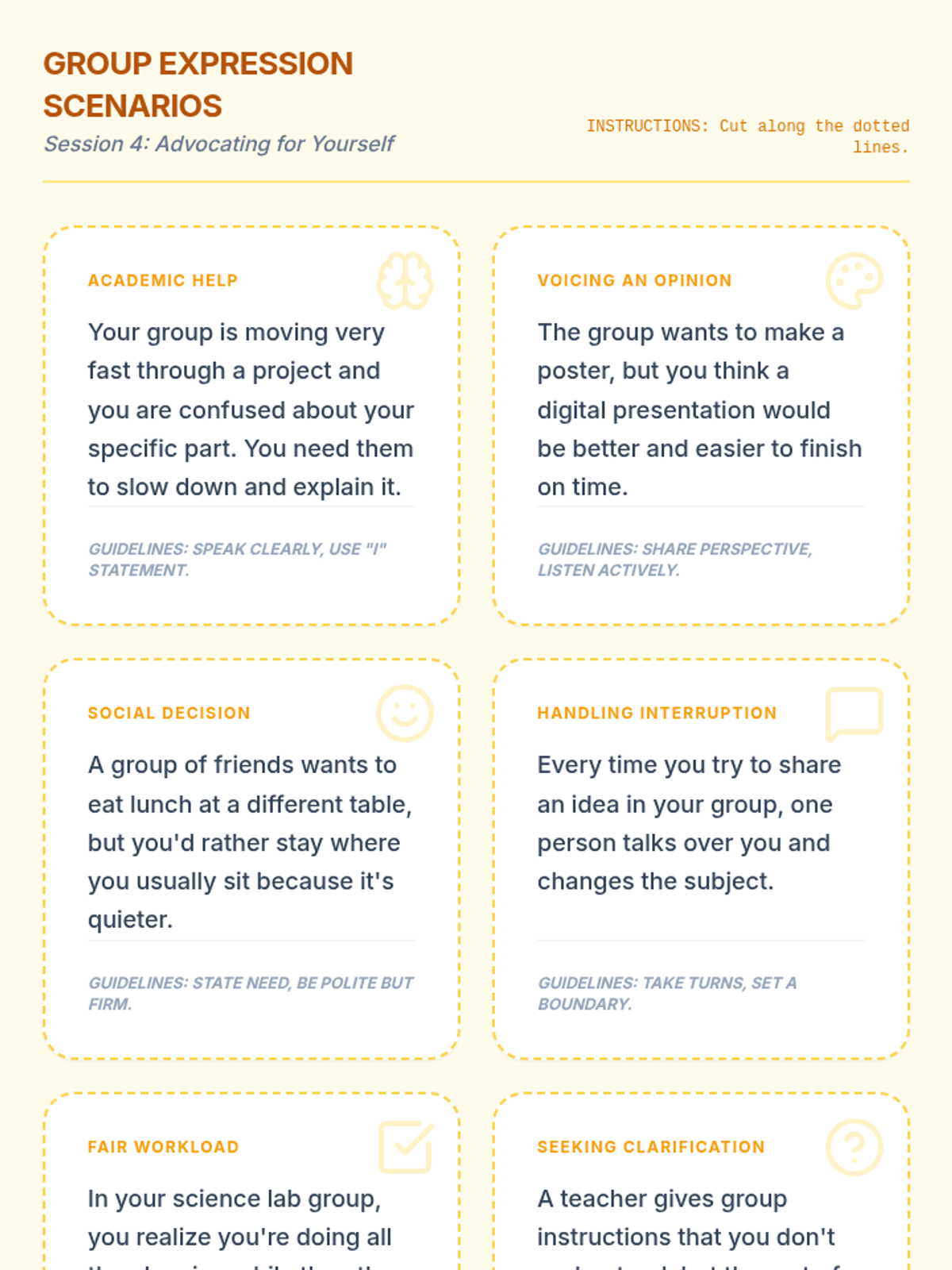 Applies assertive communication skills to group dynamics, emphasizing participation and self-advocacy in social and academic settings.