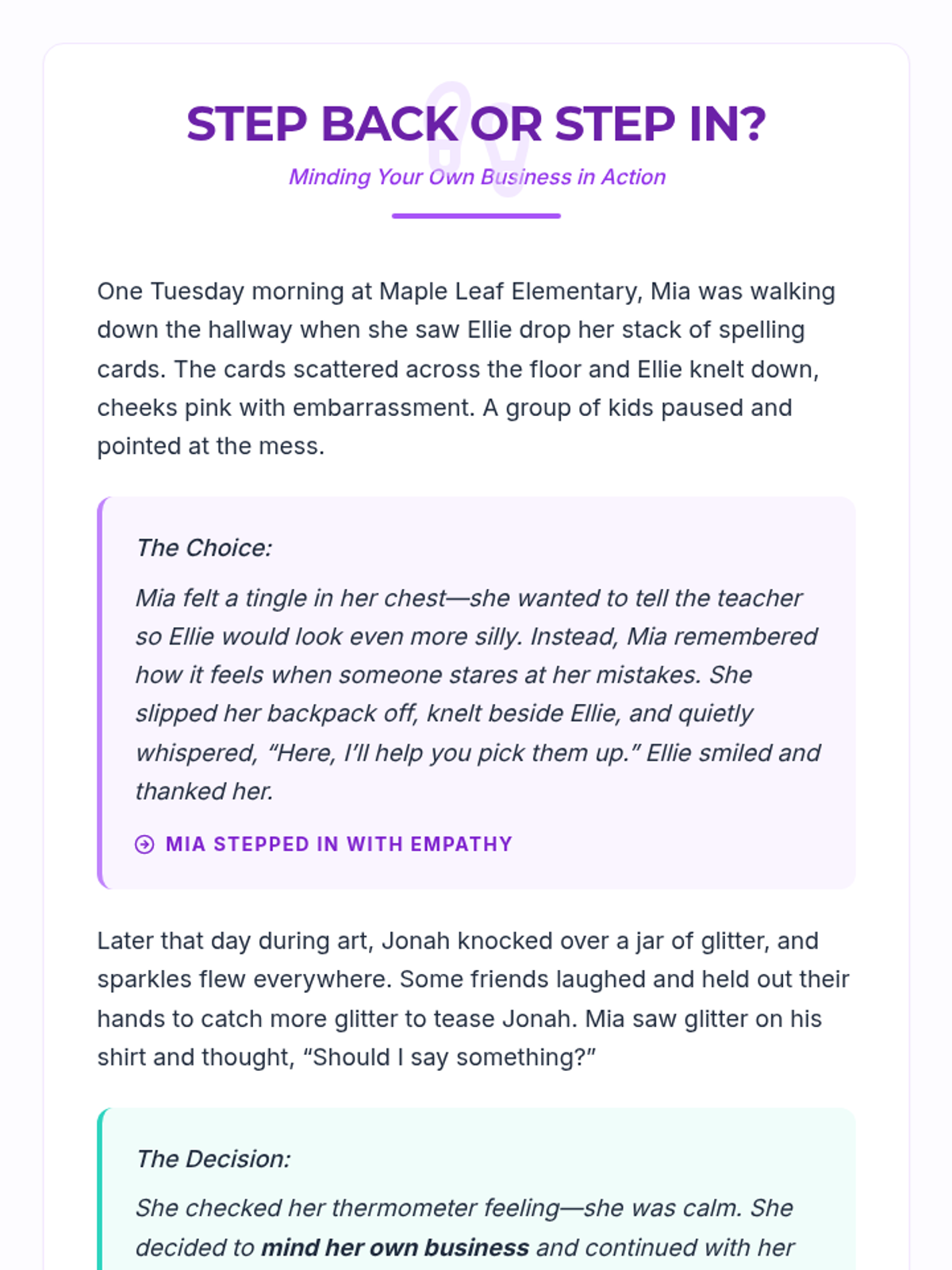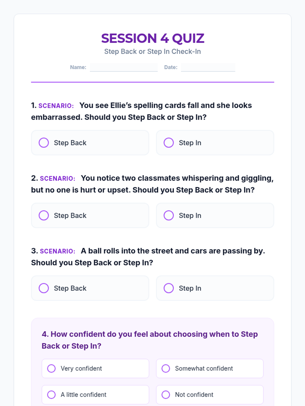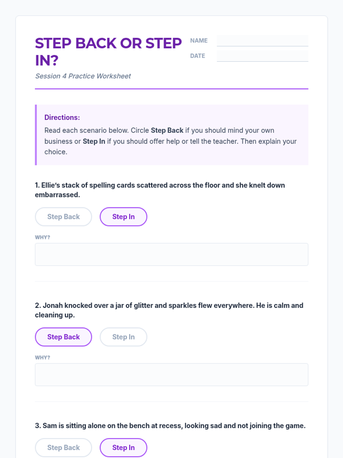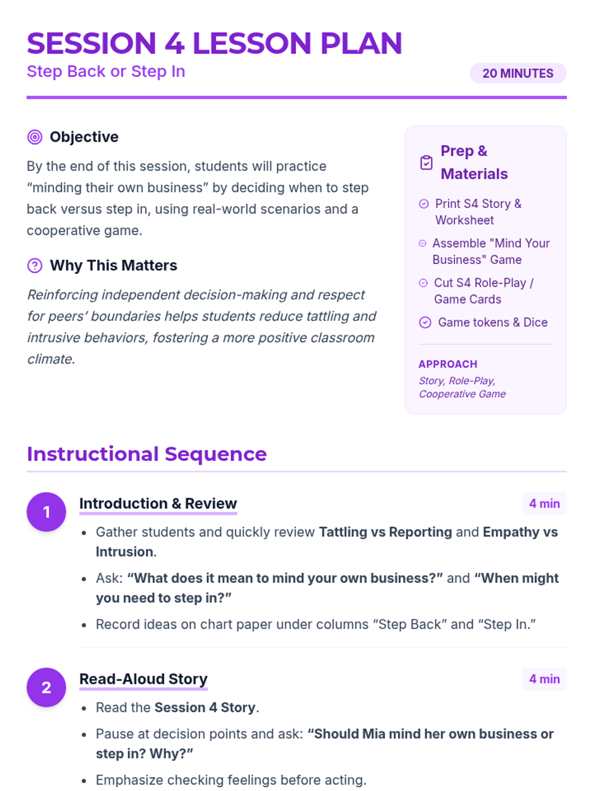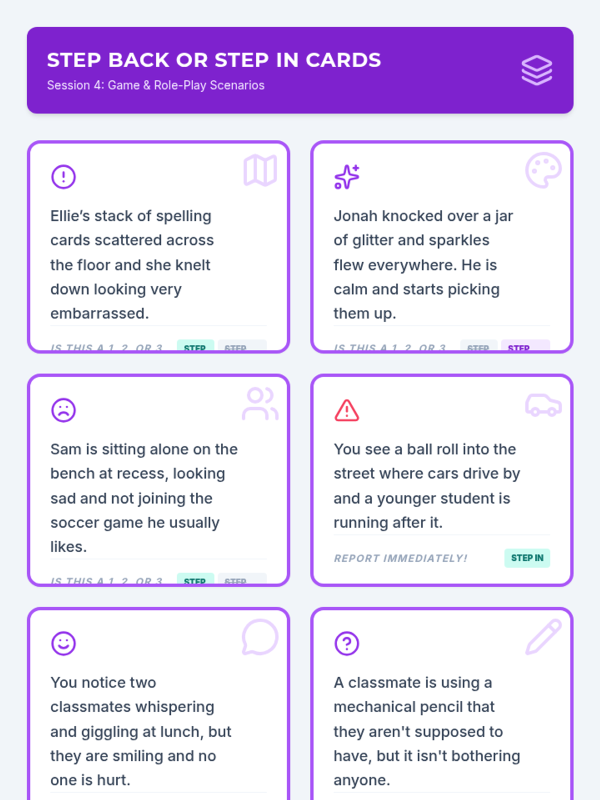 Provides practice in deciding when to 'Step Back' (mind your own business) and when to 'Step In' (help or report) through stories, role-play, and a cooperative game.