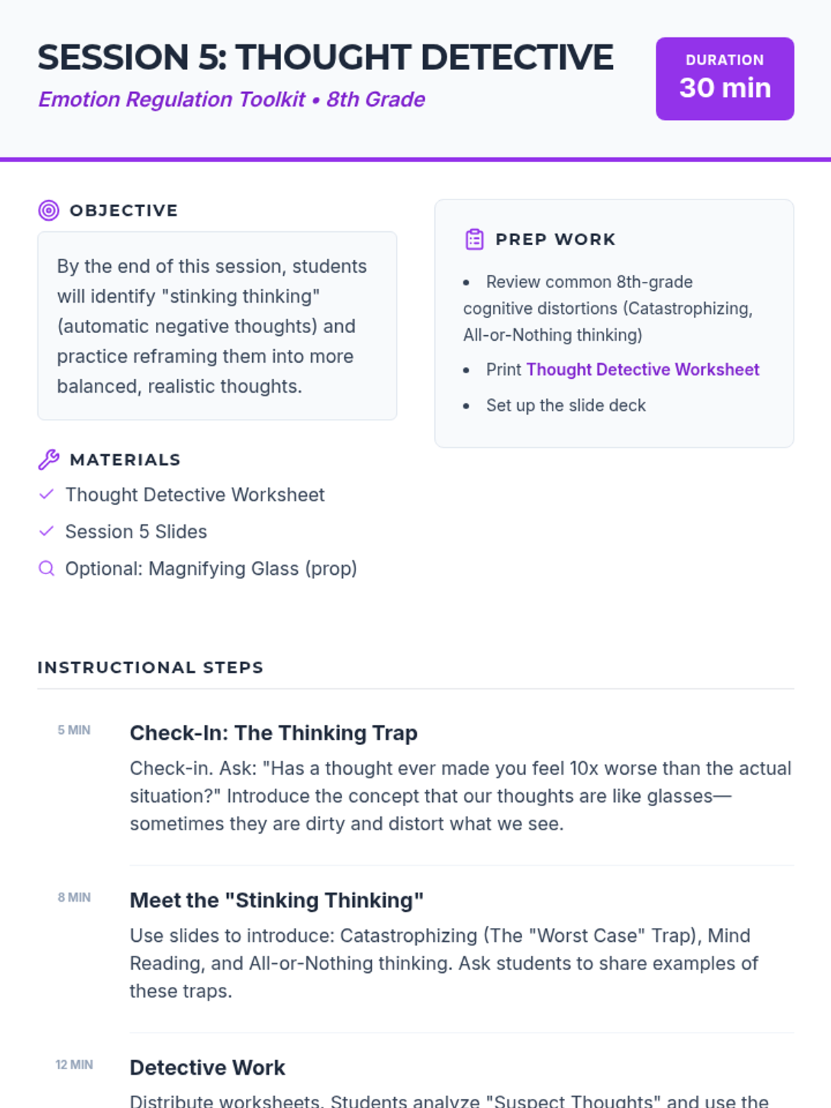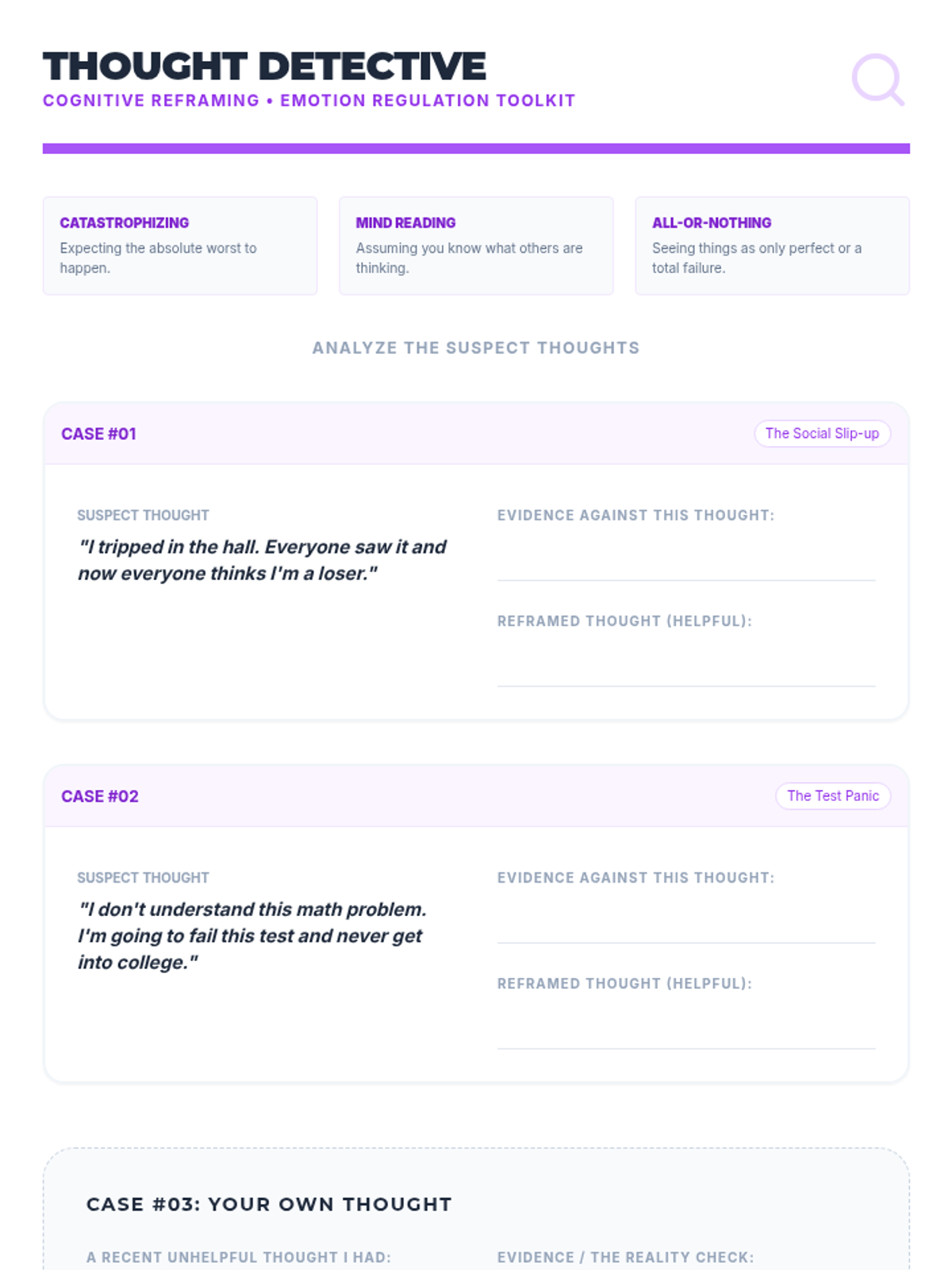 Identifying and challenging unhelpful thought patterns (cognitive distortions) allows students to change how they feel by changing how they think.