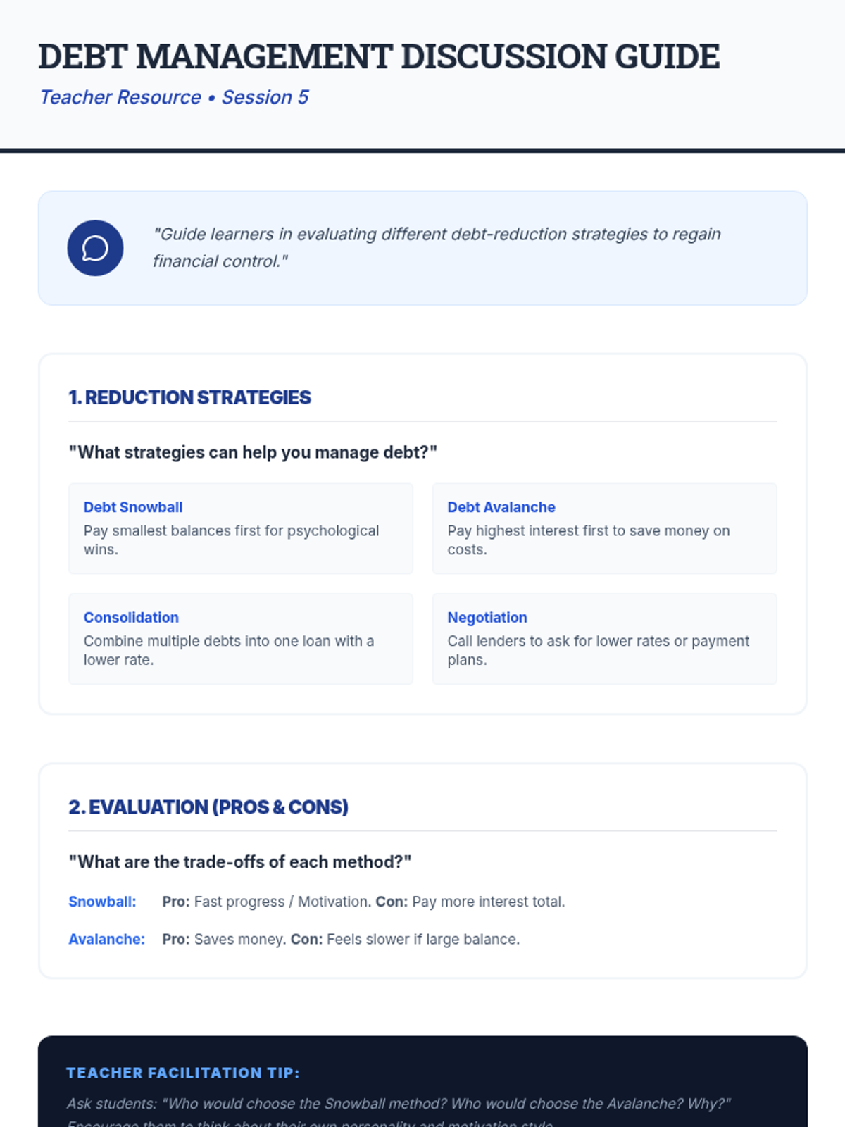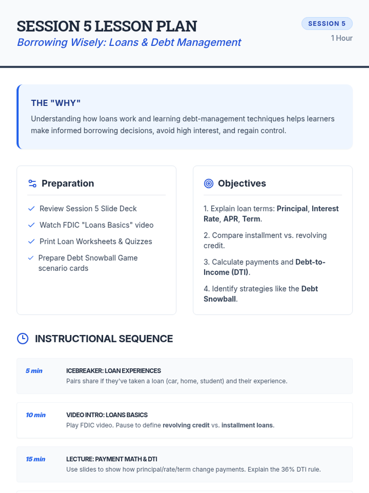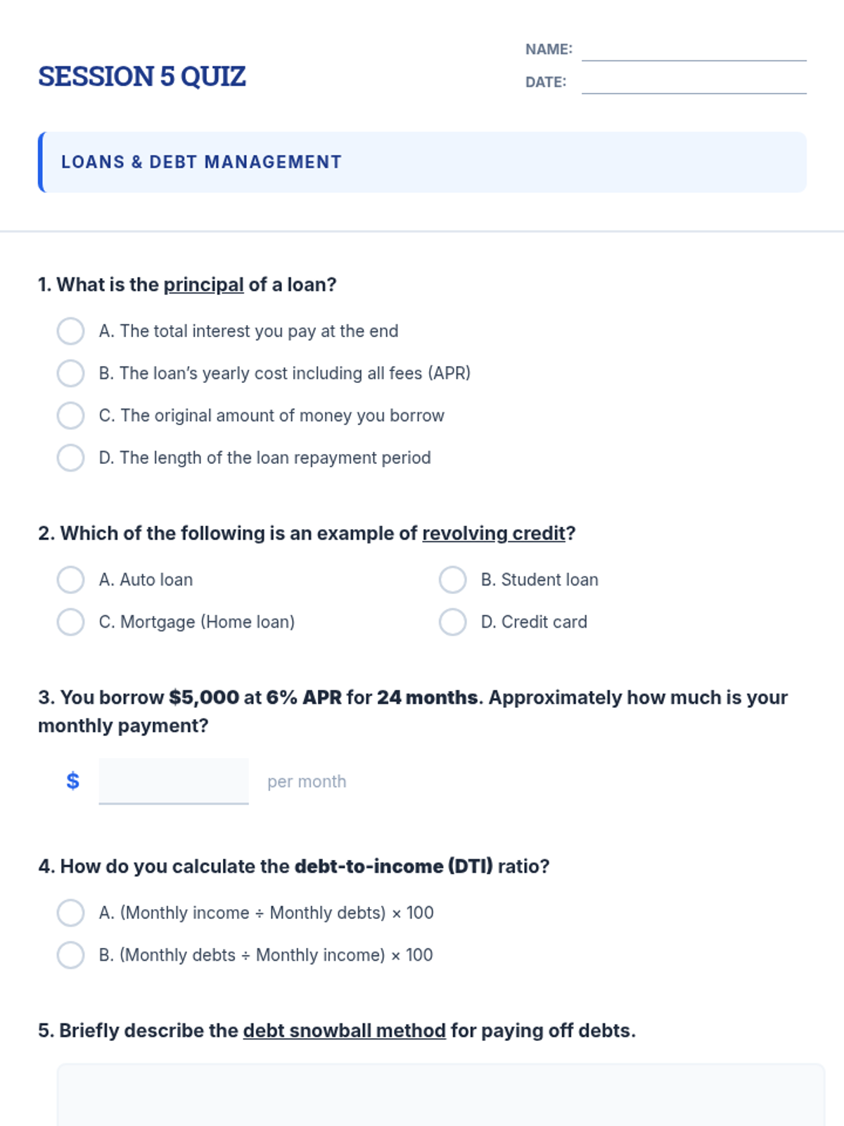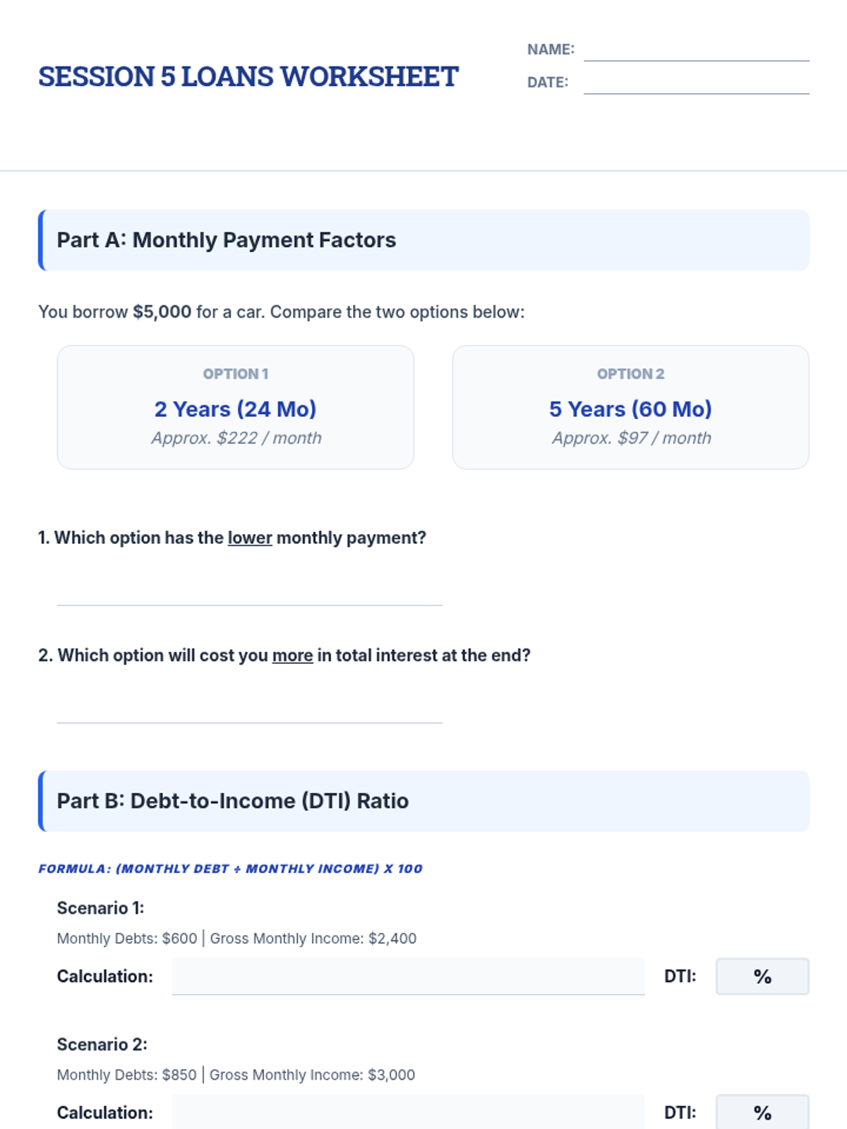 Introduce adult ESL learners to loans and debt management, enabling them to compare loan types, calculate repayments, and apply strategies to manage and reduce debt.