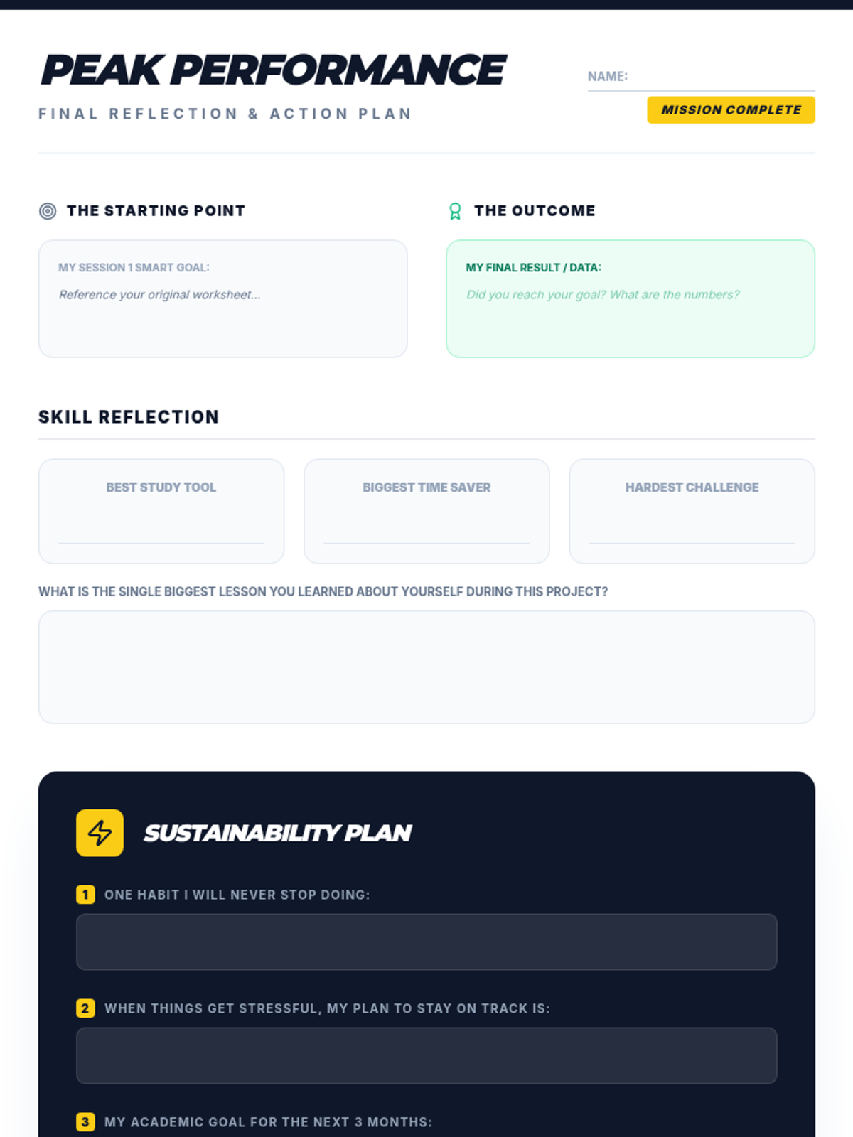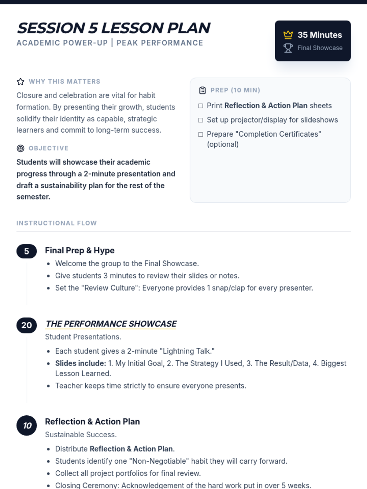 Focuses on the second 'P' (Purpose), guiding students to connect their daily actions to their deeper 'Why' to sustain effort when things get tough.