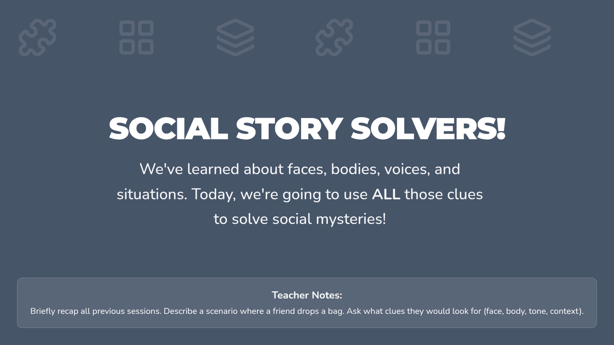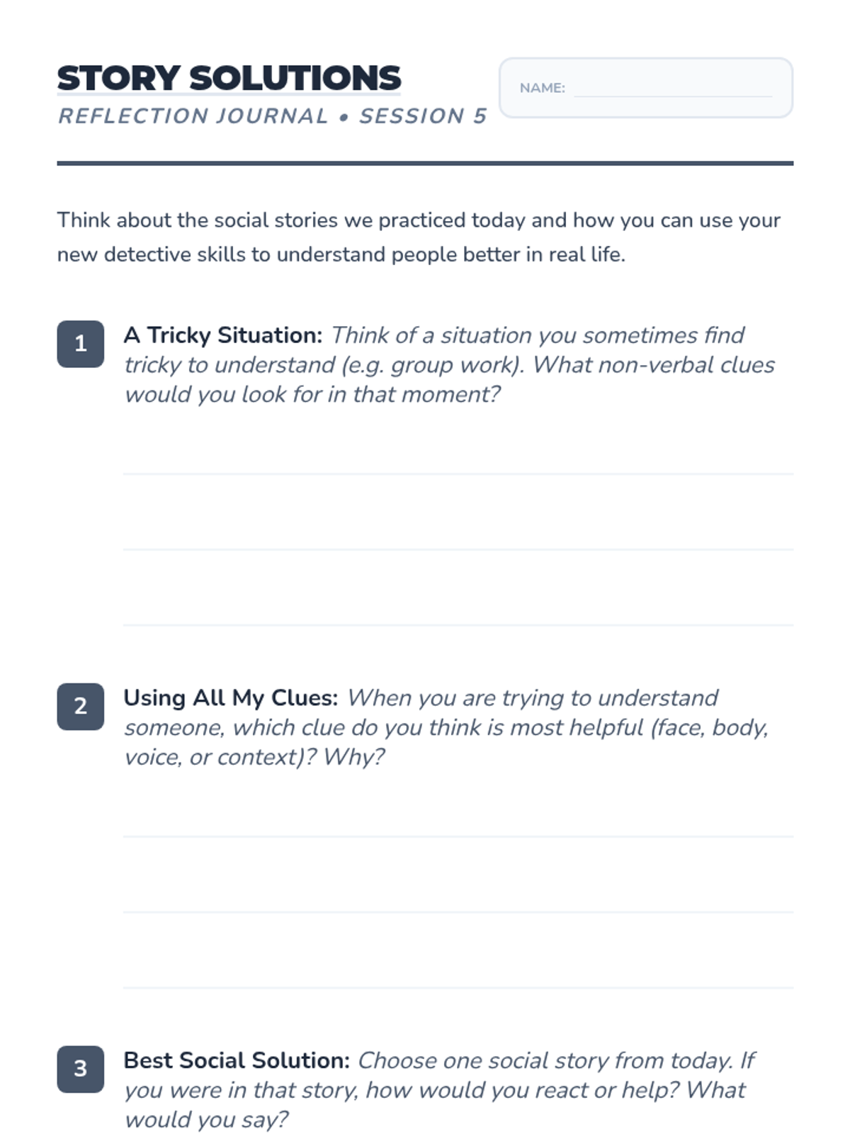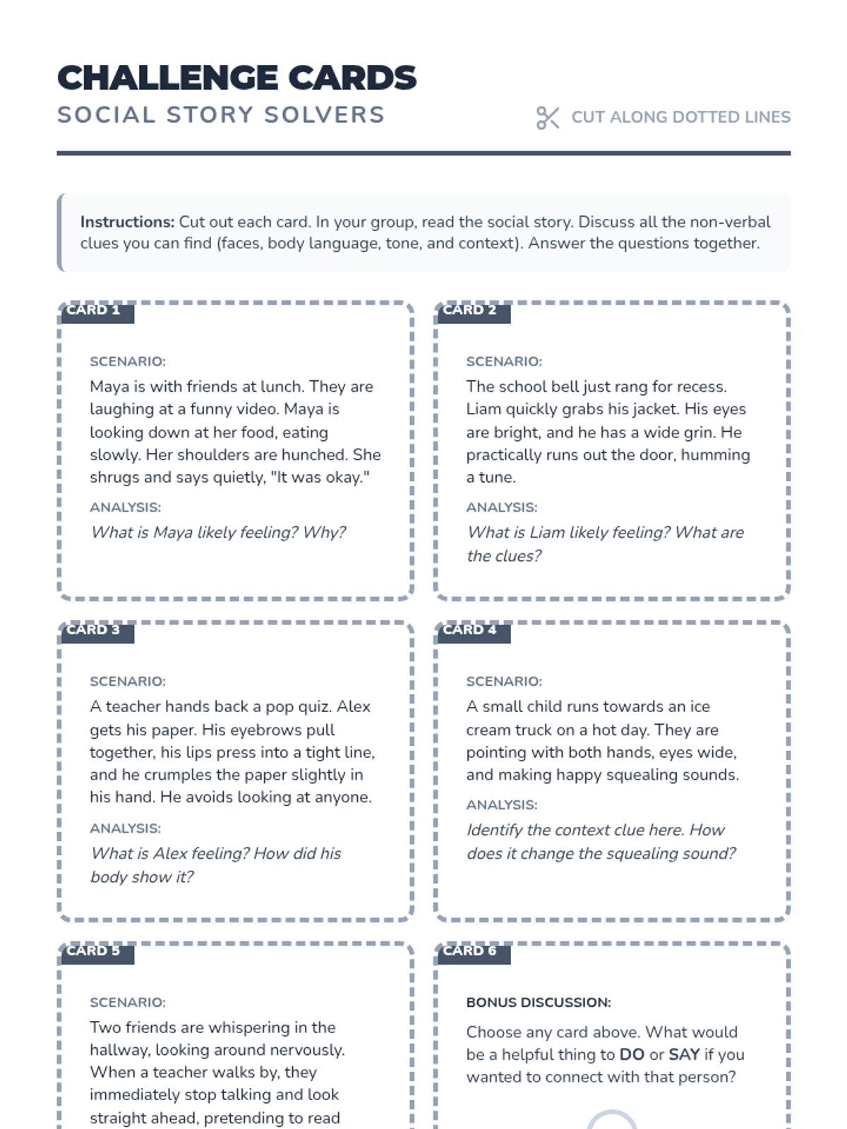 Students integrate all previous skills to analyze complex social scenarios and suggest appropriate responses.