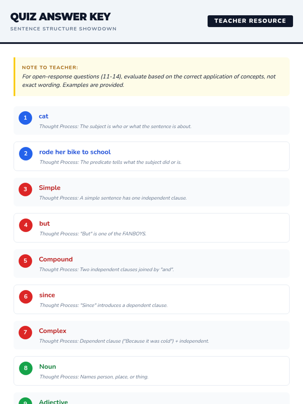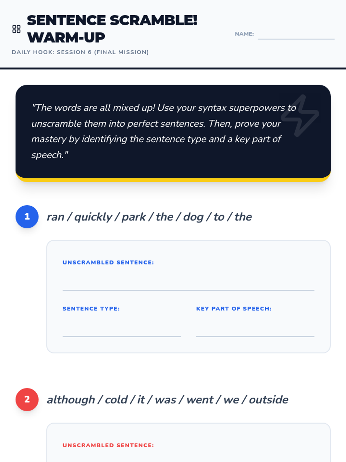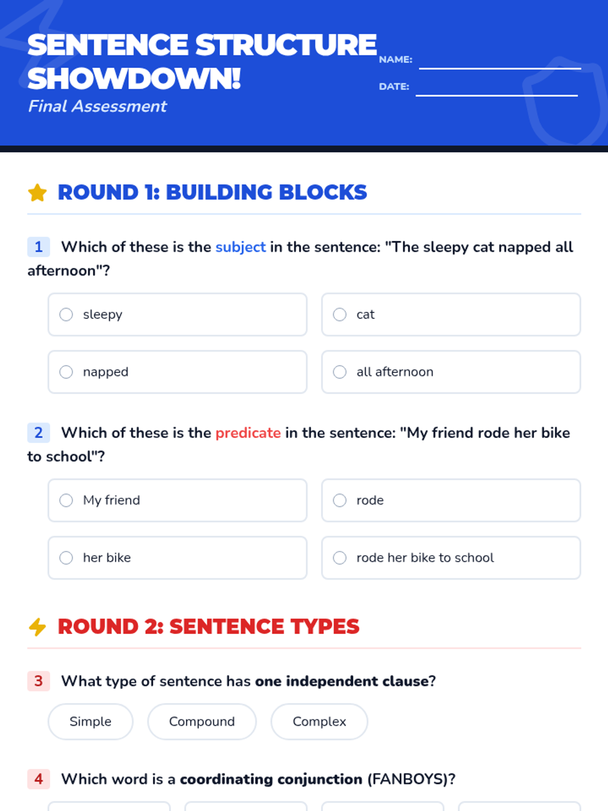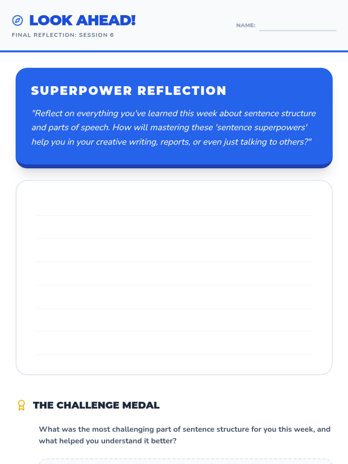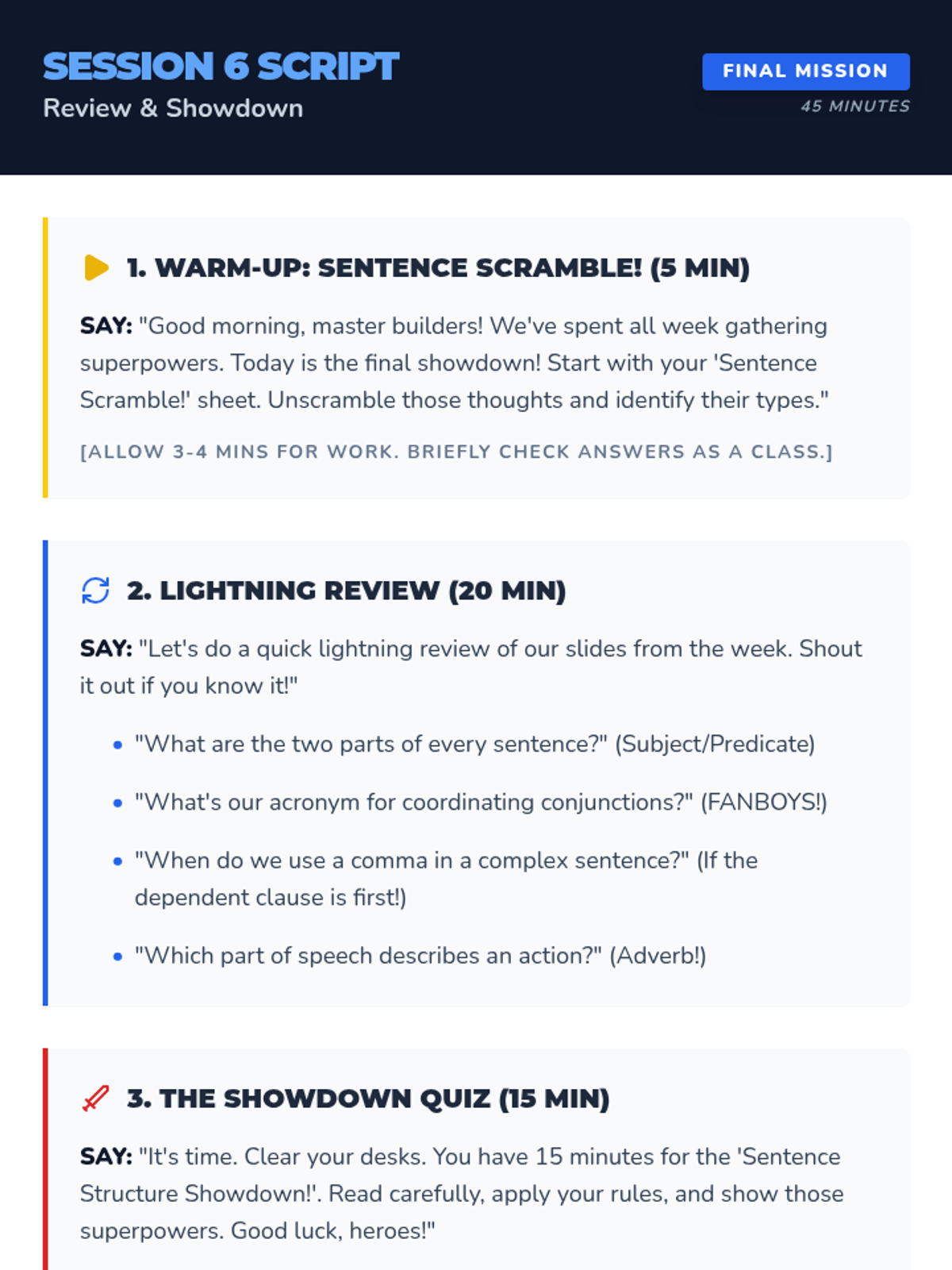 A culminating session where students review all sentence types and parts of speech before demonstrating their mastery in a final assessment.