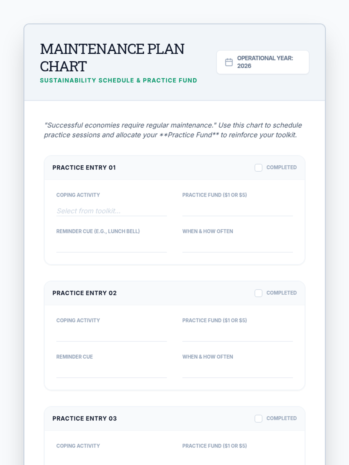 Consolidates all strategies into a personalized toolkit and creates a maintenance plan for independent use.