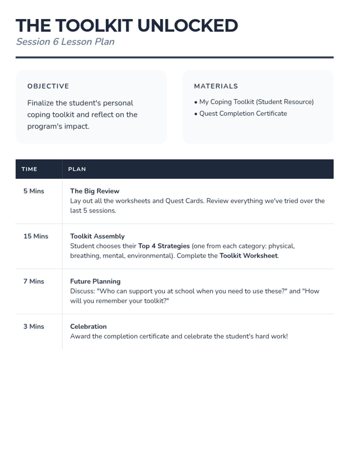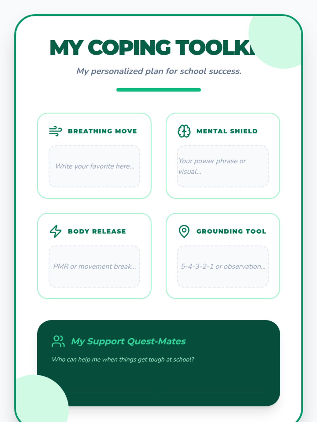 Review all explored strategies, select the most effective personal techniques, and create a "Coping Toolkit" plan for ongoing success.