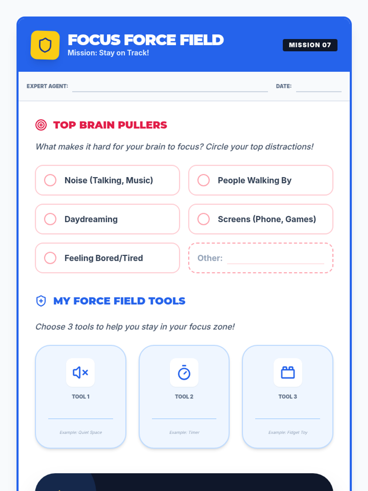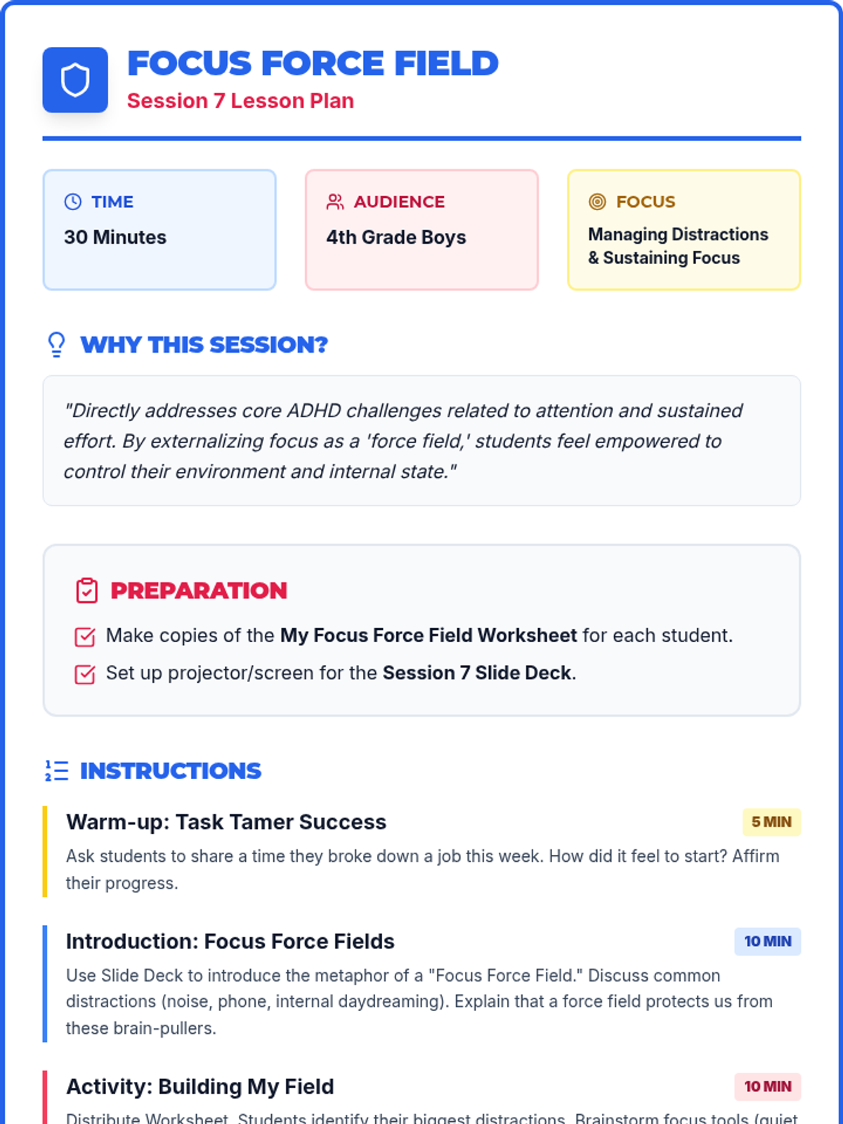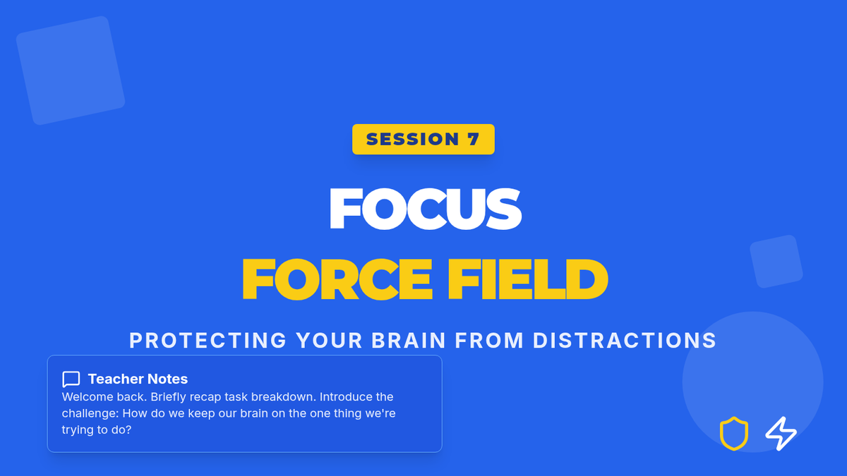 Focuses on attention and sustained effort. Students identify personal distractions and build a conceptual "Focus Force Field" using specific environmental and internal tools.