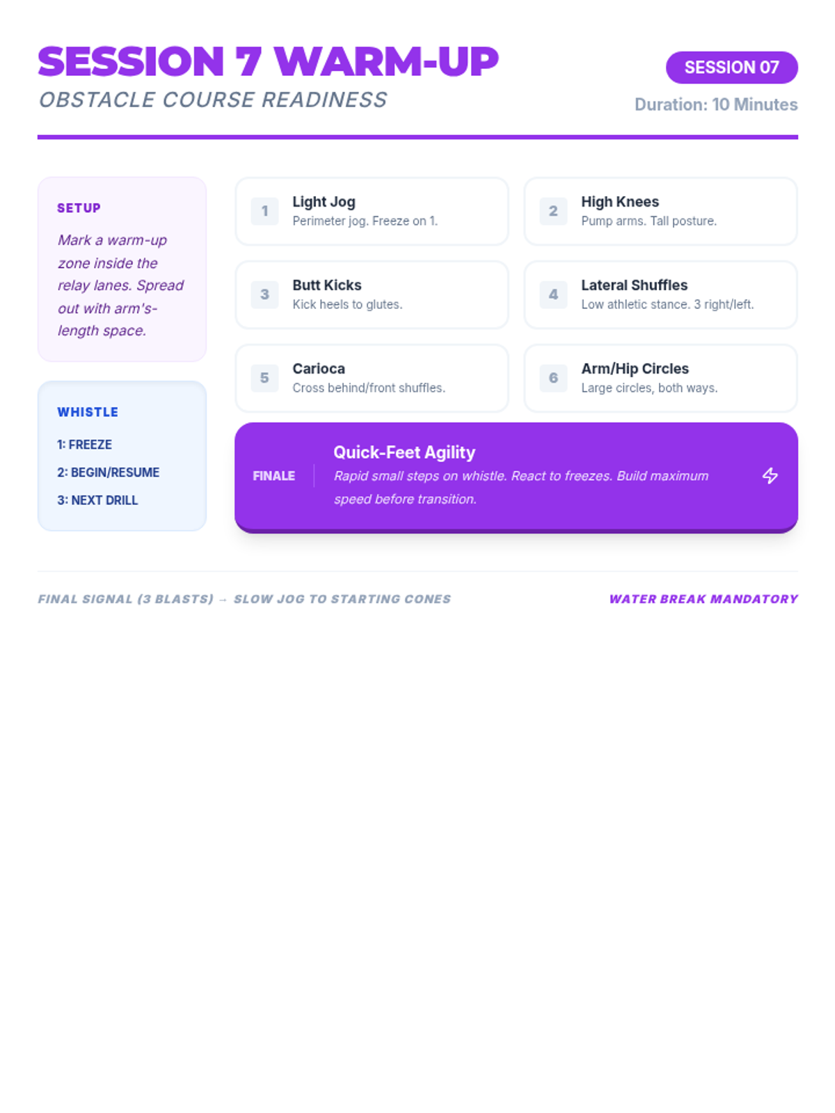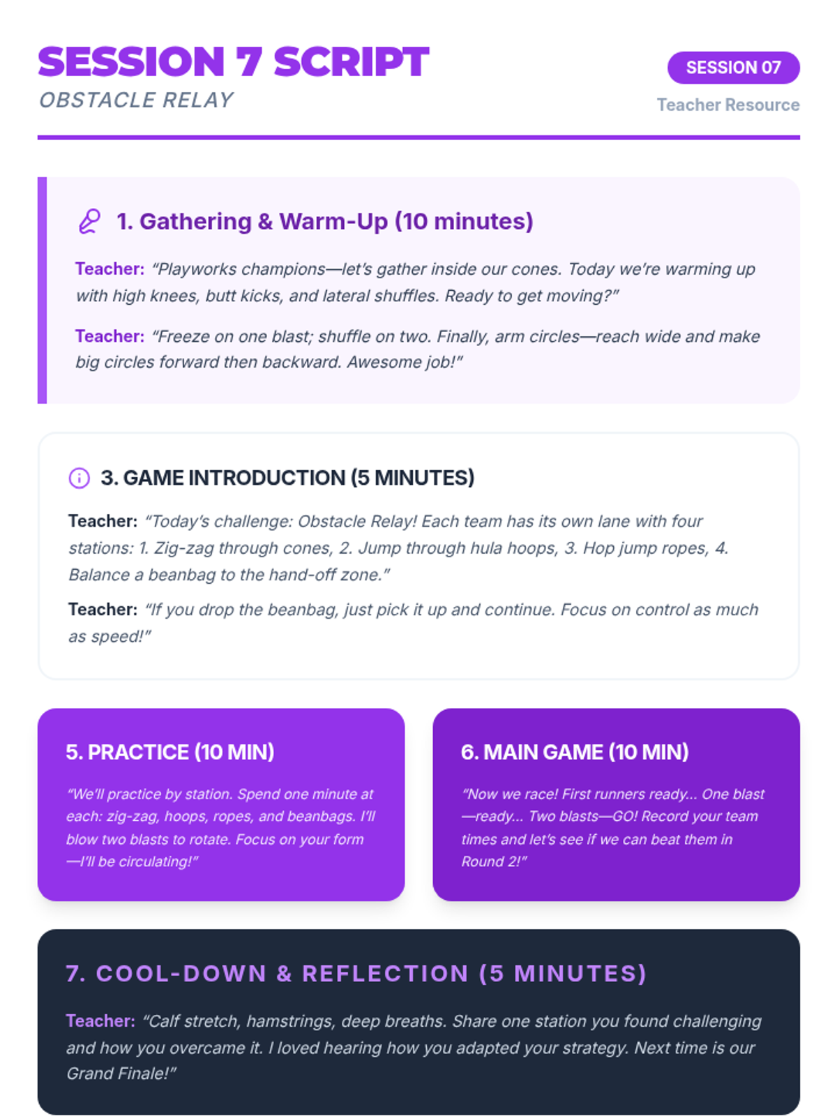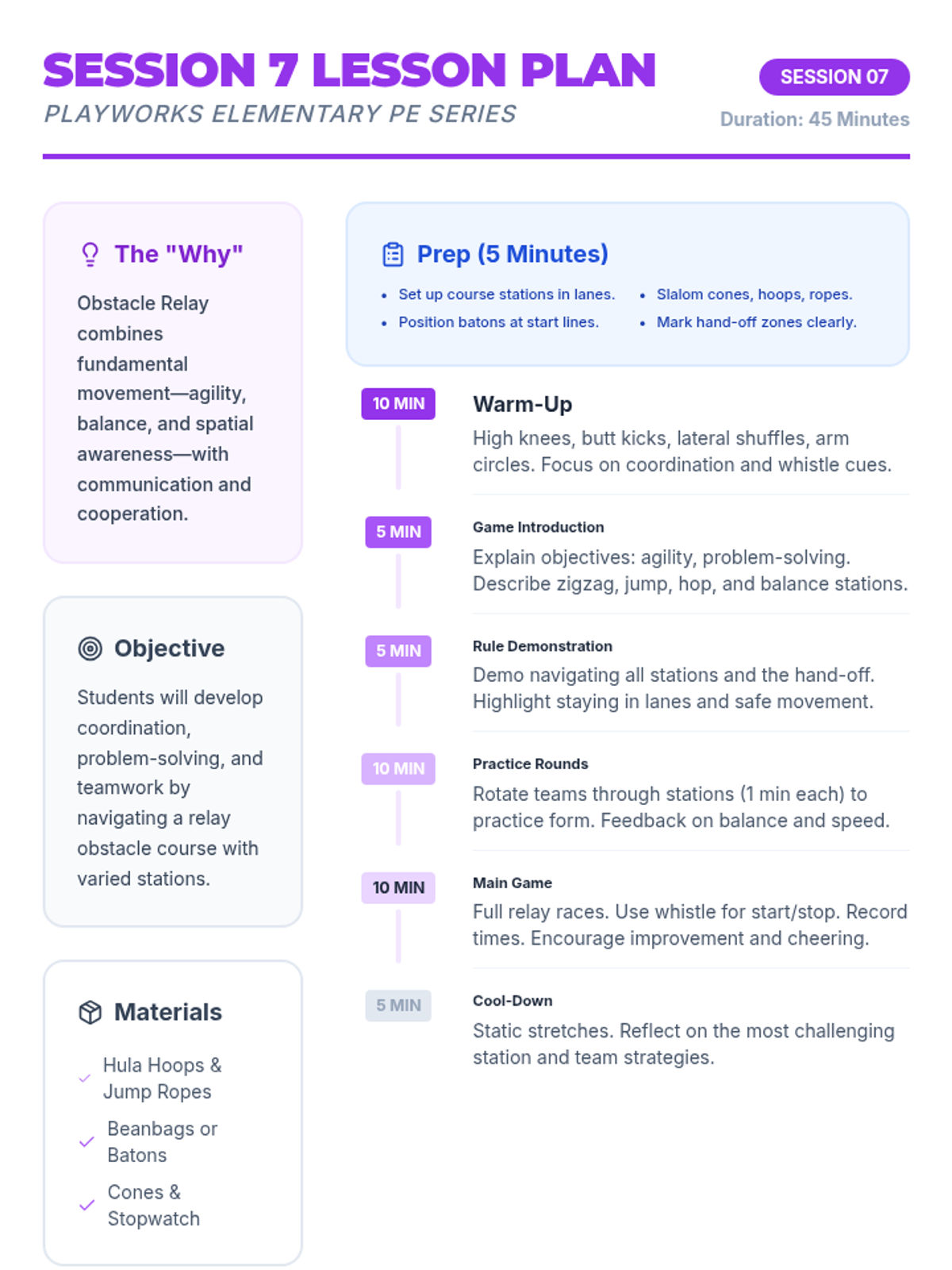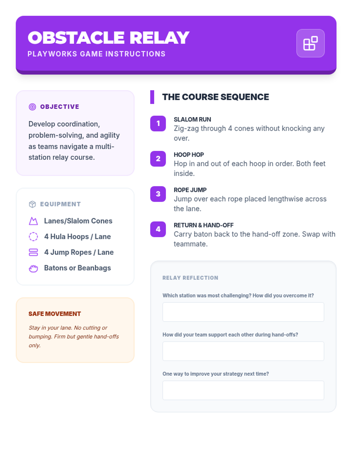 Obstacle Relay challenges students to combine fundamental movement skills—agility, balance, and spatial awareness—with communication and cooperation for a fun, engaging teamwork activity.