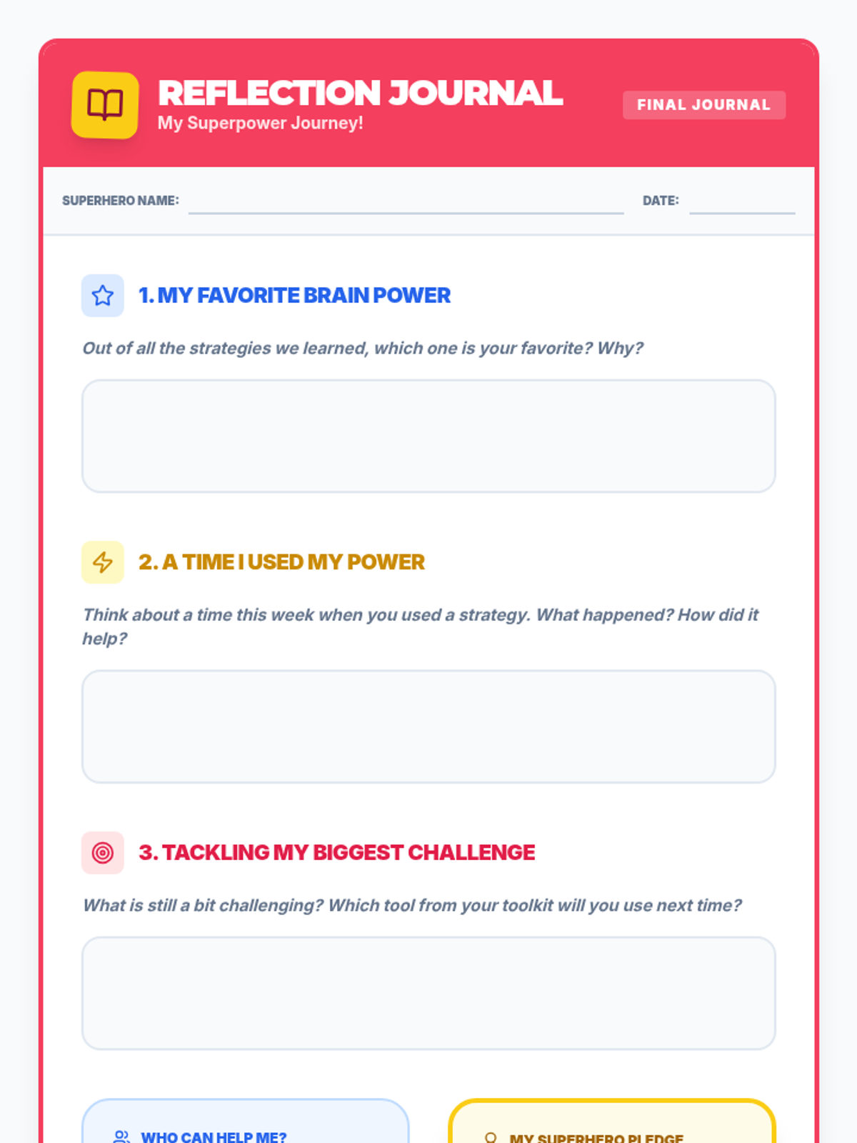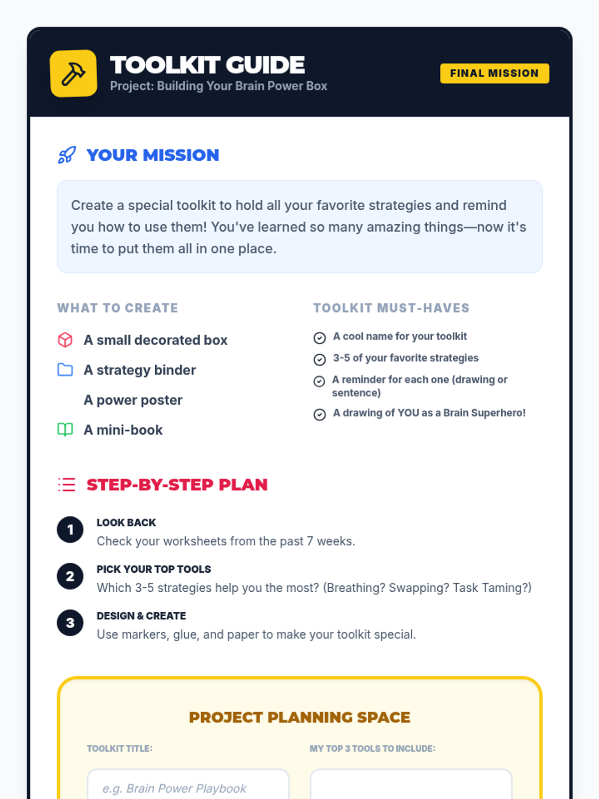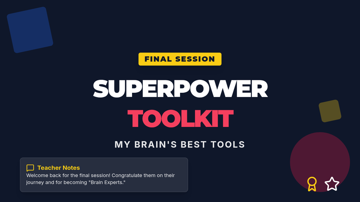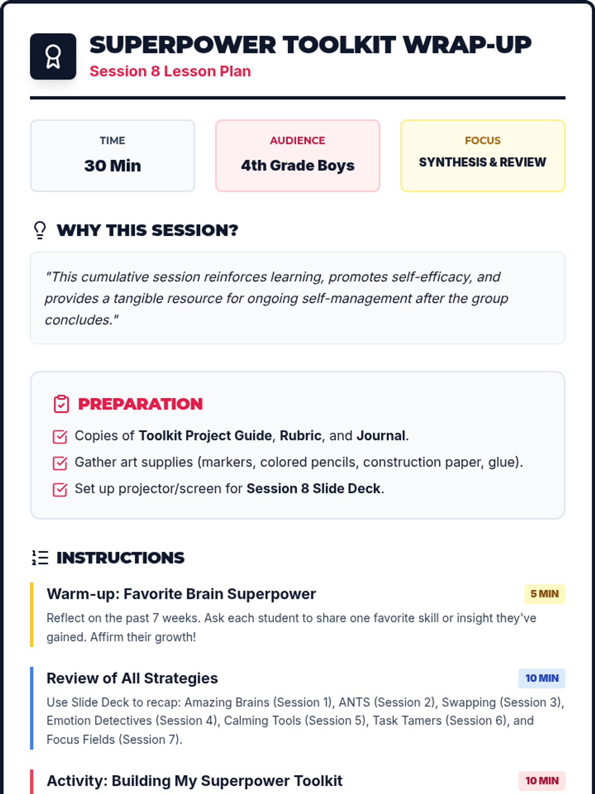 A cumulative session where students review all learned skills and create a physical or digital "Superpower Toolkit" for ongoing use after the group ends.