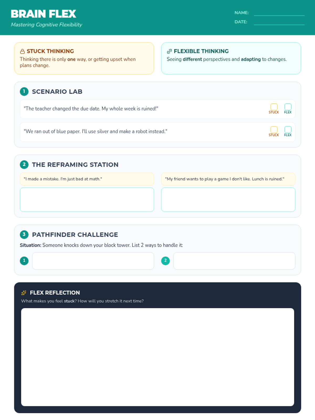This lesson introduces students to the concept of cognitive flexibility, helping them distinguish between 'stuck' (rigid) thinking and 'flexible' thinking through scenarios and reframing exercises.