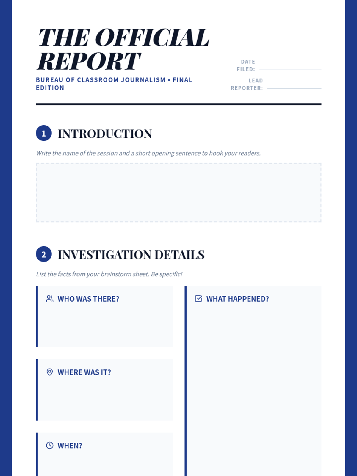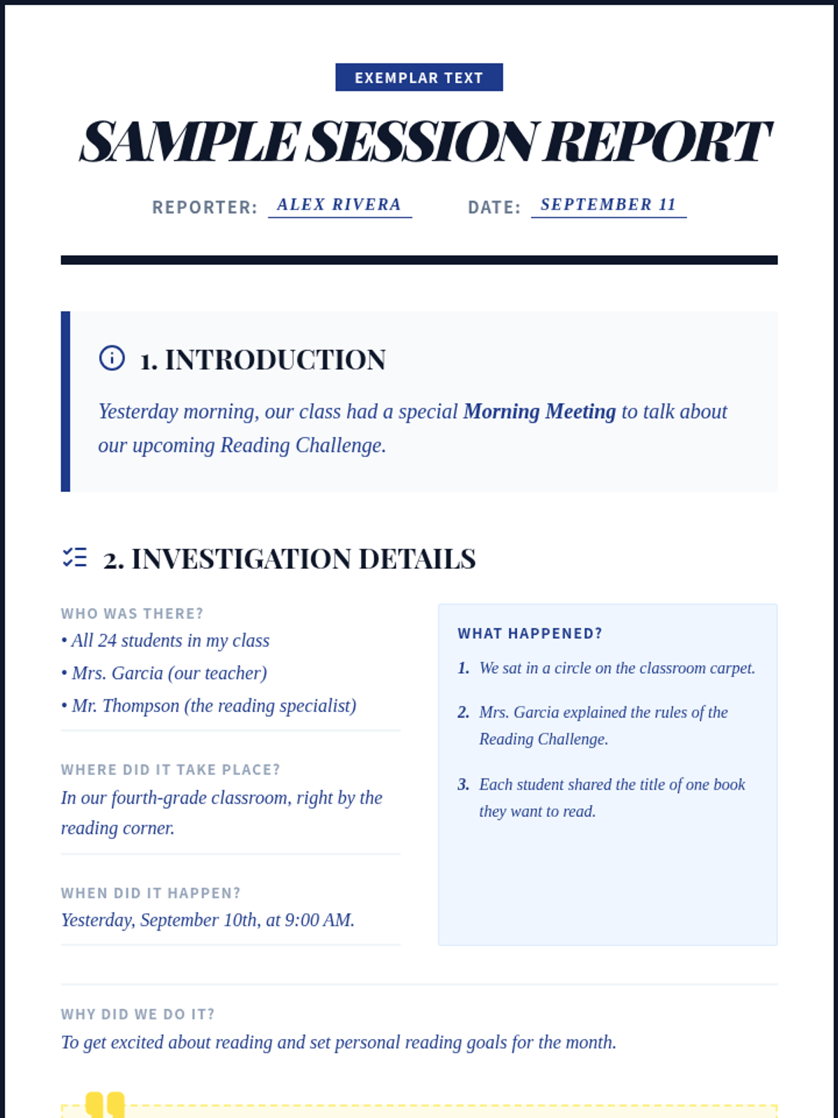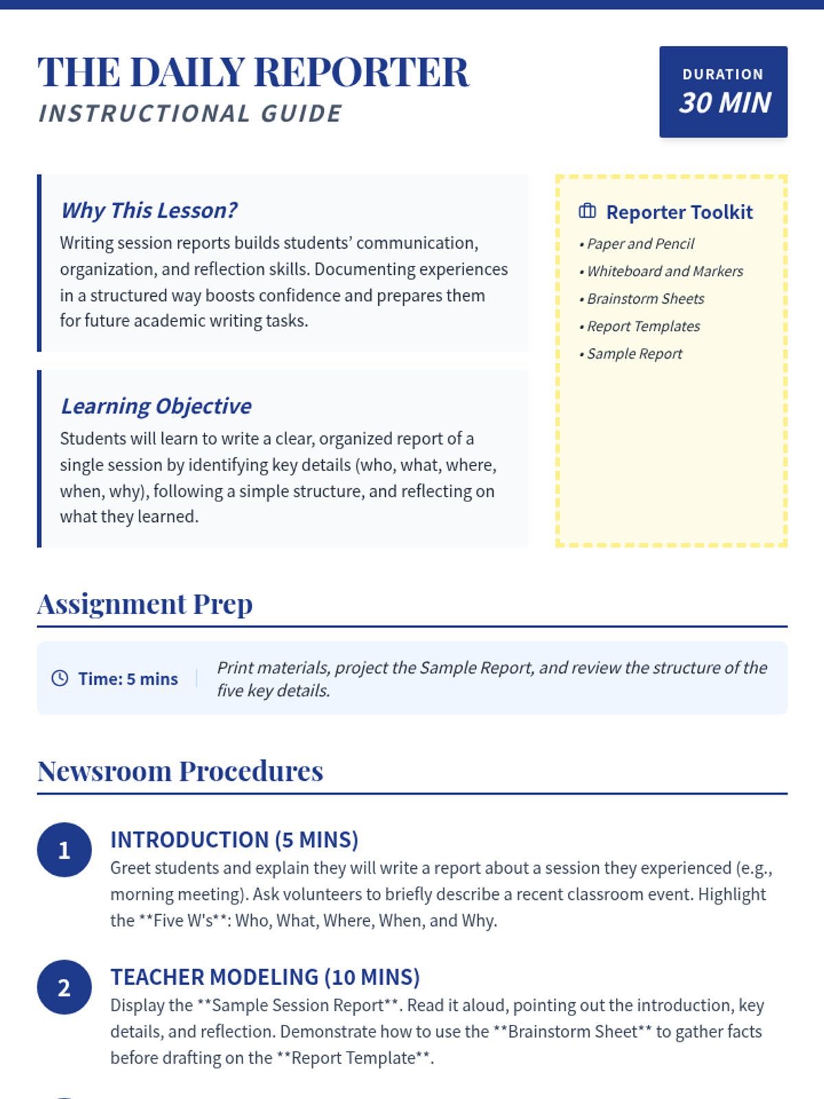 Students will learn how to write a clear, organized report about a single session or event by identifying key details (who, what, where, when, why), using a simple structure, and reflecting on their experience.