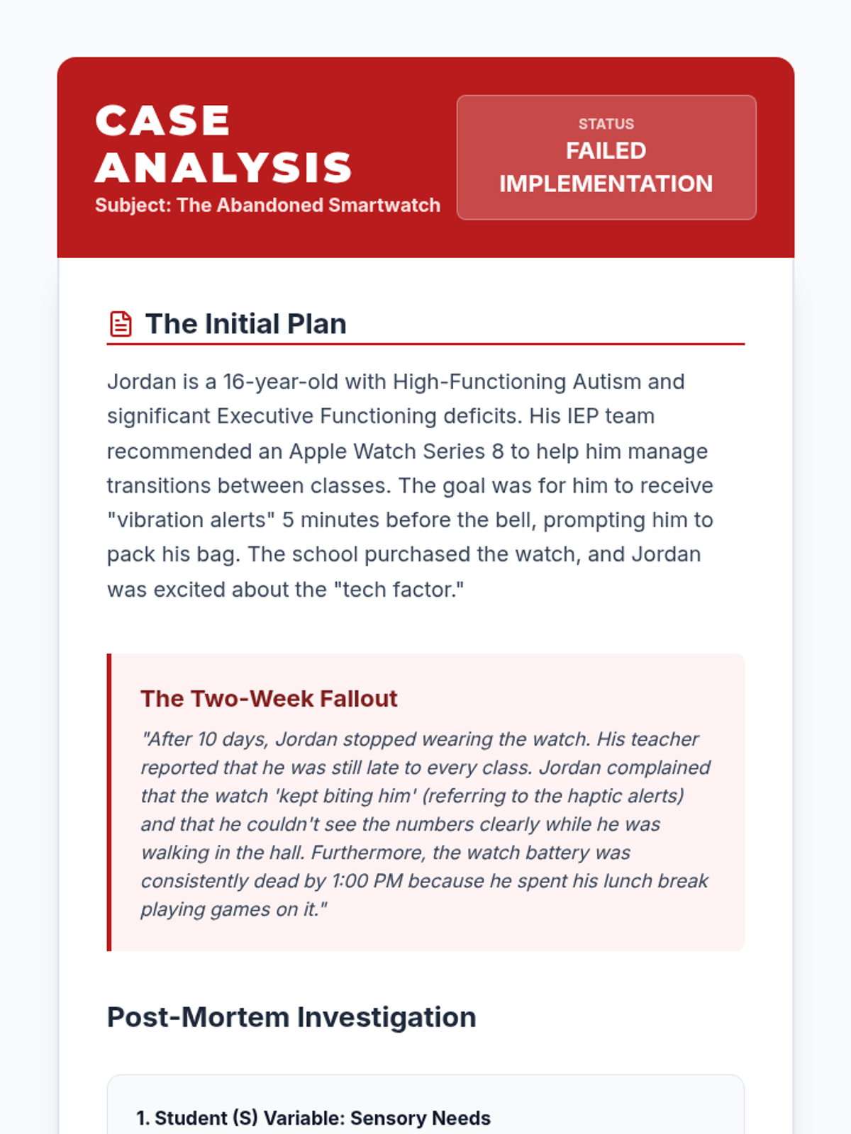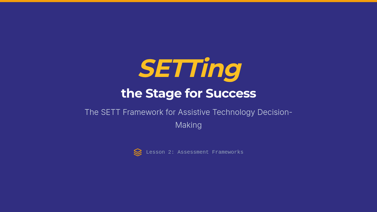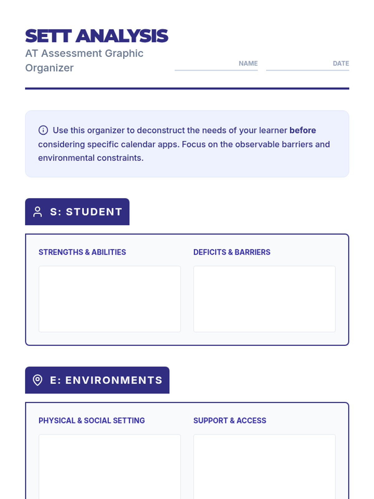 Students are introduced to the SETT framework (Student, Environments, Tasks, Tools) as a collaborative decision-making model for assistive technology. They practice applying the framework to analyze how the context of a user's life shapes their scheduling needs.