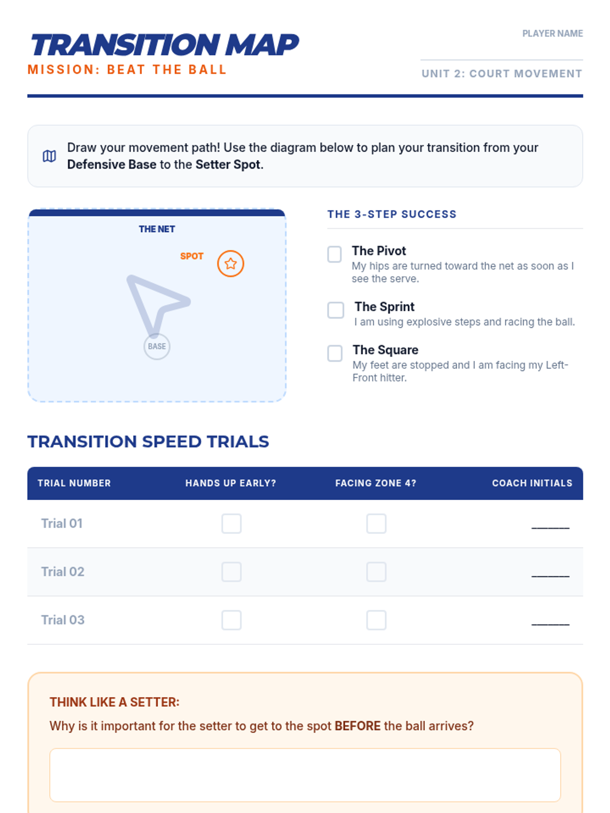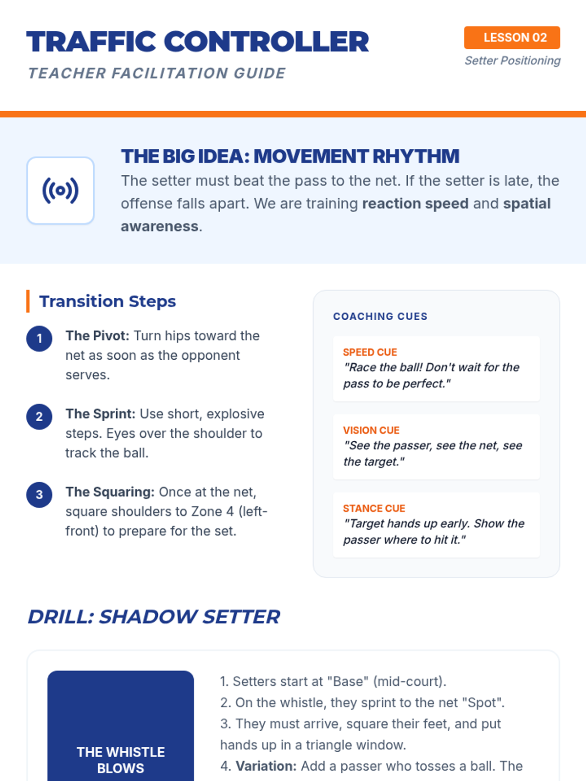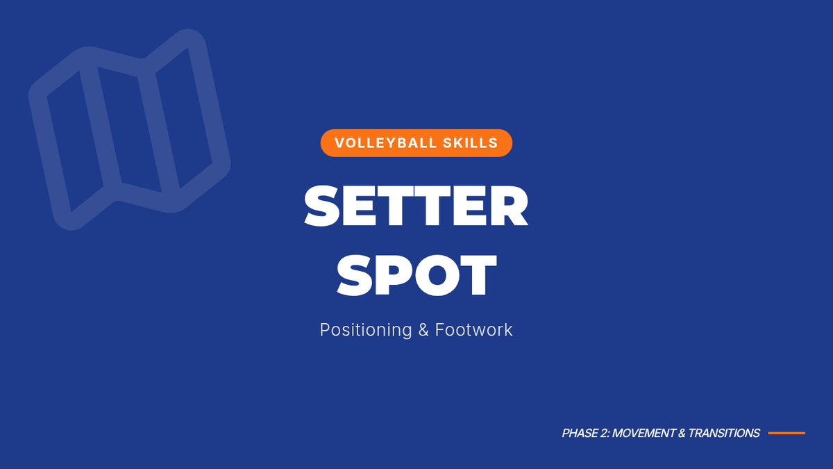 Students practice moving from a defensive base to the 'setter spot' at the net. Drills involve transitioning quickly after a ball is passed to be ready to set the second contact.