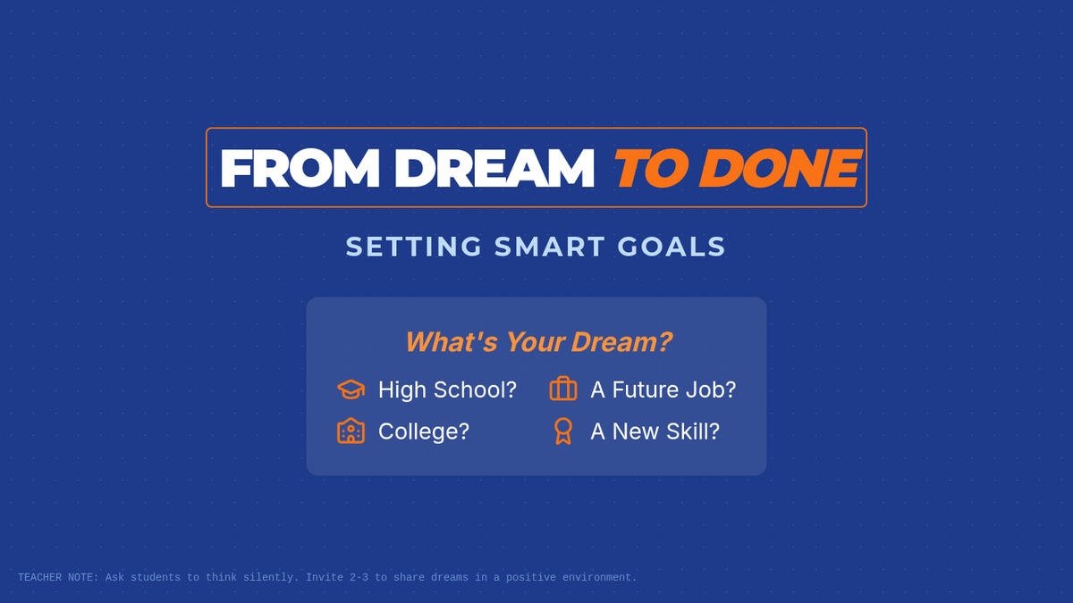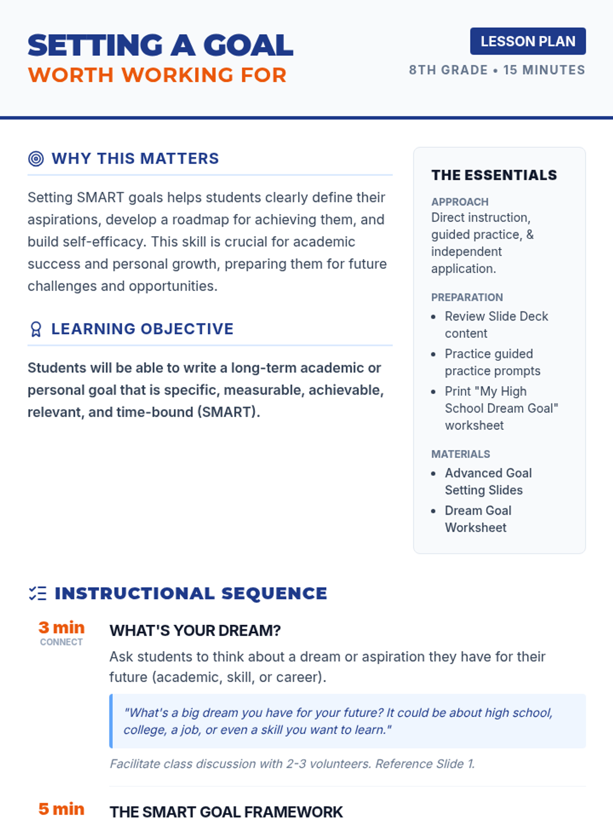 A 15-minute lesson for 8th graders to master the SMART goal framework, turning future dreams into actionable plans for high school and beyond.