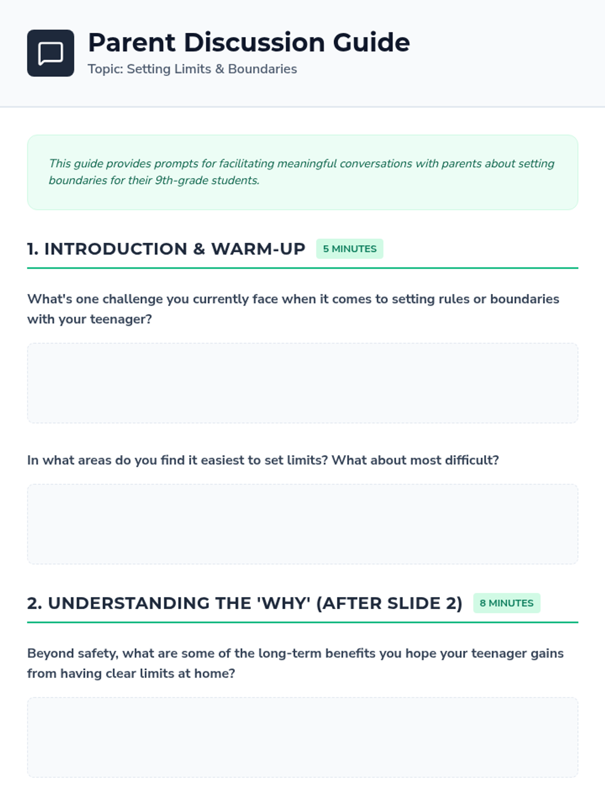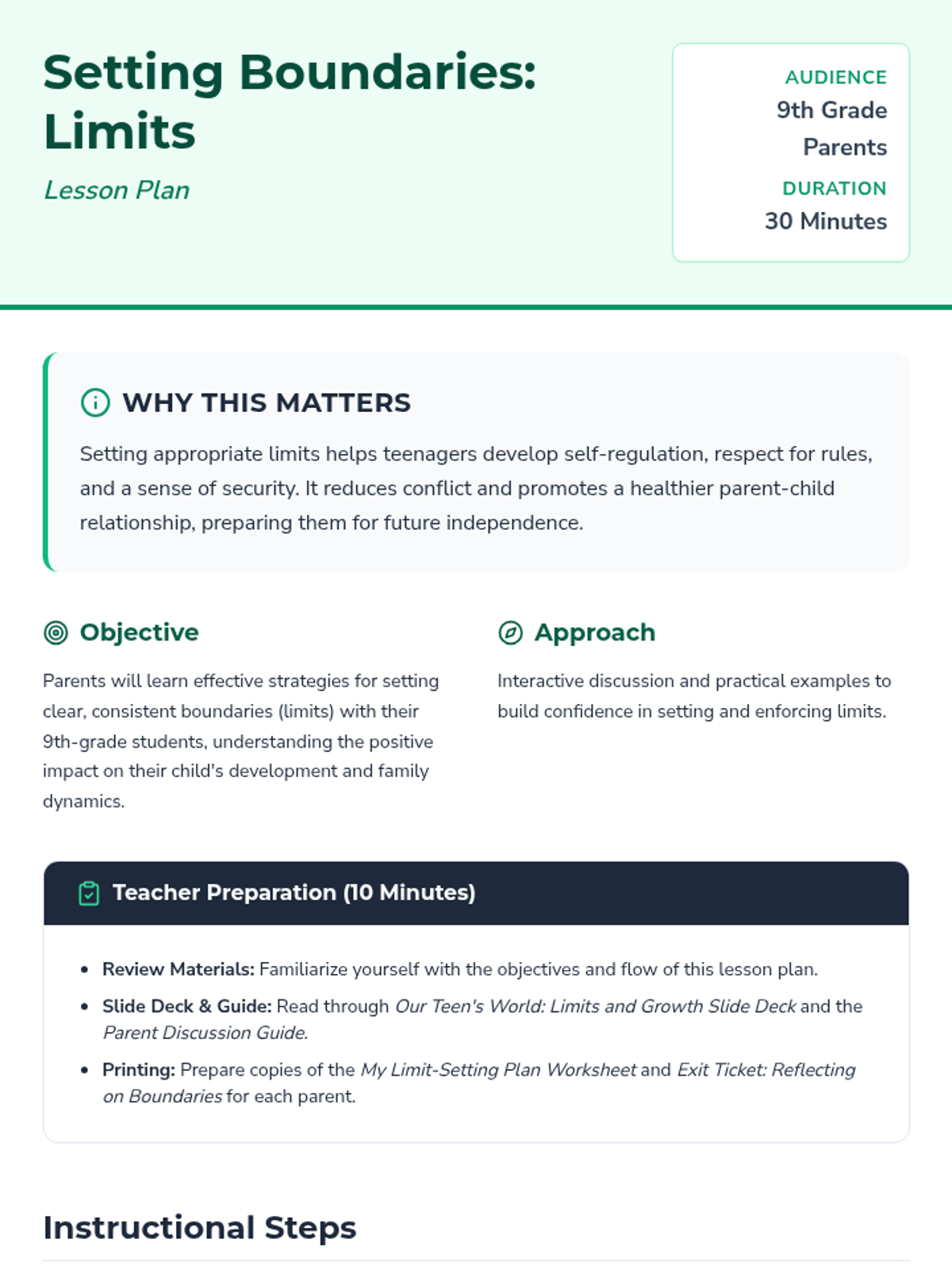 This lesson helps parents of 9th-graders understand the developmental importance of setting clear limits and provides practical strategies for communicating and enforcing boundaries effectively.