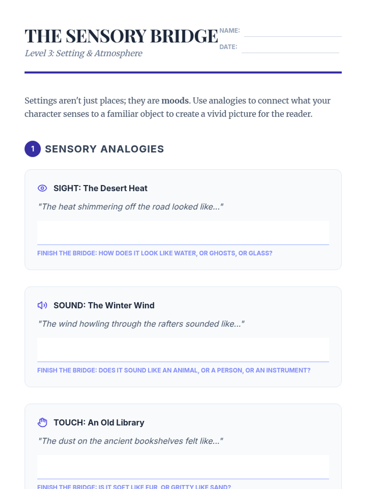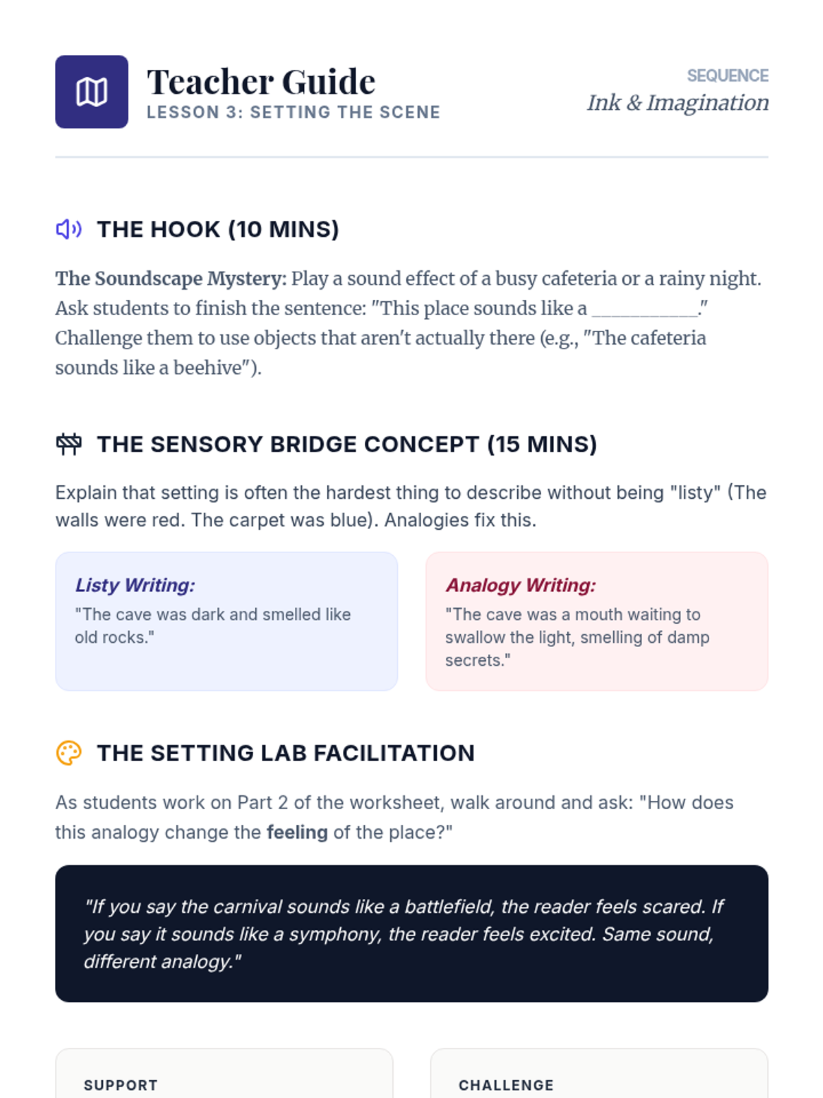This lesson teaches students to build 'sensory bridges' by using analogies to describe settings through sound, smell, and sight.