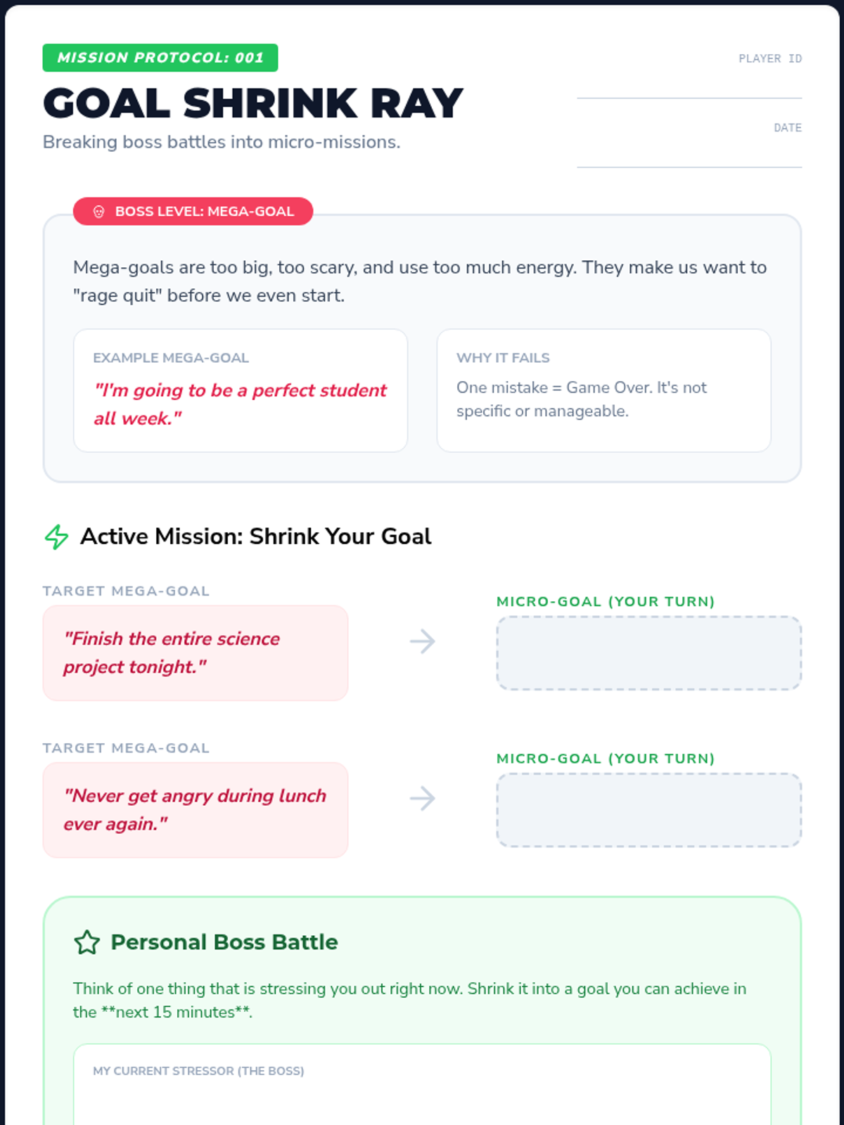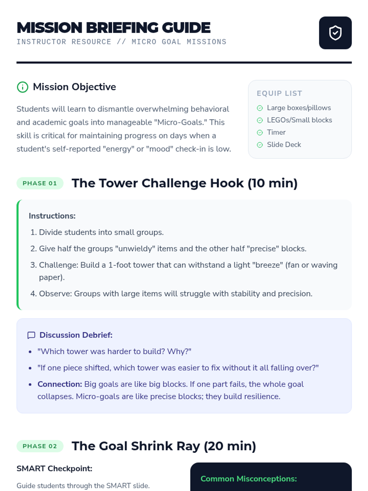 Students learn to break down larger tasks into tiny, manageable goals suitable for days when their check-in indicates low energy. They practice the SMART goal framework applied to behavioral regulation.