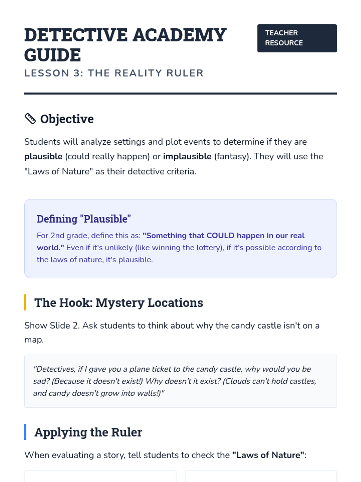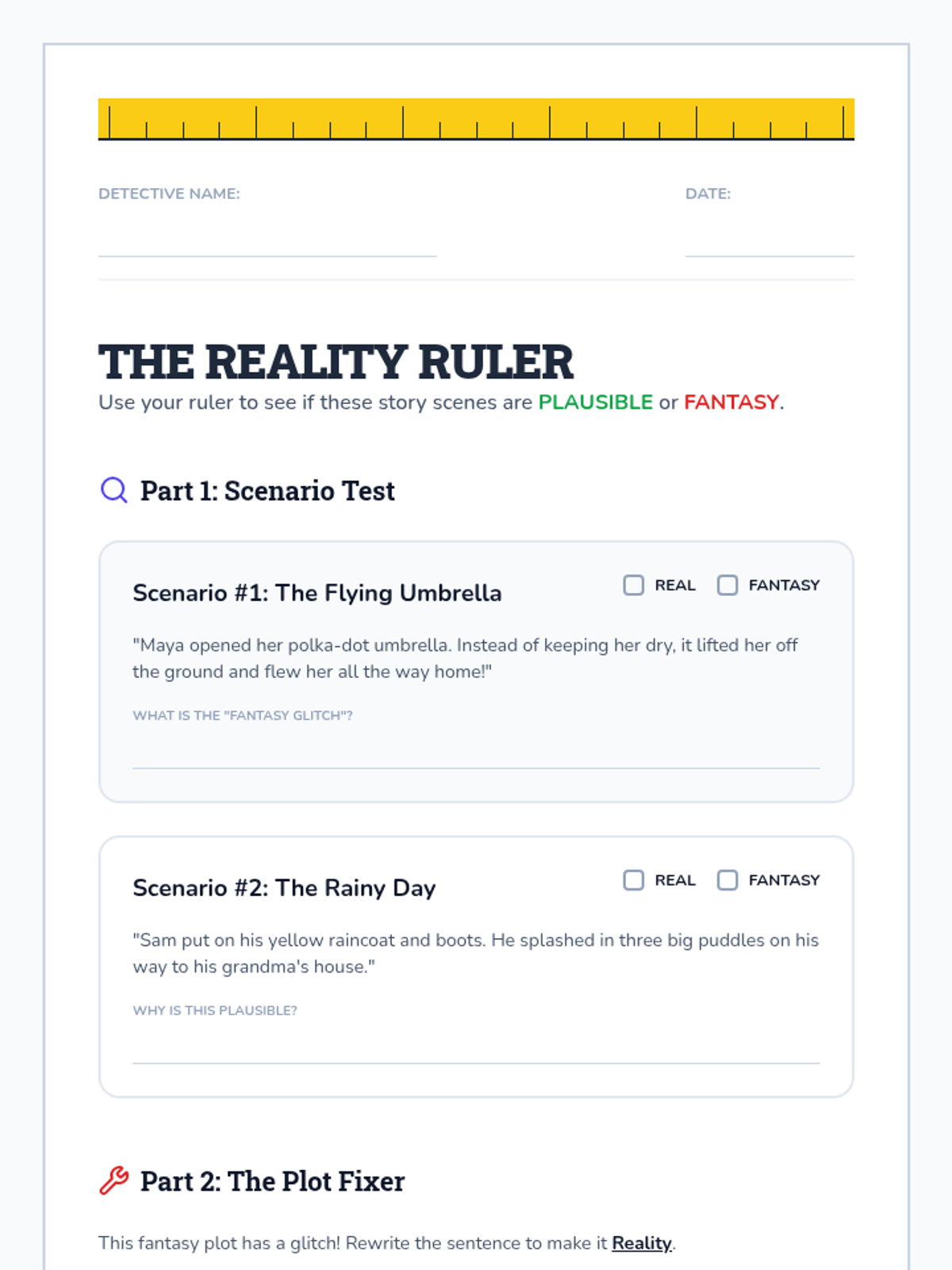 Students evaluate settings and plots using a 'Plausibility Checklist'. They explore how the laws of physics and nature differ in fantasy stories.