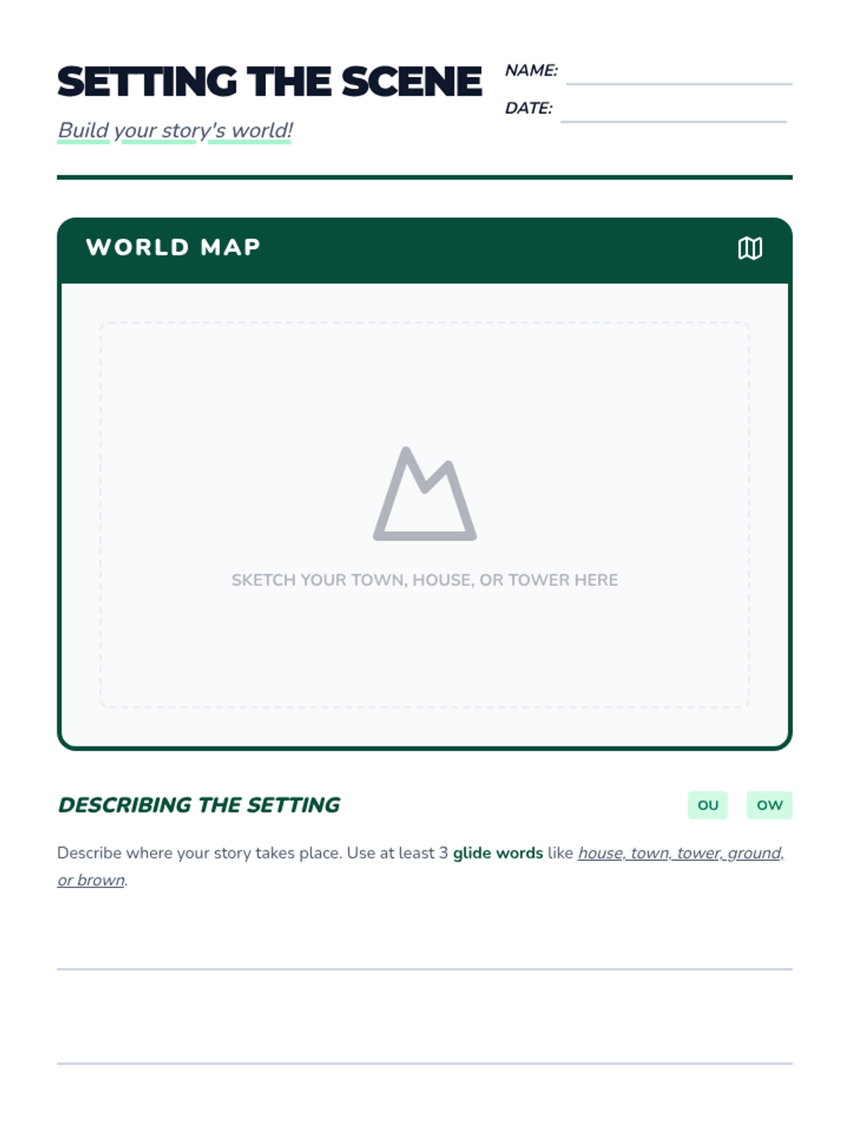 Focusing on the /ou/ and /ow/ sounds, students describe a setting. They write about a 'house', 'town', 'tower', or 'ground', ensuring they spell the vowel glides correctly while establishing a location for their story.