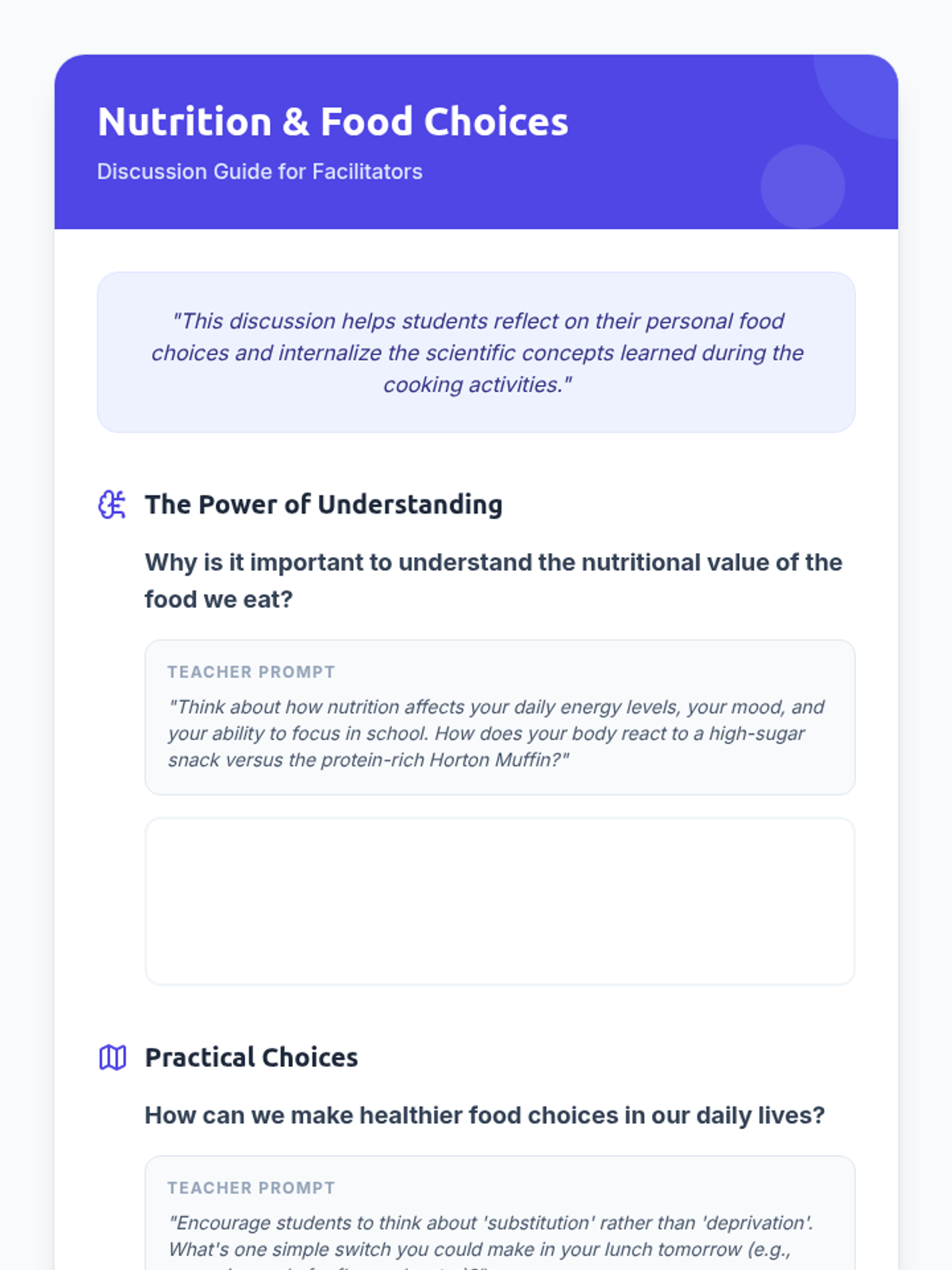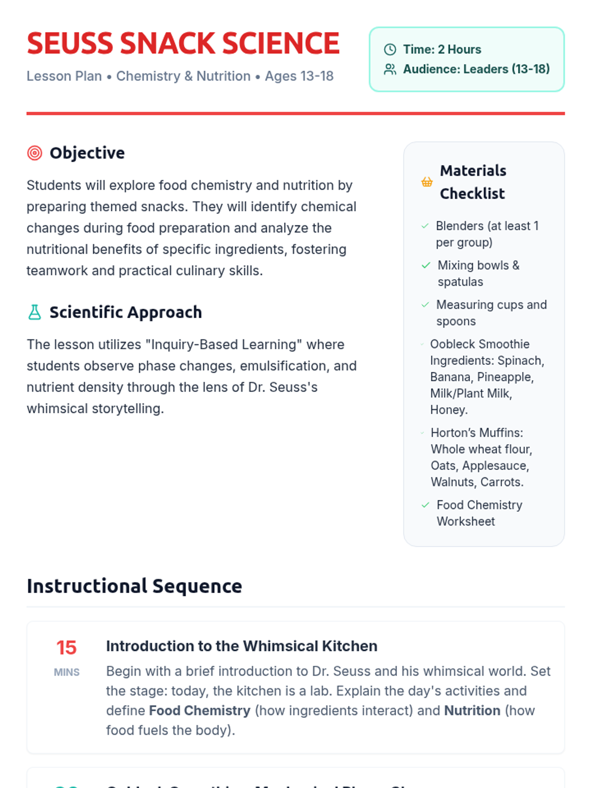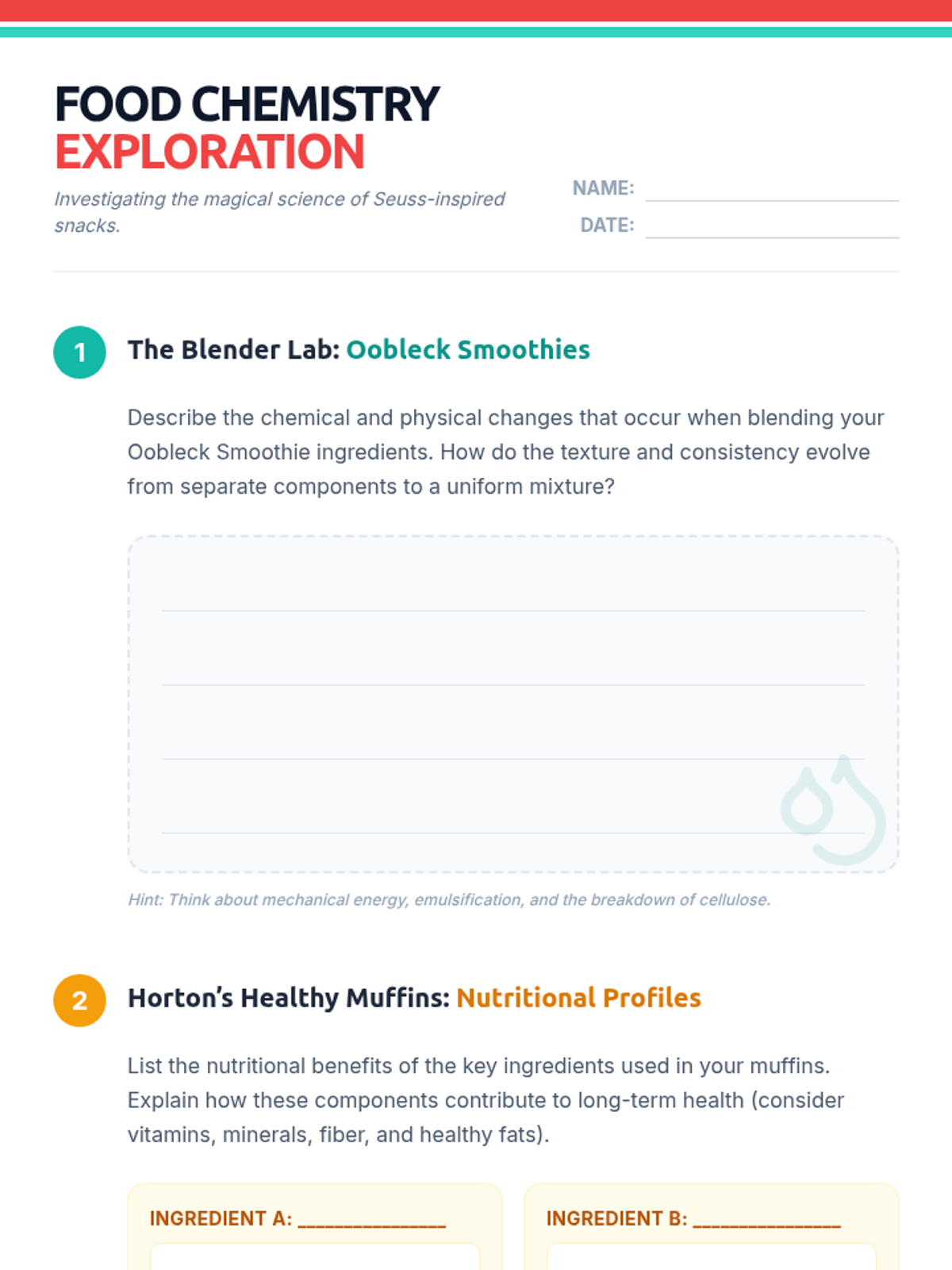 Students explore food chemistry and nutrition through Dr. Seuss-inspired recipes, making 'Oobleck Smoothies' and 'Horton’s Healthy Muffins' to understand chemical reactions and nutritional value.