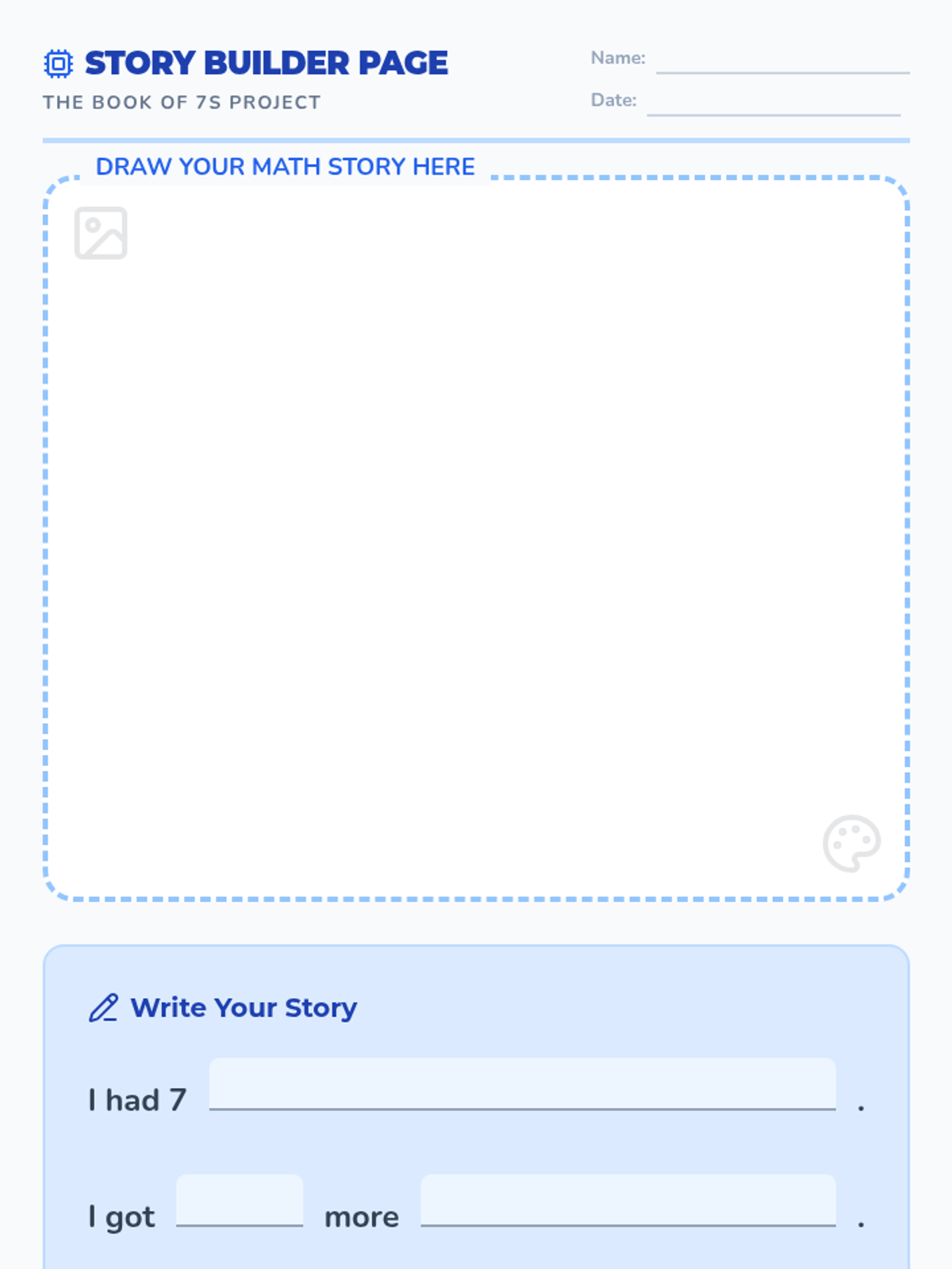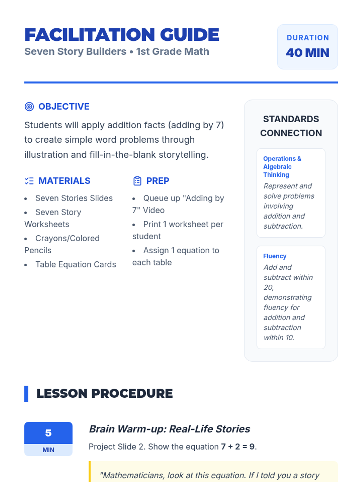 A 1st Grade math lesson where students use the 'Adding by 7 Song' to turn addition equations into creative real-life stories and illustrations, culminating in a class book.