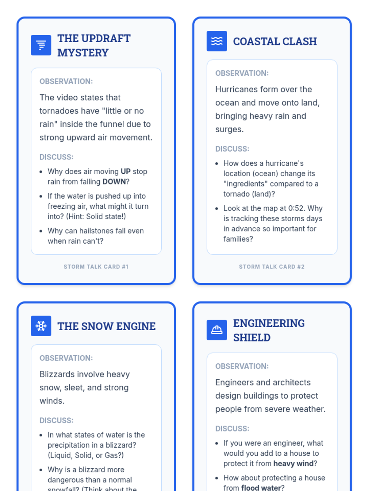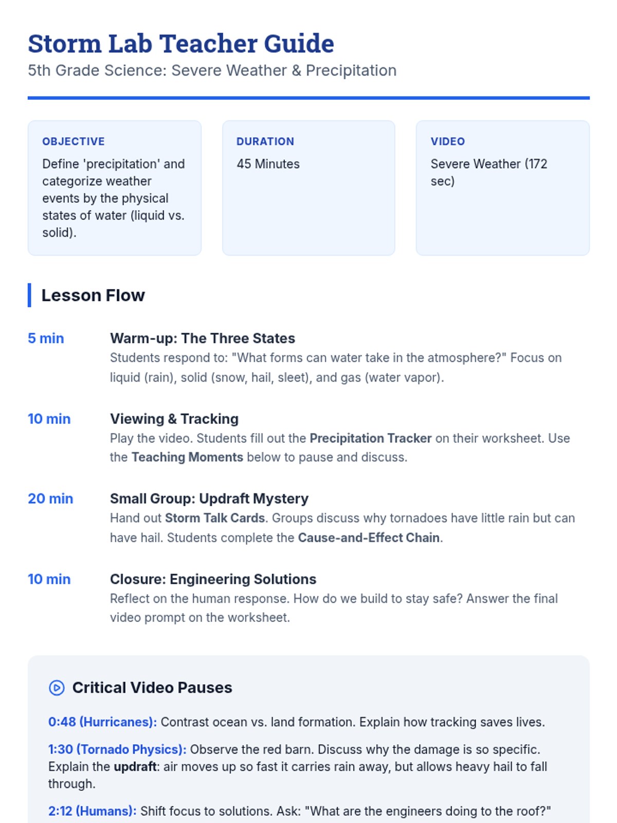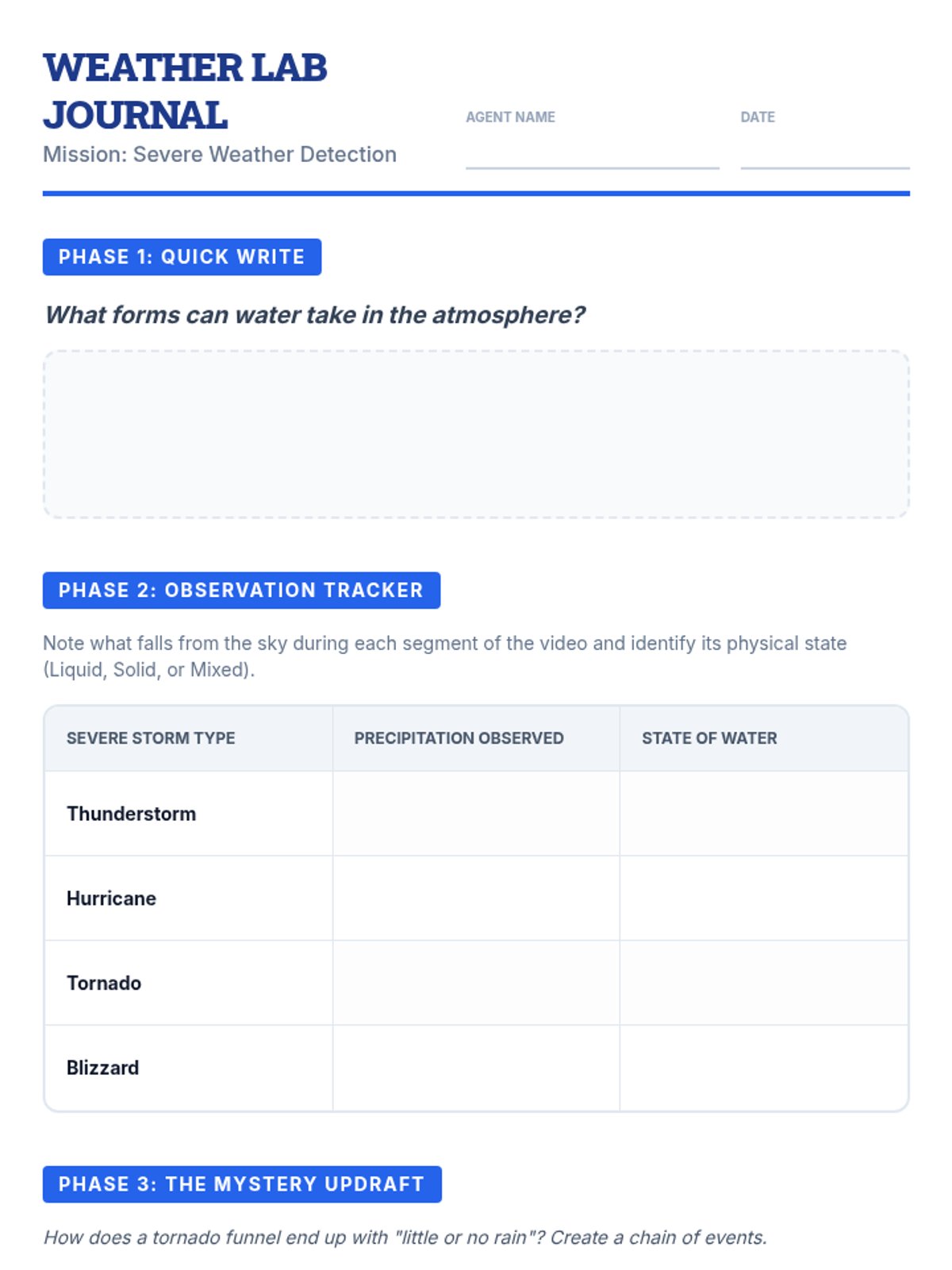 Students will define precipitation and categorize severe weather events (thunderstorms, hurricanes, tornadoes, and blizzards) based on the physical states of water and the forces that drive them, including atmospheric updrafts.