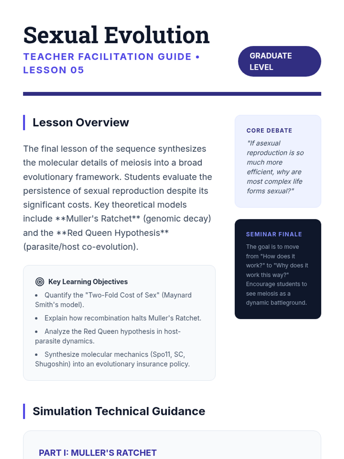 Synthesize the evolutionary costs and benefits of meiosis, modeling Muller's Ratchet and the Red Queen hypothesis to understand the persistence of sexual reproduction.