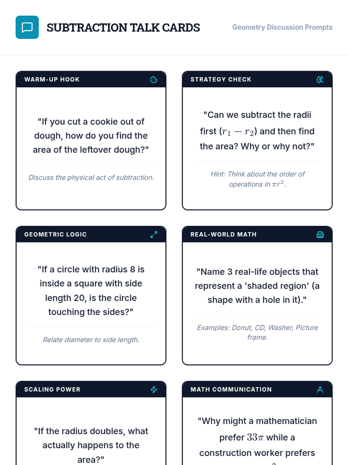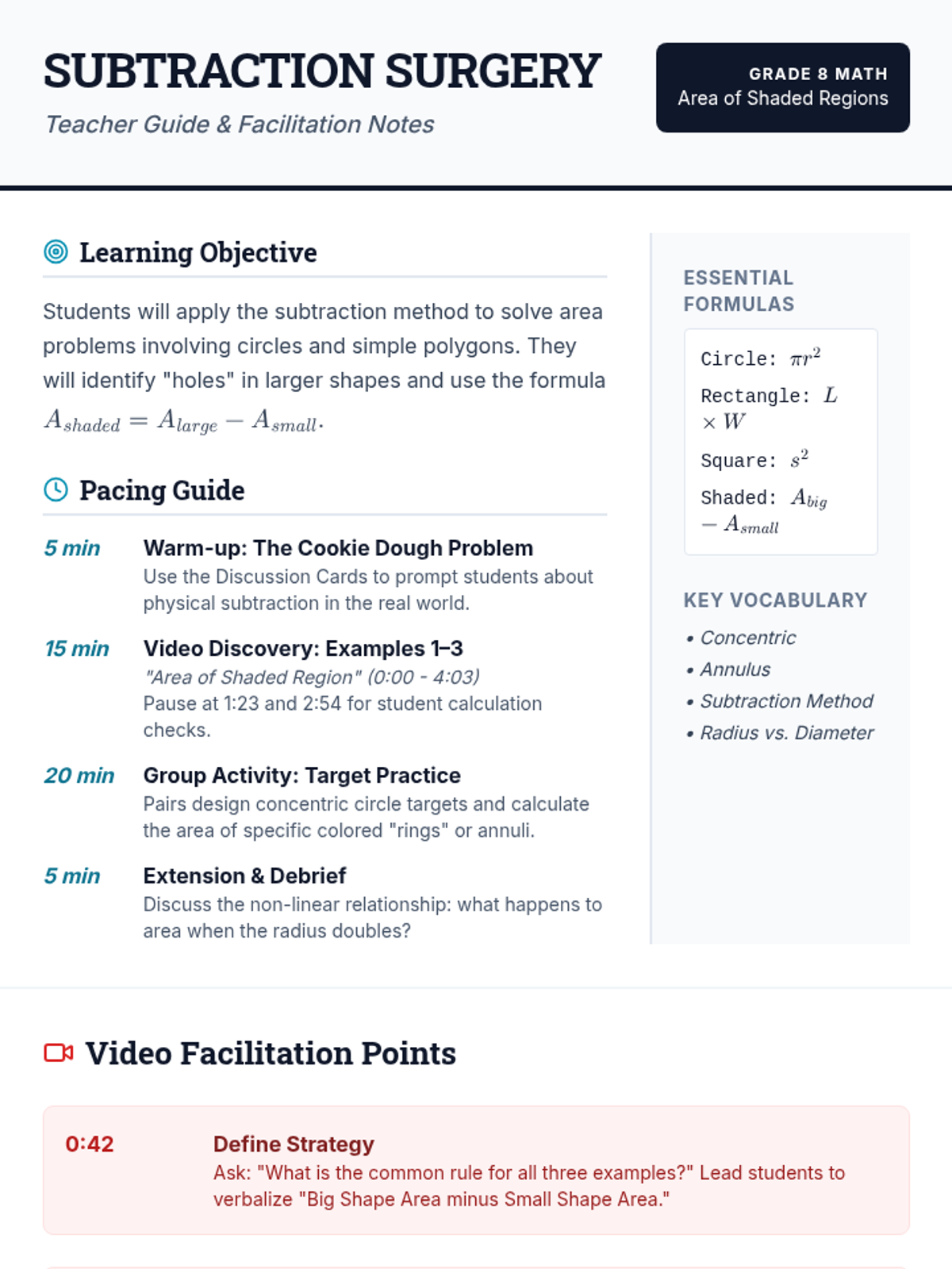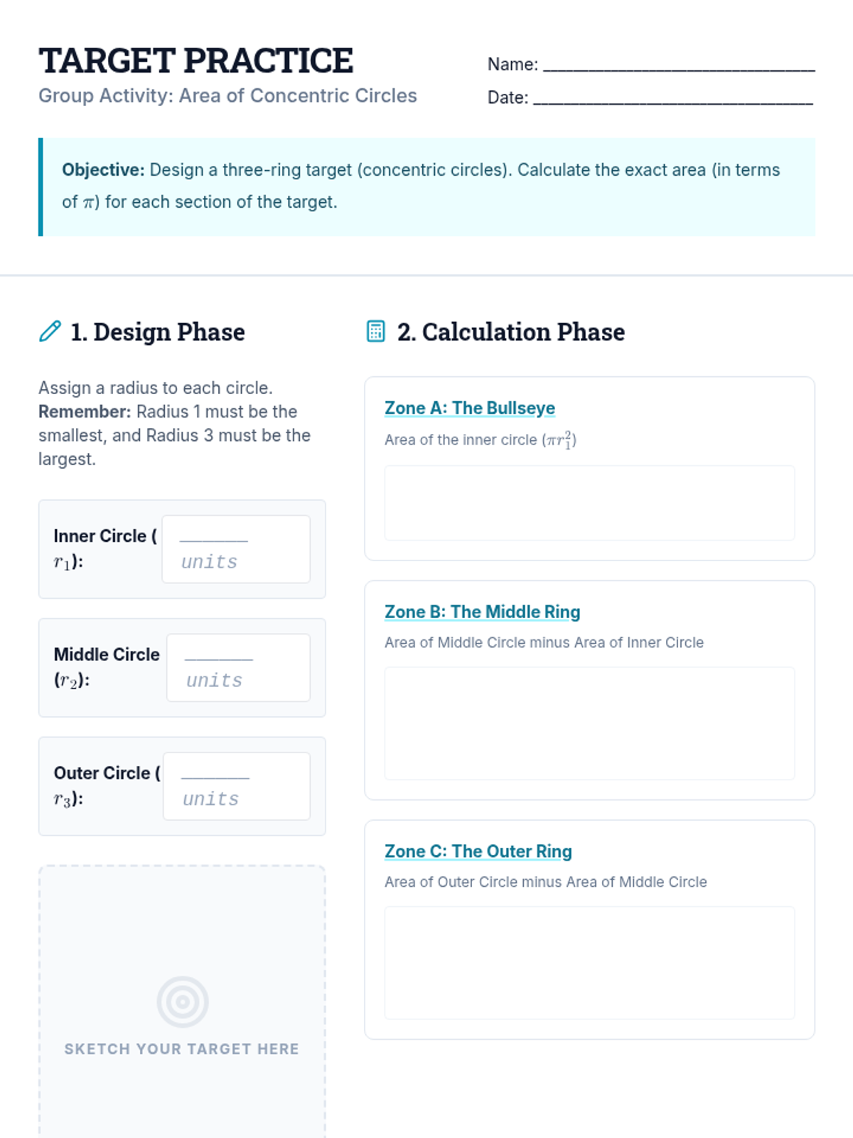 Students learn to calculate the area of shaded regions by subtracting the area of smaller shapes from larger ones, focusing on circles, squares, and rectangles. The lesson includes a video-based walkthrough and a hands-on activity designing and measuring concentric circles.