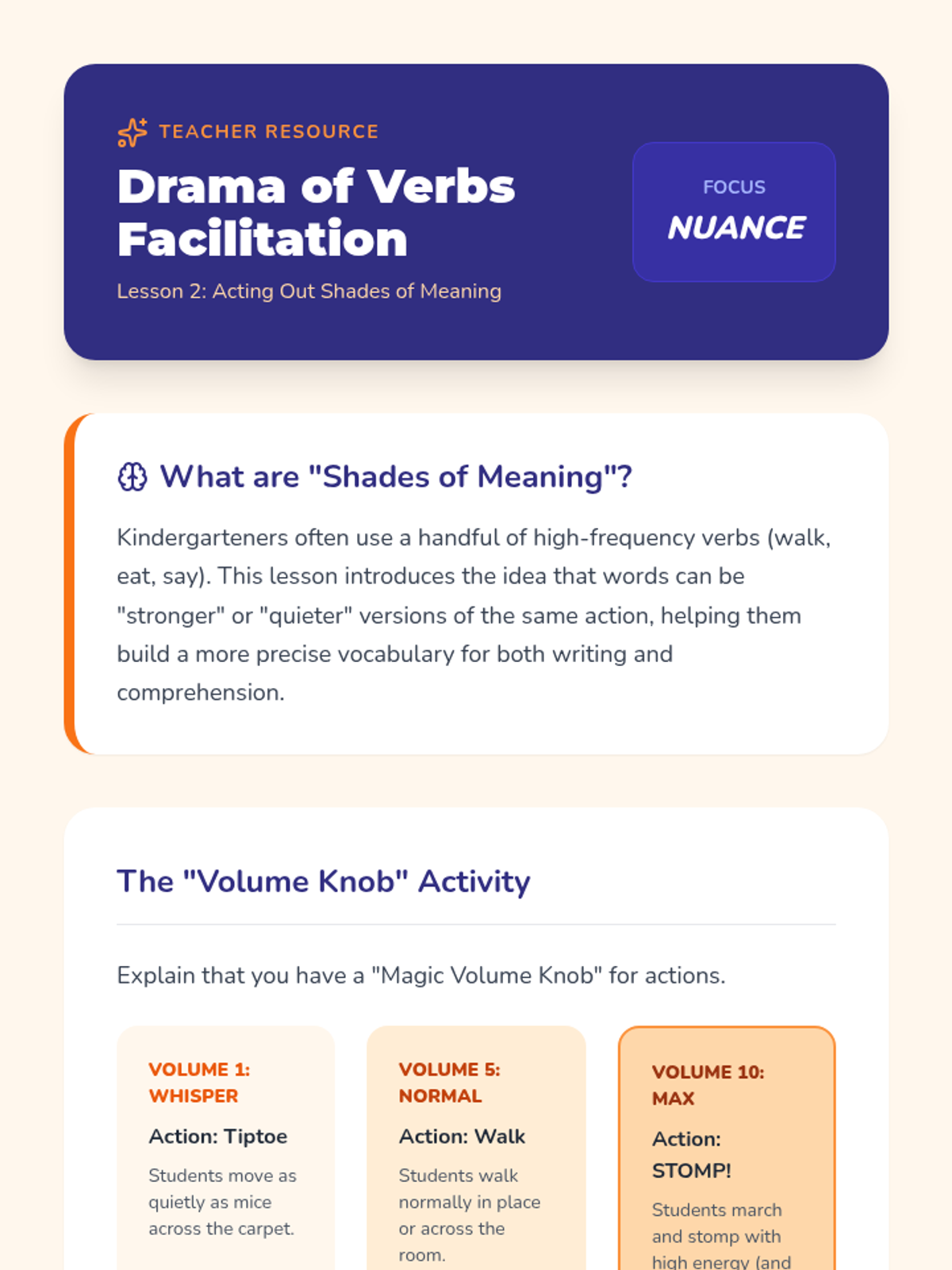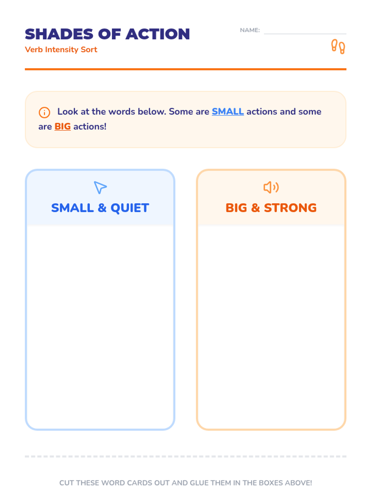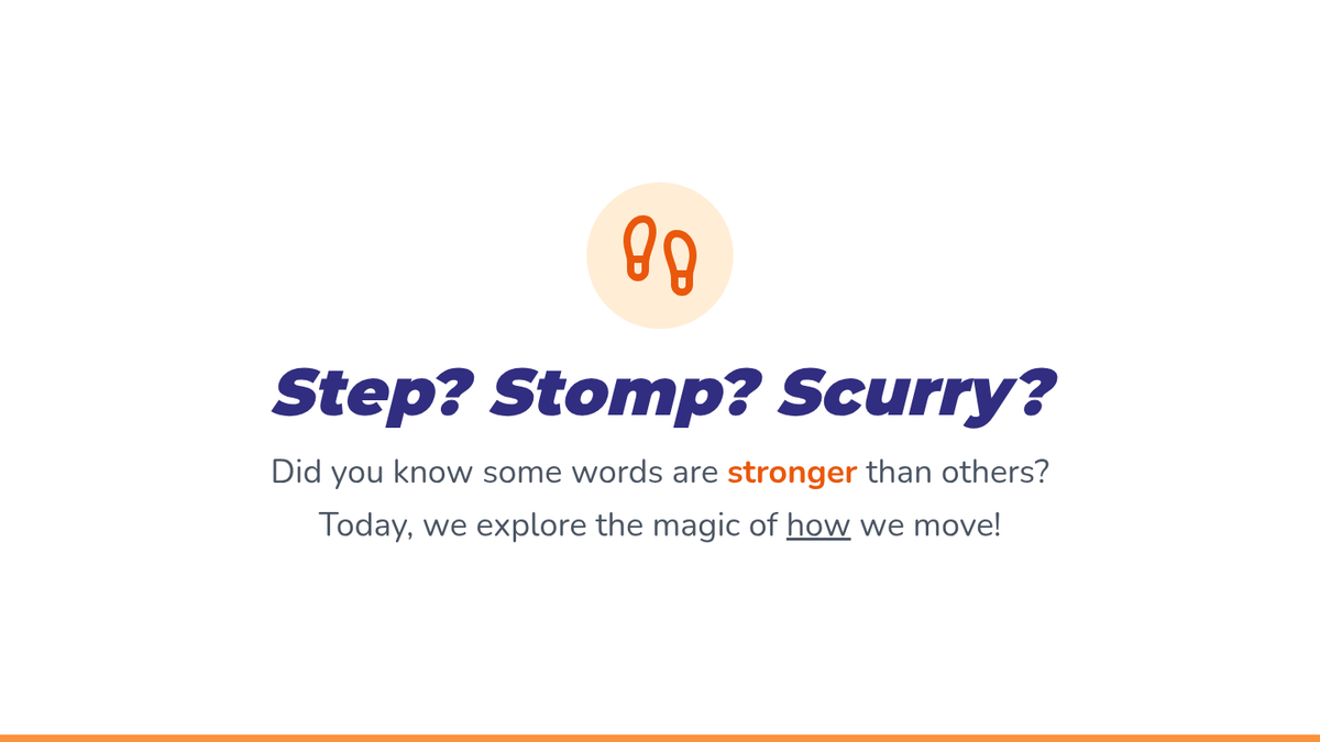 Students explore how different verbs describe the same action with different intensities, such as walking versus stomping.
