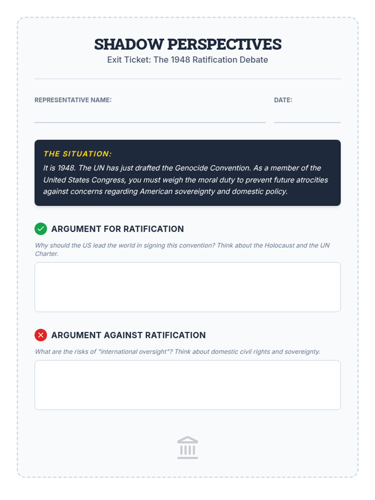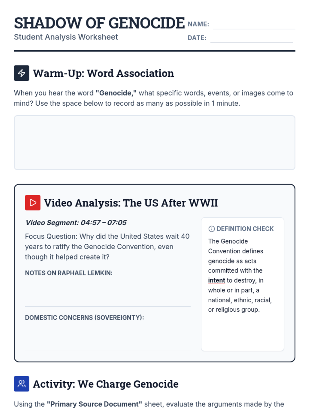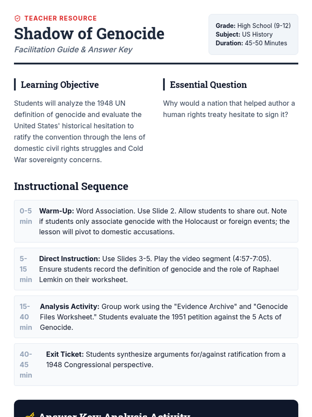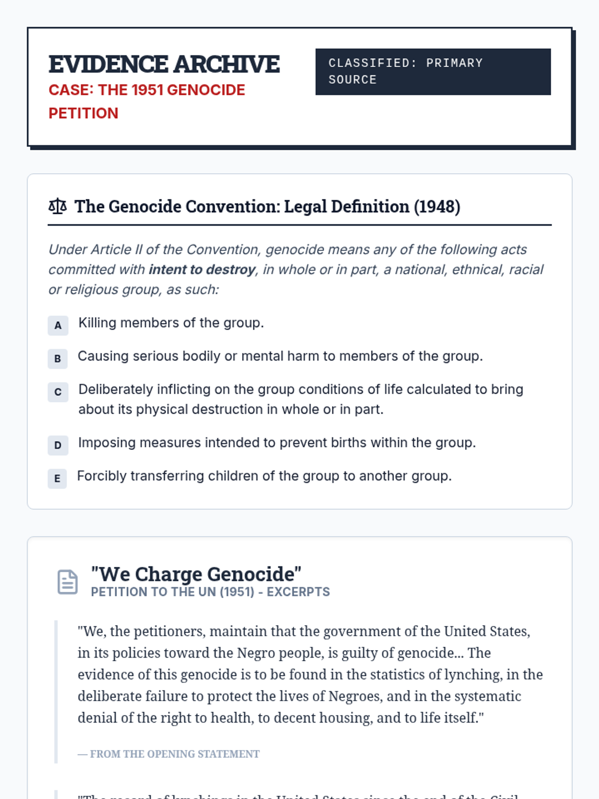 Students investigate the definition of genocide and the United States' complex relationship with the Genocide Convention through the lens of the 1951 'We Charge Genocide' petition. They will analyze the 5 acts of genocide and evaluate arguments for and against ratification from a Cold War perspective.