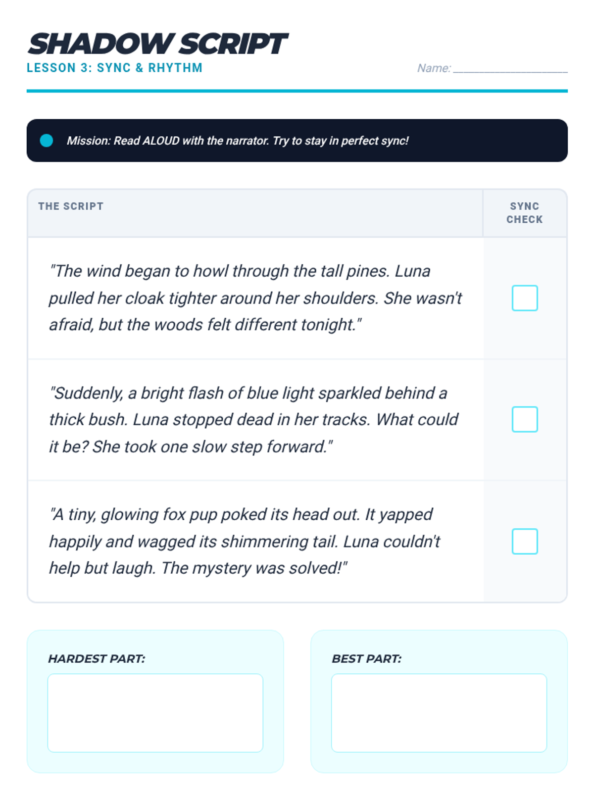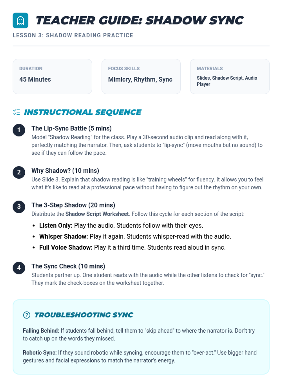 Students engage in shadow reading, reading aloud slightly behind an audio narrator to match their speed, rhythm, and intonation.