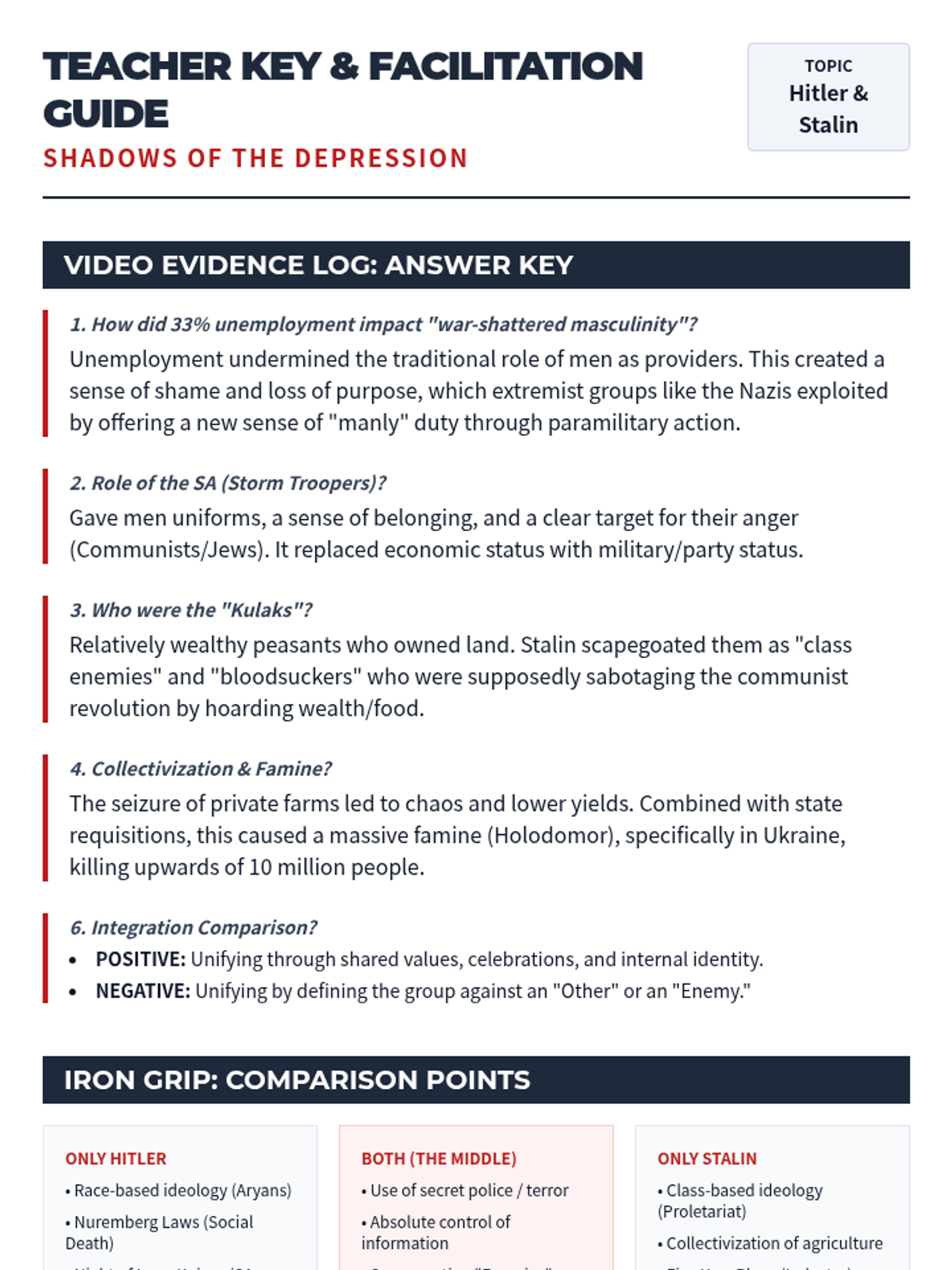This lesson explores the methods used by Benito Mussolini and Adolf Hitler to establish totalitarian regimes in Italy and Germany. Students will analyze tactics such as propaganda, terror, economic manipulation, and cults of personality to understand how 'total' control was achieved.