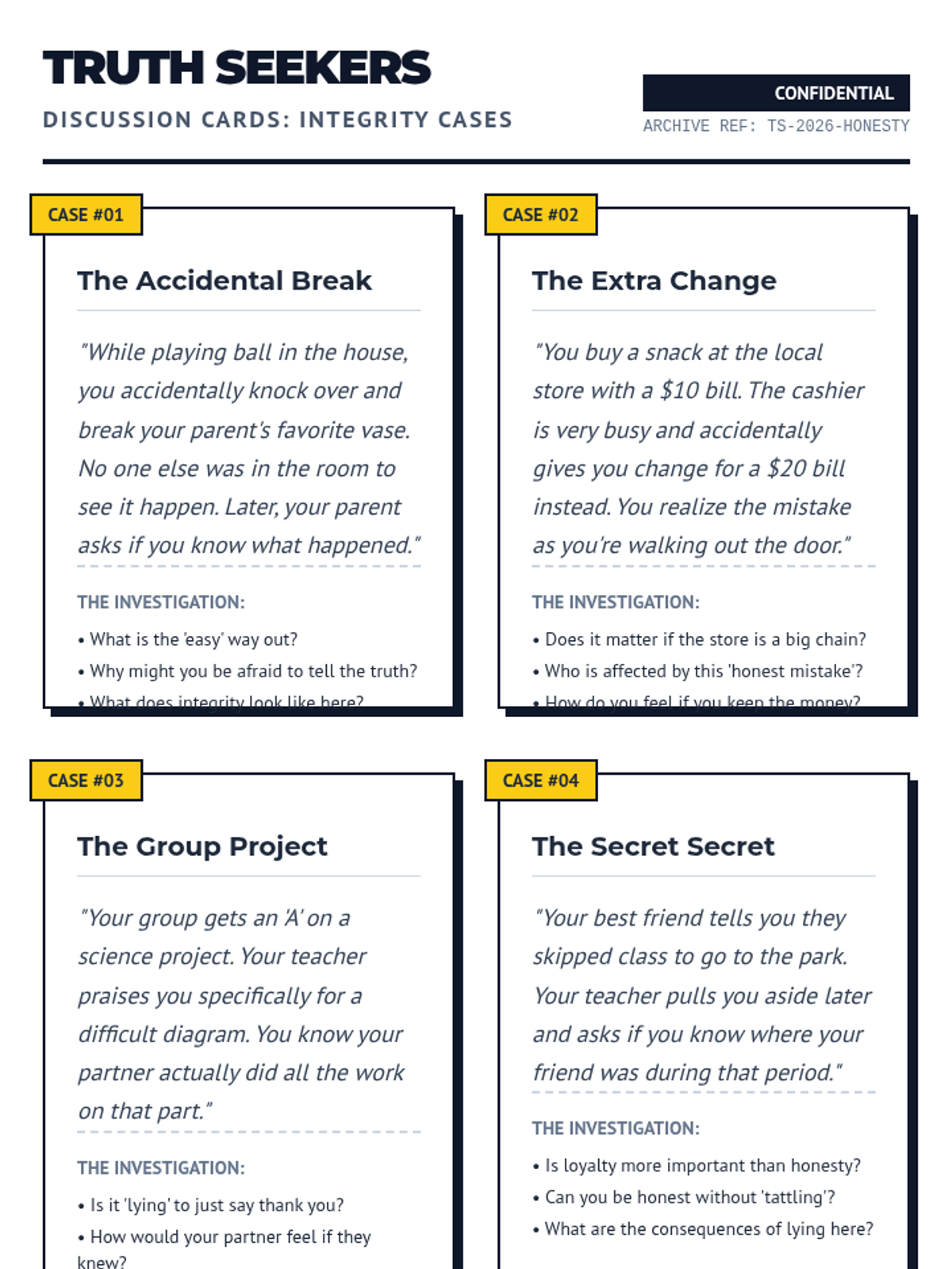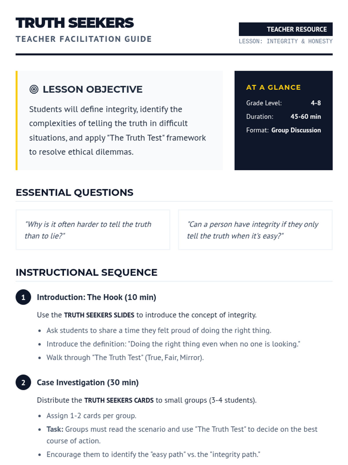 A lesson focused on the value of honesty through real-world scenarios and critical thinking exercises. Students explore what it means to be a person of integrity in difficult situations.