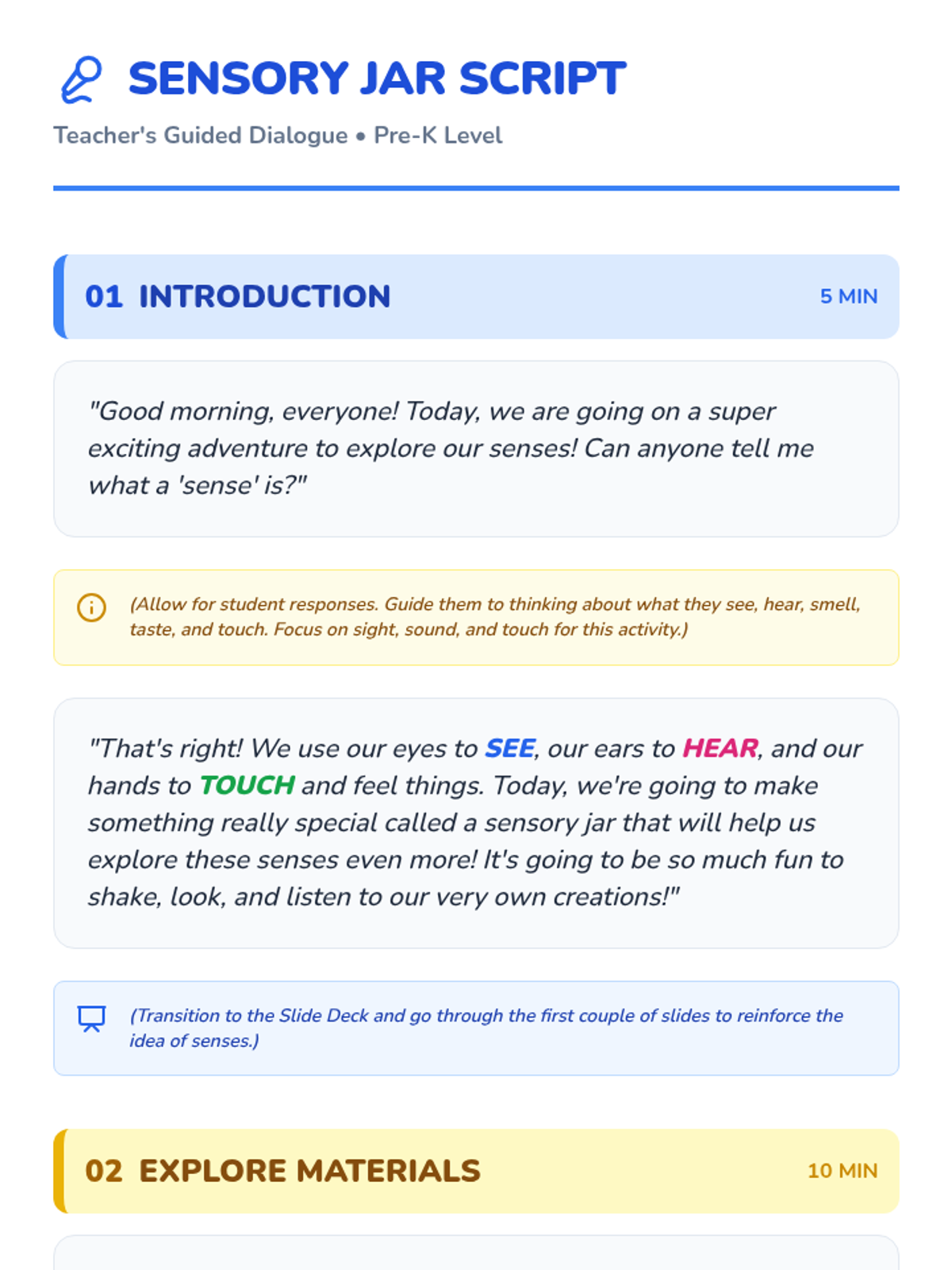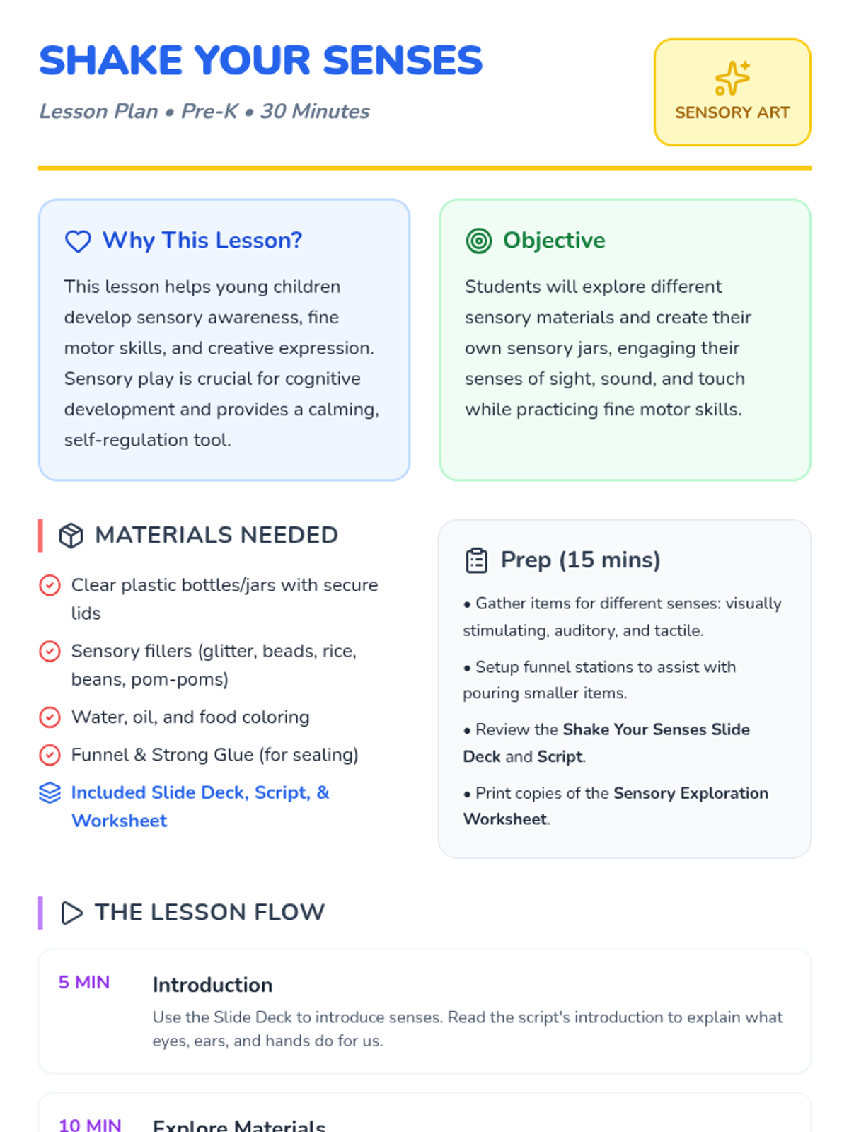 This engaging 30-minute lesson guides Pre-K students through the creation of personalized sensory jars, fostering exploration of sight, sound, and touch while developing fine motor skills and sensory awareness.