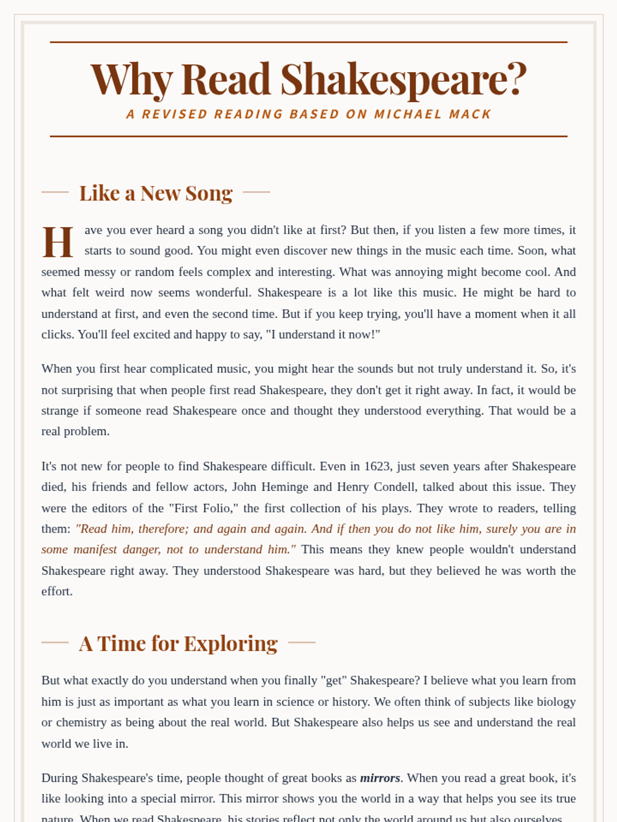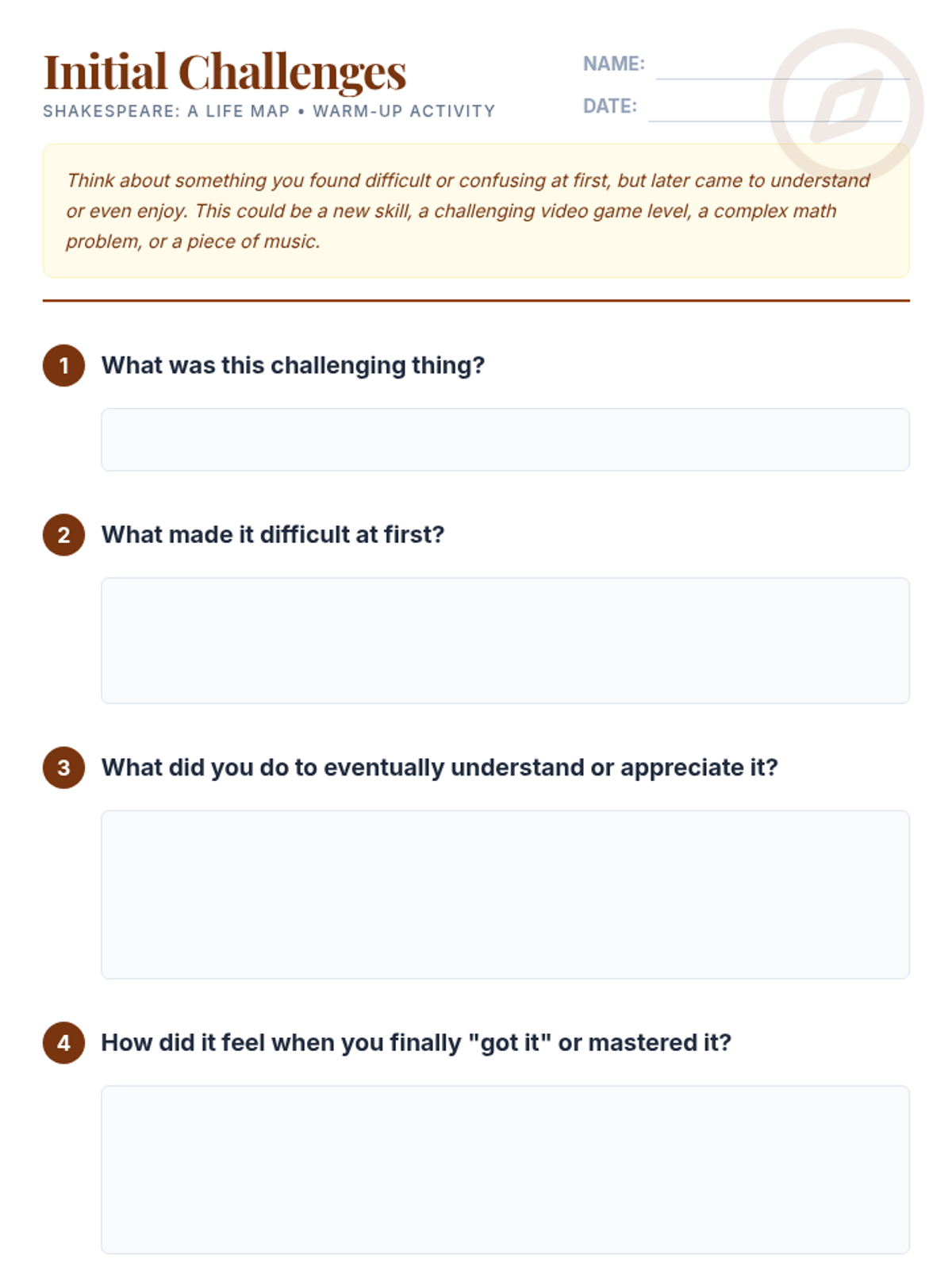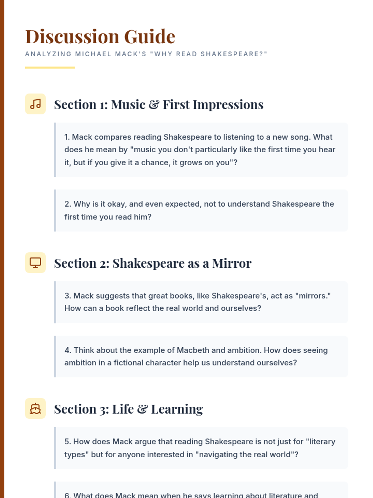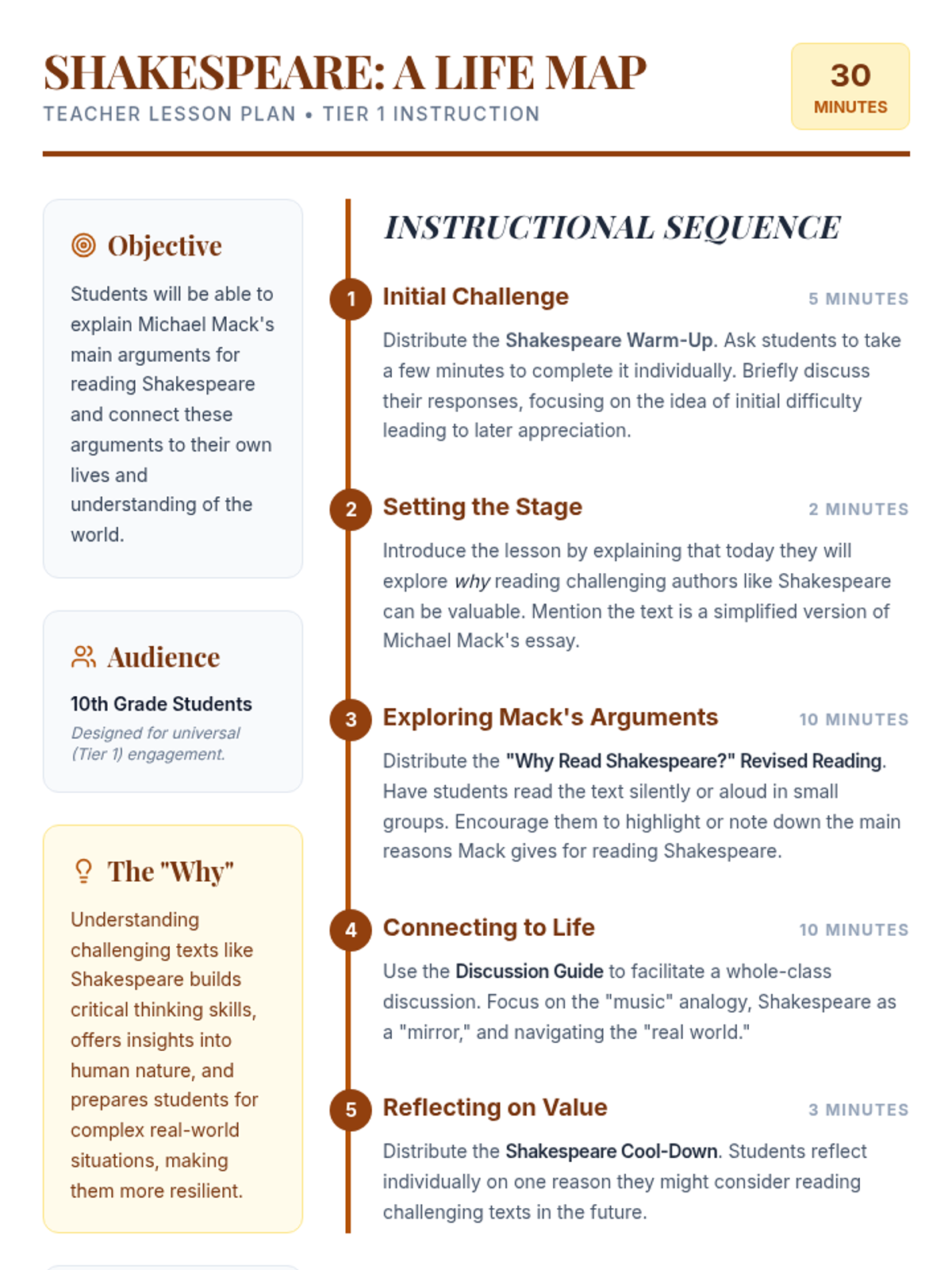 A 30-minute introductory lesson for 10th graders exploring the relevance of Shakespeare through a simplified version of Michael Mack's 'Why Read Shakespeare?'. Students connect the challenges of complex literature to personal growth and navigating the real world.