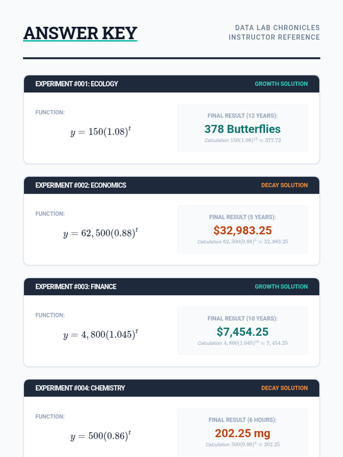 A lesson focused on modeling real-world situations using exponential growth and decay functions, calculating future values over time.
