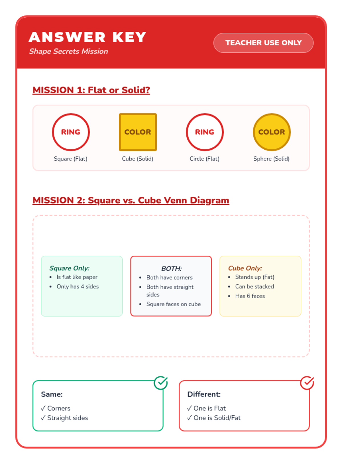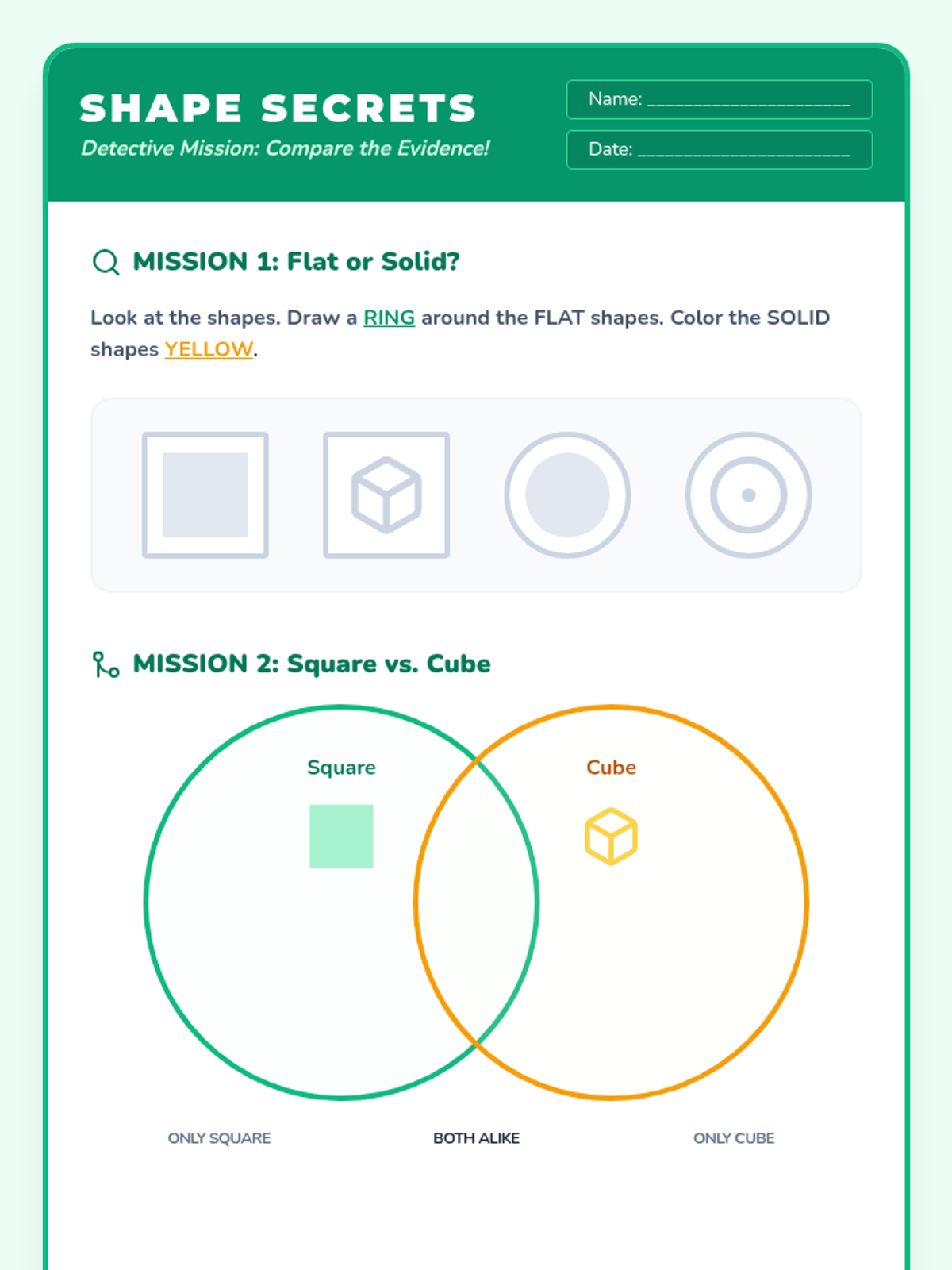 A Tier 2 intervention lesson focusing on comparing 2D and 3D shapes using informal language. Students act as 'Shape Detectives' to identify attributes and sort shapes into Venn diagrams.